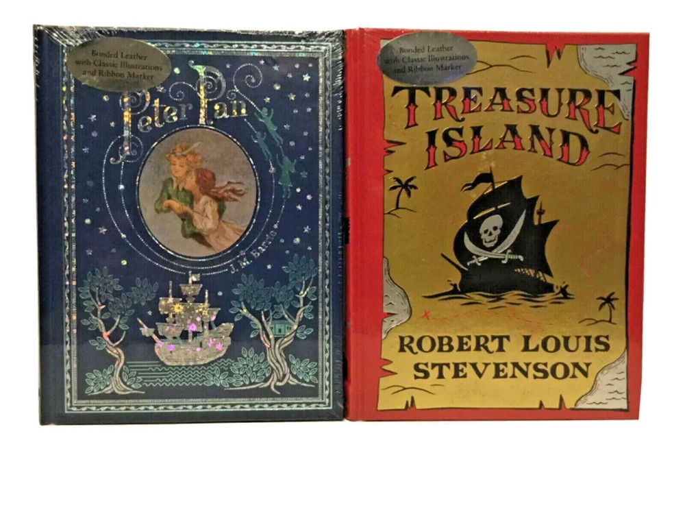 *** Treasure Island *** by Robert Louis Stevenson and *** Peter Pan *** by J.M. Barrie Two Collectible Classics! Brand New, Bonded Leather, Collectible Editions These editions, bound in genuine bonded leather with decorative page edges and ribbon bookmark, are an elegant addition to any home library and make treasured heirlooms. Treasure Island When he attends a dying patron of his family's boarding house, young Jim Hawkins has no idea that the man was once a pirate, or that the man's possessions include a map that will lead whoever has it to the island where the notorious buccaneer, Captain Flint, buried his treasure. Jim and his guardians hire a boat to sail to the island, unaware that crew they have hired includes many members of Flint's pirate band, among them former quartermaster Long John Silver, and that they hope to claim the treasure for their own. The ensuing action-packed adventure established the classic pirate story as it was written for more than a century afterward, and it made the literary reputation of its young author, Robert Louis Stevenson . This exquisite full-color edition features an elegant bonded-leather binding, a ribbon bookmark, distinctive gilded edging, and decorative endpapers. It's a book that will be cherished by readers of all ages. Peter Pan Neverland is home to Peter Pan, a young boy who has never grown up. On one of his visits to London, Peter makes the acquaintance of young Wendy Darling, whom he invites to travel with him to Neverland and become the mother of his gang of Lost Boys. Flying through the night sky to Neverland, Wendy and her brothers John and Michael soon become caught up in marvelous adventures with the Indian Princess Tiger Lily, the loyal fairy Tinker Bell, and Peter's nemesis, the sinister hook-handed pirate known as Captain Hook. Spun by J.M. Barrie from his immensely popular stage play of the same name, Peter Pan is a timeless classic of children's literature. Illustrated with plates by F.D. Bedford, this exquisite full-color edition features an elegant bonded-leather binding, a ribbon bookmark, distinctive gilded edging, and decorative endpapers. It's a book that will be cherished by readers of all ages Send these books as a gift! We ship these items in gift quality condition with no price stickers or other markings. Ships well protected in a cardboard box. Buy with confidence from an established seller - we have over 20 years of eBay sales experience and more than 25,000 ratings! Shipped from a smoke-free, temperature controlled environment To see more great items and Value Packs at terrific prices, please visit our ebay store