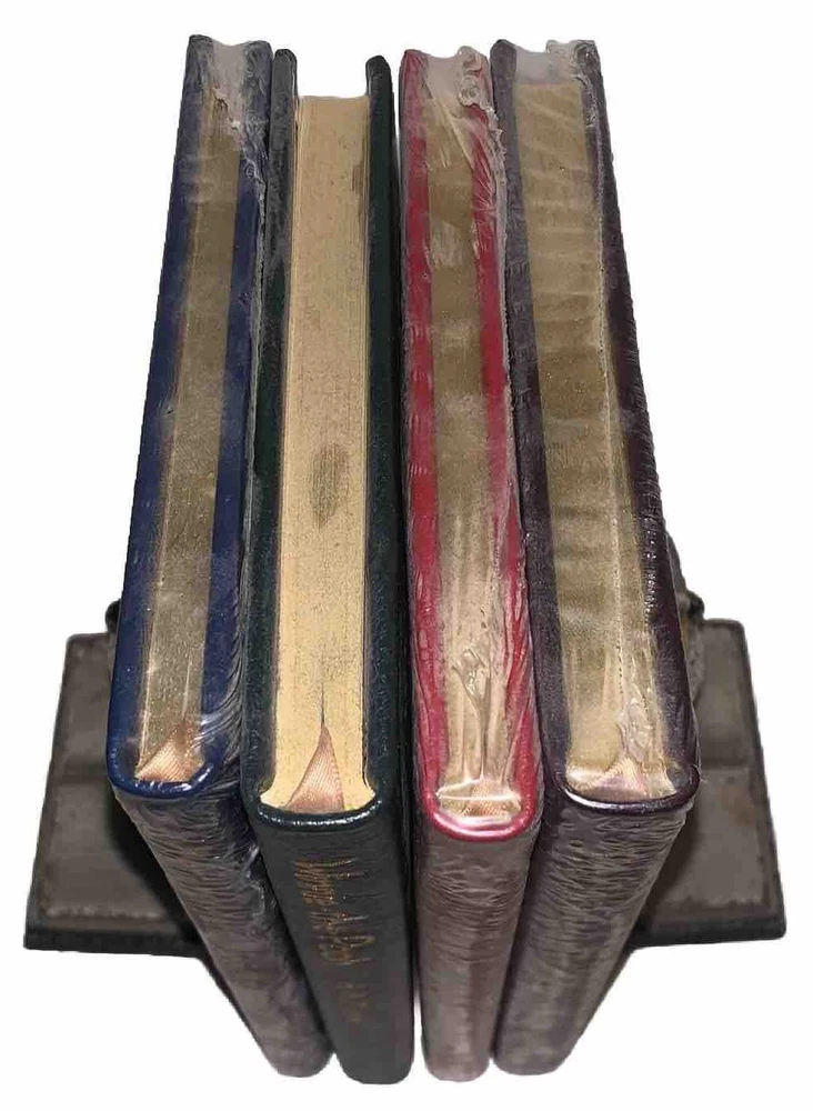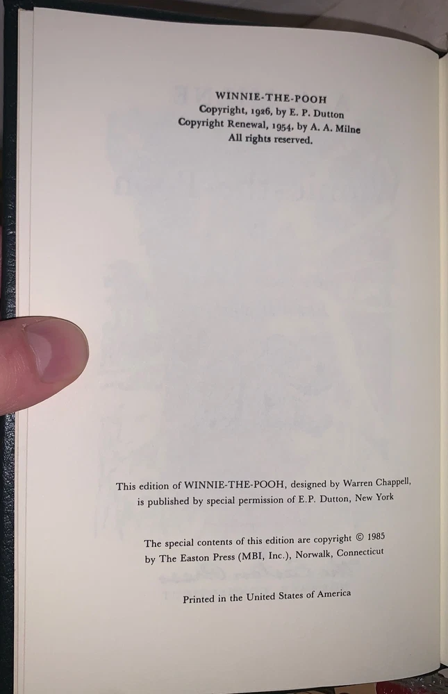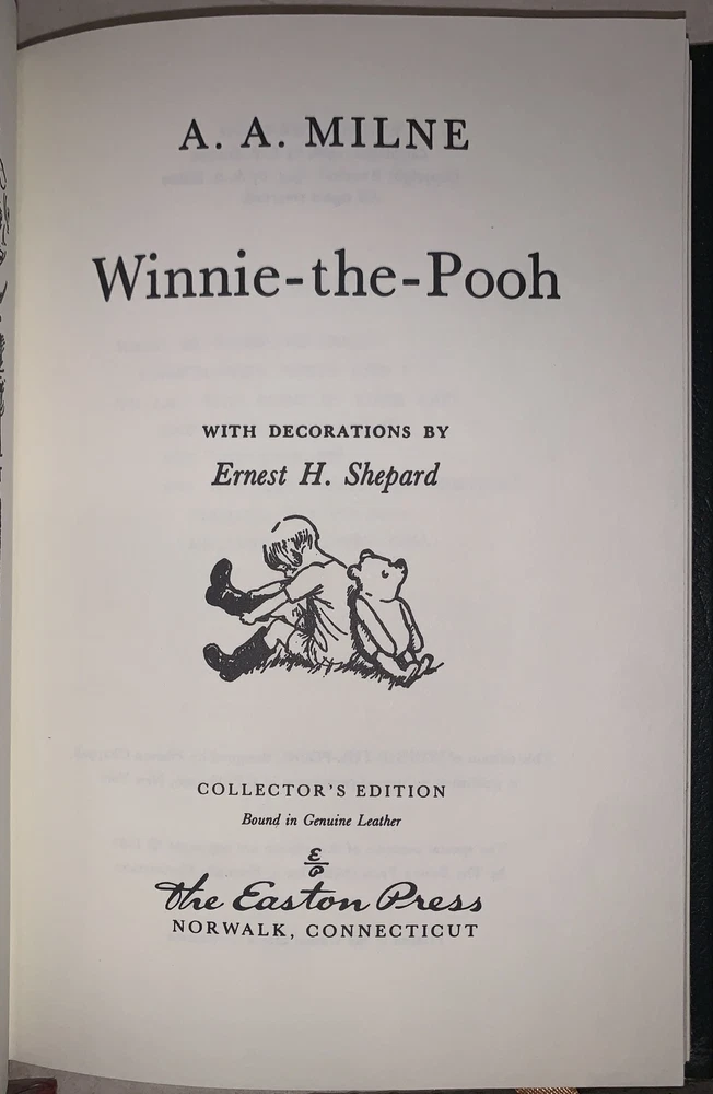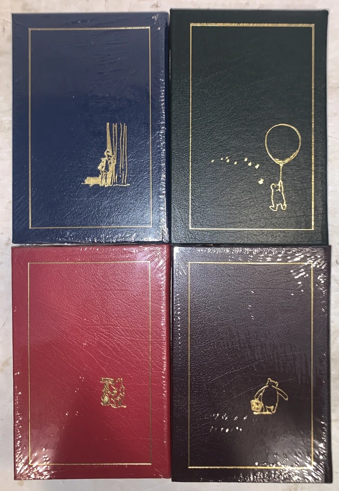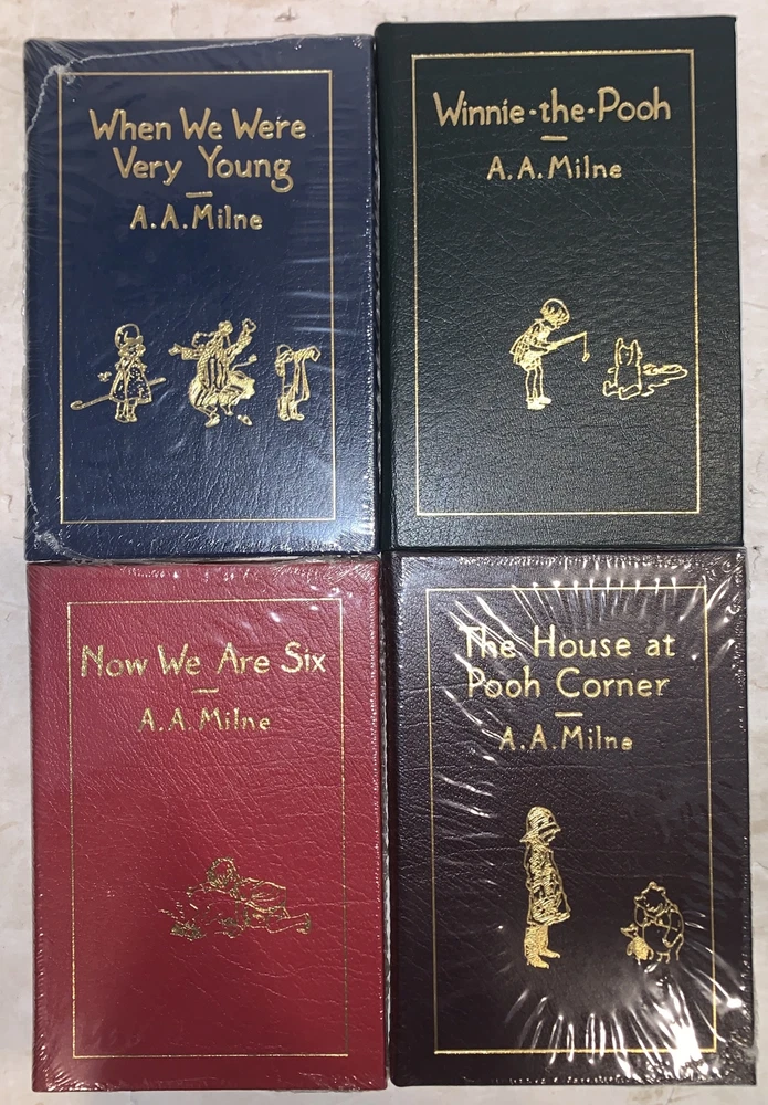 Set of 4 books by A. A. Milne, published by The Easton Press, including Winnie the Pooh. Three of which are still sealed in the publisher's original shrink wrap. 1: When We Were Very Young - by A. A. Milne - Norwalk, Connecticut - The Easton Press - Publisher's original gilt lettered blue leather. All edges gilt. - Still sealed in the publisher's shrink wrap. 2: Winnie-the-Pooh - by A. A. Milne - With decorations by Ernest H. Shepard - Norwalk, Connecticut - The Easton Press - 1985 - Publisher's original gilt lettered black leather. All edges gilt. Illustrated in black and white. - This is the only volume that is not in the publisher's original shrink wrap. 3: Now We Are Six - by A. A. Milne - Norwalk, Connecticut - The Easton Press - Publisher's original gilt lettered red leather. All edges gilt. - Still sealed in the publisher's shrink wrap. 4: The House at Pooh Corner - by A. A. Milne - Norwalk, Connecticut - The Easton Press - Publisher's original gilt lettered brown leather. All edges gilt. - Still sealed in the publisher's shrink wrap. Also included are 4 unused publisher's bookplates. In near fine condition. If you have any questions, feeel free to ask, and don't forget to check out my other listings.