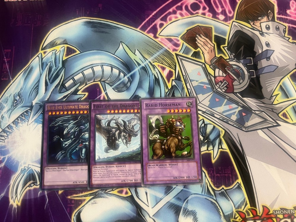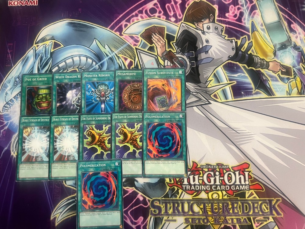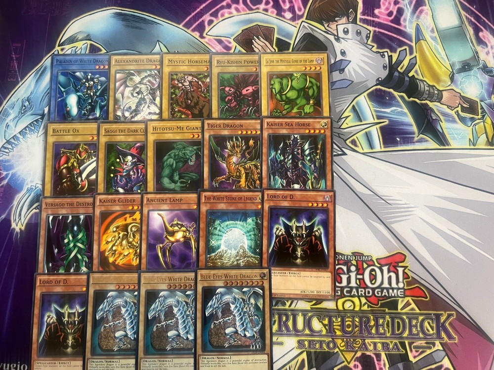Hello! You are purchasing the deck list below, the cards will be English, real, and near mint to light play condition at worst. All decks are built with the lowest rarities for cards in mind to keep the price of the deck low and affordable for all duelists! Some cards may be in speed duel printing if this is the cheapest available copy of the card, but do not worry these are real cards and legal for tournament use! Purchase with confidence and safety! As an added bonus one pack of card sleeves will be included with your deck! Thanks again and good luck dueling! Now here's the decklist; Monsters: 1| Paladin of White Dragon 1| La Jinn The Mystical Genie of the Lamp 1| Ryu-Kishin Powered 1| Mystic Horseman 1| Alexandrite Dragon 1| Kaiser Sea Horse 1| Tiger Dragon 1| Hitotsu-Me Giant 1| Saggi The Dark Clown 1| Battle Ox 1| The White Stone of Legend 1| Ancient Lamp 1| Kaiser Glider 1| Versago The Destroyer 2| Lord of D. 3| Blue-Eyes White Dragon Spells; 1| Fusion Substitute 1| Megamorph 1| Monster Reborn 1| White Dragon Ritual 1| Pot of Greed 2| Polymerization 2| The Flute of Summoning Dragon 2| Burst Stream of Destruction Traps; 1| Crush Card Virus 1| Cloning 2| Call of the Haunted 2| Negate Attack 2| Final Attack Orders 2| Shadow Spell Extra Deck: 1| First of the Dragons 1| Rabid Horseman 1| Blue-Eyes Ultimate Dragon