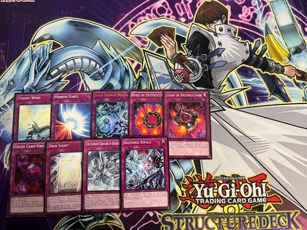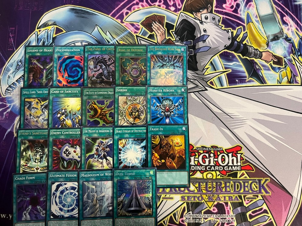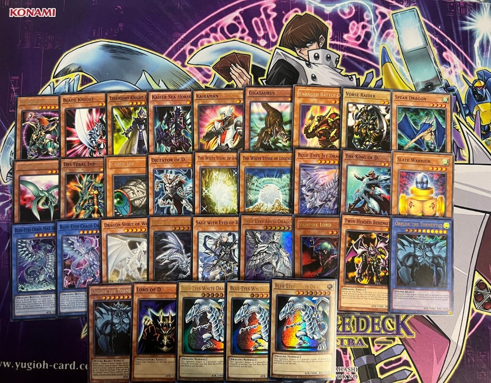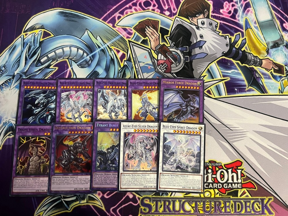 Hello! You are purchasing the deck list below, the cards will be English, real, and near mint to light play condition at worst. All decks are built with the lowest rarities for cards in mind to keep the price of the deck low and affordable for all duelists! Some cards may be in speed duel printing if this is the cheapest available copy of the card, but do not worry these are real cards and legal for tournament use! Purchase with confidence and safety! As an added bonus one pack of card sleeves will be included with your deck! Thanks again and good luck dueling! Now here's the decklist; Monsters: 1| Chaos Emperor Dragon - Envoy of the End 1| Spear Dragon 1| Vorse Raider 1| Enraged Battle Ox 1| Gilasaurus 1| Kaibaman 1| Kaiser Sea Horse 1| Legendary Knight Critias 1| Blade Knight 1| Slate Warrior 1| The King of D. 1| Blue-Eyes Jet Dragon 1| The White Stone of Legend 1| The White Stone of Ancients 1| Dictator of D. 1| Cyber Jar 1| Des Feral Imp 1| Different Dimension Dragon 1| Twin-Headed Behemoth 1| Vampire Lord 1| Blue-Eyes Abyss Dragon 1| Sage with Eyes of Blue 1| Blue-Eyes Alternative White Dragon 1| Dragon Spirit of White 1| Blue-Eyes Chaos Dragon 1| Blue-Eyes Chaos MAX Dragon 1| Lord of D. 1| Obelisk The Tormentor 1| Obelisk The Tormentor ( Free Non-Tournament Legal Copy) 3| Blue-Eyes White Dragon Spells; 1| Duel Tower 1| Mausoleum of White 1| Ultimate Fusion 1| Chaos Form 1| Trade-In 1| Burst Stream of Destruction 1| The Melody of Awakening Dragon 1| Enemy Controller 1| Fiend's Sanctuary 1| Monster Reborn 1| Shrink 1| The Flute of Summoning Dragon 1| Card of Sanctity 1| Spell Card "Soul Exchange" 1| The Breaking Ruin God 1| Ring of Defense 1| The Fang of Critias 1| Polymerization 1| Legend of Heart Traps; 1| Destined Rivals 1| The Ultimate Creature of Destruction 1| True Light 1| Crush Card Virus 1| Loop of Destruction 1| Ring of Destruction 1| Soul Energy MAX!!! 1| Mirror Force 1| Tyrant Wing Extra Deck: 1| Blue-Eyes Spirit Dragon 1| Azure-Eyes Silver Dragon 1| Tyrant Burst Dragon 1| Destruction Dragon 1| Doom Virus Dragon 1| Mirror Force Dragon 1| Blue-Eyes Tyrant Dragon 1| Blue-Eyes Twin Burst Dragon 1| Neo-Blues Ultimate Dragon 1| Blue-Eyes Ultimate Dragon