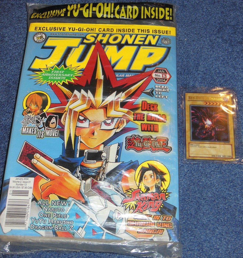 SHONEN JUMP #13~RED EYES B DRAGON CARD~VIZ~2004~MANGA~ONE PIECE~DRAGONBALL Z This auction is for magazine SHONEN JUMP #13 ! Produced by VIZ Publications in 2004. The highly sought after first anniversary issue was never distributed and is for sale now for the very first time! It is complete with the rare and exclusive RED EYES B DRAGON card. It is in Near Mint condition. The bottom original plastic bag was opened to reveal the card in Near Mint condition. Incredible manga stories of One Piece, Dragonball Z, Sandland, Yu-Gi-Oh and YuYu Hakusho. If you are a devoted fan or serious collector of manga and rare Japanese comics, this SHONEN JUMP #13 with Red Eyes B Dragon card is a must for your collection! Payment may be made in US funds and MUST be received within 3 days from end of auction. STRICTLY ENFORCED! ($ 15.50 = Secure Priority mail domestic USA tracking confirmation!)