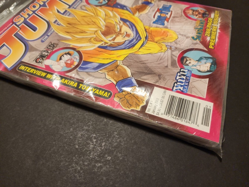 UP FOR AUCTION IS: SHONEN JUMP Vol.1 #1(1st PRINT)!!!! (SEALED/NEVER OPENED OR READ. STORED SINCE PURCHASED BACK IN 2003)!!!! (CONTAINS THE ULTRA-RARE BLUE-EYES WHITE DRAGON PROMO CARD(JMP-001)!!!! ________ DATED 1/03!!!! ________ CONTAINS STORIES FROM ONE PIECE, YU-GI-OH!, DRAGONBALL-Z, YU-YU HAKUSHO AND MORE!!!! ________ THIS ISSUE IS EXTREMELY HARD-TO-FINE IN ULTRA-HIGH GRADES; AND ESPECIALLY DIFFICULT TO FIND SEALED WITH THE PROMO CARD INTACT !!!! ________ SO, FOR YOU FANS OF SHONEN JUMP...FOR YOU FANS OF ULTRA-RARE SEALED MAGAZINES/OE ULTRA-RARE PROMO CARDS...THIS IS THE MAGAZINE FOR YOU!!!! ________ THIS RAW MAGAZINE IS IN OUTSTANDING CONDITION(*REALLY A GORGEOUSLY STUNNING COPY. CHERRY-PICKED WHEN PURCHASED BY ME, AND STORED UP UNTIL NOW. GIVEN THE WHITE GLOVE TREATMENT)!!!! (*I UNDERSTAND THAT GRADING IS SUBJECTIVE, SO PLEASE VIEW THE MANY PICTURES THAT I HAVE ADDED TO THIS AUCTION, AS THEY PRETTY MUCH POINT OUT MOST OF THE FLAWS THAT THIS BOOK MAY HAVE; THIS WAY, YOU CAN JUDGE FOR YOURSELVES THE SPECIFIC GRADE FOR THIS PARTICULAR MAGAZINE) !!!! ________ SHONEN JUMP Vol.1 #1(1st PRINT)!!!! (SEALED/NEVER OPENED OR READ. STORED SINCE PURCHASED BACK IN 2003)!!!! (CONTAINS THE ULTRA-RARE BLUE-EYES WHITE DRAGON PROMO CARD(JMP-001)!!!! ________ DATED 1/03!!!! ________ THE MAGAZINE WILL BE WELL PACKAGED AND BOXED(NEVER IN AN ENVELOPE) FOR PROTECTION!!!! ________ PLEASE CHECK OUT MY ABOUT ME PAGE FOR PERSONAL INFO AND SHIPPING STANDARDS, AND MUCH MORE; I TRY EXTREMELY HARD TO MAKE BUYING FROM ME A PLEASANT EXPERIENCE, AND I WOULD GREATLY APPRECIATE YOUR FIVE STAR FEEDBACK!!!! ________ GOOD LUCK AND HAPPY BIDDING!!!! ____ ____ I WILL COMBINE SHIPPING ON ITEMS(UNFORTUNATELY, I CANNOT COMBINE SHIPPING ON GRADED AND UNGRADED ITEMS DUE TO THE FRAGILE NATURE OF CGC GRADED COMIC CASES; I.E., I CAN ONLY COMBINE UNGRADED ITEMS WITH UNGRADED, AND GRADED ITEMS WITH GRADED); SO IF YOU PURCHASE MORE THAN ONE OF MY AUCTIONS, PLEASE WAIT FOR ME TO SEND AN UPDATED INVOICE WITH COMBINED SHIPPING TOTALS!!!! ________ ALSO BE AWARE THAT I AM USING THE E-BAY SHIPPING CALCULATOR FOR THIS AUCTION, BASED ON A 2-LB PACKAGE; ALL PRICES ARE BASED UPON WEIGHT, AND THE REGION THAT YOU LIVE IN. ALL PRICES INCLUDE DELIVERY CONFIRMATION!!!! ________ ALL PAYMENTS ARE TO BE RECEIVED WITHIN 7-DAYS OF AUCTION CLOSE!! IF THERE IS OR WILL BE SOME KIND OF DELAY IN YOUR PAYMENT, I NEED TO BE CONTACTED WITHIN 24-HOURS, THIS WAY WE CAN WORK SOMETHING OUT!! ALSO, IT IS YOUR RESPONSIBILITY TO MAKE SURE THAT THE ADDRESS THAT YOU HAVE ON FILE IS KEPT CURRENT AND/OR UP TO DATE THROUGH E- BAY AND/ OR THROUGH PAYPAL, AND IS THE ONE THAT YOUR PACKAGE WILL BE SENT TO, AS THIS WILL ELIMINATE ANY ISSUES OR PROBLEMS WITH DELIVERY; AS ONCE YOUR ITEM LEAVES MY HANDS, THEY ARE IN THE HANDS OF THE UNITED STATES POSTAL SERVICE, AND THEY ARE SHIPPED TO THE ADDRESS THAT YOU HAVE ON FILE, SO PLEASE MAKE SURE THAT YOUR ADDRESS IS CORRECT!! I TRY TO MAKE SURE YOUR ITEMS ARE PACKAGED VERY SECURELY, AND I ALSO TRY AND SHIP ALL ITEMS WITHIN 24-HOURS OF RECEIVING PAYMENT.(CHECK OUT MY ABOUT ME PAGE FOR MORE)!! ALSO UNDERSTAND THAT AS QUICKLY AS I SHIP ALL OF MY ITEMS, I AM NOT RESPONSIBLE FOR TRANSIT TIMES; ONCE YOUR PACKAGE LEAVES MY HANDS, THAT IS IN THE HANDS OF THE USPS!! THANKS FOR PARTICIPATING IN MY AUCTION!!!! I WILL SHIP TO THE UNITED STATES ONLY!!!!