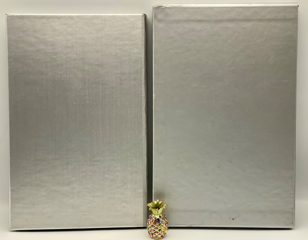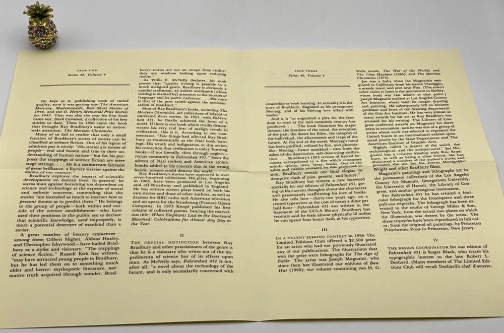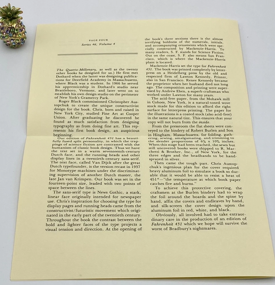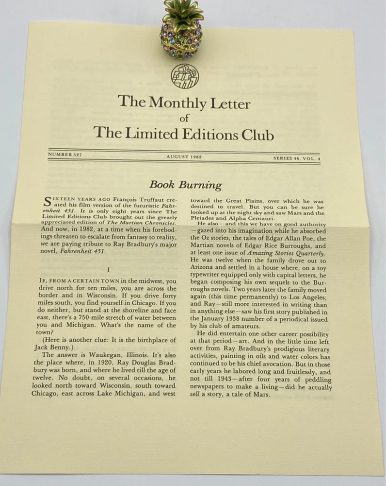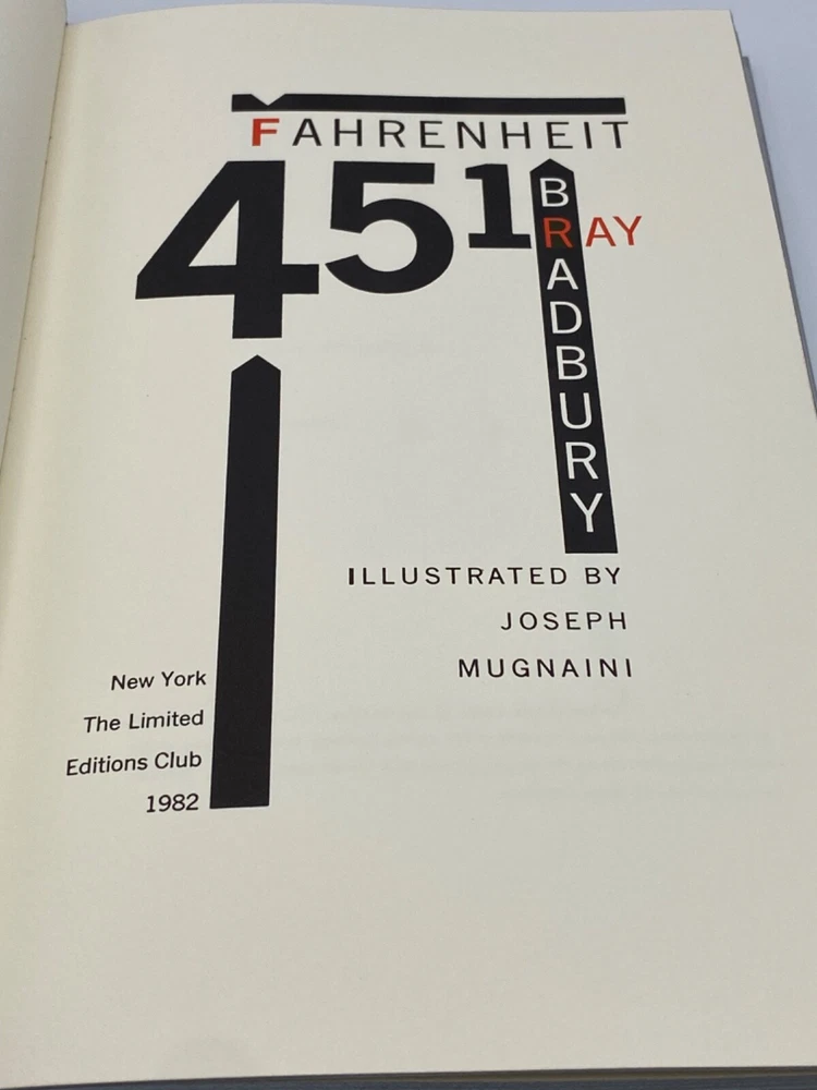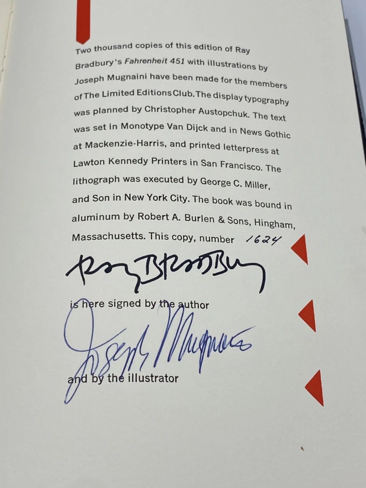 MAKES THE PERFECT GIFT FOR ANY FAN OF FANTASY / SCIENCE FICTION / RAY BRADBURY / ARTWORK OF MUGNAINI ** PLEASE READ : Mahalo for taking the time to look at our listing. We truly appreciate it. We always do our BEST to give you the most accurate description of these beautiful books. If, however, you have any SPECIFIC questions about the SIZE of the book, NUMBER of pages, TYPE of leather, SMELL or FEEL of the book, PLEASE email us through EBay’s mail system BEFORE you bid, and we will be HAPPY to give you more information. We want you to be completely happy with your purchase and keep you as our customers for years to come!** DESCRIPTION: Limited Editions Club ALUMINUM BINDING of Bradbury’s Masterpiece, LONG OUT OF PRINT edition of FAHRENHEIT 451, personally SIGNED 🖊️ by BRADBURY & ILLUSTRATOR MUGNAINI. THIS IS A SCARCE, ONE OF THE MOST DIFFICULT TO FIND HEIRLOOM LIMITED EDITIONS CLUB EDITIONS with LAVISH IMPRESSIONS TO THE BOARDS AND SPINE and GORGEOUS FULL-COLOR FOLD-OUT ILLUSTRATIONS by JOSEPH MUGNAINI . IT IS ONE OF THE MOST HIGHLY-PRIZED EDITIONS OF THIS GREAT SCI-FI CLASSIC. THE ORIGINAL COLLECTOR’S NOTES ARE INCLUDED. 🍍 NOT INCLUDED… 😃 The Limited Editions Club of New York was started in 1929 by George Macy. At 29-years-old, he was an avid reader who wanted to make his living from books. His business revolved around publishing beautifully illustrated classic titles in relatively small quantities with club members paying a subscription. Today, the Limited Editions Club (LEC) is an important part of the rare book business and the books are adored by collectors. From 1929 to 1985, the Limited Editions Club published 548 titles. George passed away in 1956 but his widow, Helen, ran the company until the early 1970s when she retired and sold to Boise Cascade who sold the firm again in 1978. The Limited Editions Club is famous for original illustrations by the best book illustrators and artists. Between 1929 and 1985, 10 to 12 titles featuring 1,500 numbered copies each were published annually although the print run expanded to 2,000 numbered copies in later years. Each title was unique, using special papers, special cover material including many in leather, almost all came in a slipcase or clamshell box, many of the titles were already regarded as classics and produced by private small presses throughout the world, almost all were signed by either the illustrator, author, publisher or designer. Sometimes three signatures can be found on the colophon page. During the depression years, many of the world’s greatest artists struggled to find regular work and a large number were employed by Macy. ABOUT THE BOOK: Over Sixty years after its original publication, Ray Bradbury’s internationally acclaimed novel Fahrenheit 451 stands as a classic of world literature set in a bleak, dystopian future. Today its message has grown more relevant than ever before. Guy Montag is a fireman. His job is to destroy the most illegal of commodities, the printed book, along with the houses in which they are hidden. Montag never questions the destruction and ruin his actions produce, returning each day to his bland life and wife, Mildred, who spends all day with her television “family.” But when he meets an eccentric young neighbor, Clarisse, who introduces him to a past where people didn’t live in fear and to a present where one sees the world through the ideas in books instead of the mindless chatter of television, Montag begins to question everything he has ever known. Illustrated by Joseph Mugnaini. Foreword by Ray Bradbury. Signed on colophon by Bradbury and Mugnaini. Frontispiece is a full-page original lithograph 3 double- page color plates. Printed letterpress on acid-free paper. Black endpapers. Bound in full decorated aluminum that was wrapped around the boards by hand with the cover design silkscreened upon the aluminum foil in red, white, and black. All page edges silver. Silver slipcase with edge title. No. 783 of 2000 152 pages ABOUT THE ILLUSTRATOR: Joseph Anthony Mugnaini was an Italian-born American artist and illustrator. He is best known for his collaborations with writer Ray Bradbury, beginning in 1952. He died in 1992. CONDITION: Book is in l IMPECCABLE condition for its age with only a few of the normal minor rubs to the ALUMINUM boards and spine. Slipcase is in amazing condition with only very minor superficial rubs (SEE PICS FOR BETTER DETAILS). NO ATTACHED BOOKPLATES, WRITING FROM PREVIOUS. It is an AMAZING edition! SHIPPING: FREE TO US ADDRESSES ONLY. INTERNATIONAL $ based on location. WE SHIP PRIORITY MAIL & PACK VERY WELL. Please check out our other listings of Easton Press, Franklin Library, Limited Editions Club, Folio Society, International Collectors Library, Heritage Press and First Edition Library editions. WE DO COMBINE SHIPPING IF YOU PURCHASE MORE THAN ONE COPY. Mahalo for looking at our listings! By bidding/purchasing this item, you are helping a very grateful family who sends you our WARMEST ALOHA & MAHALO!