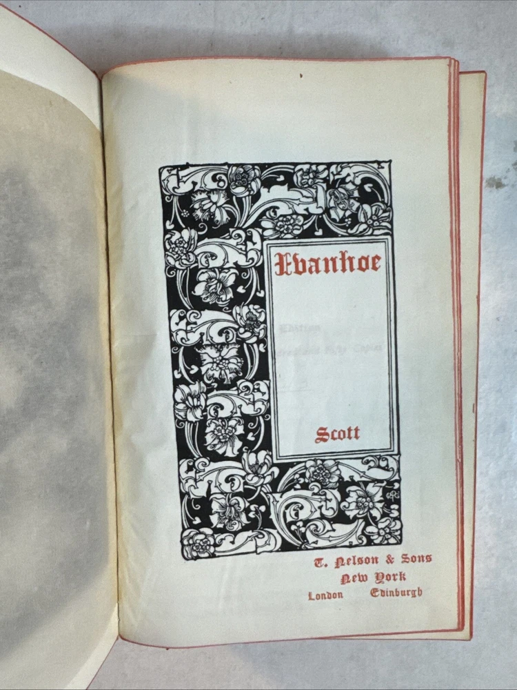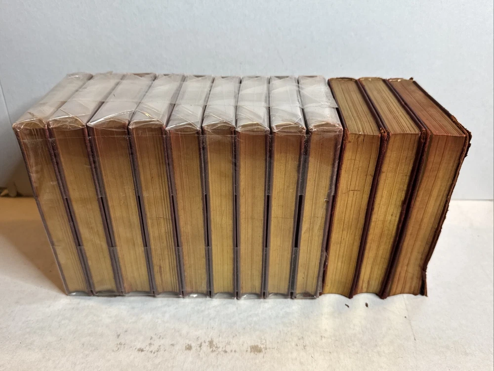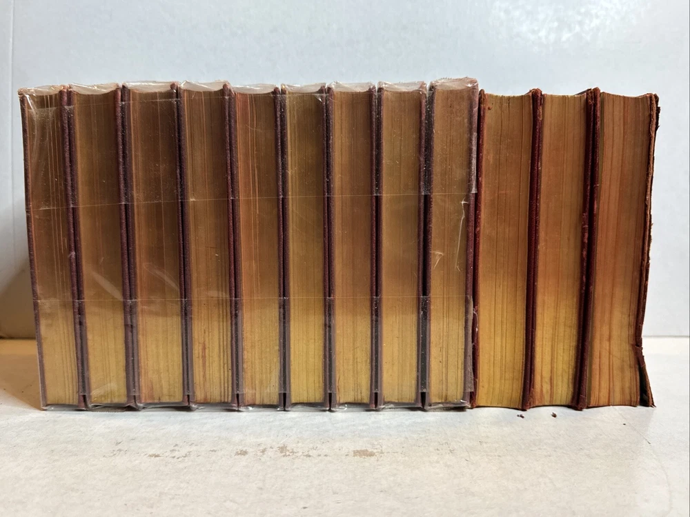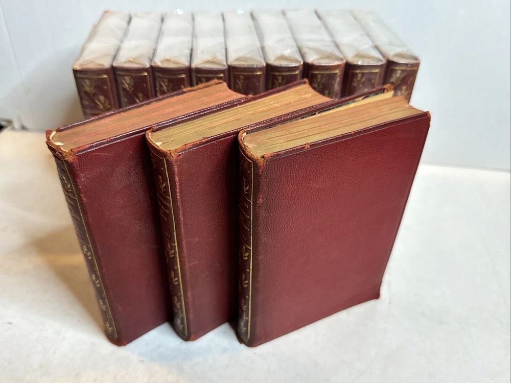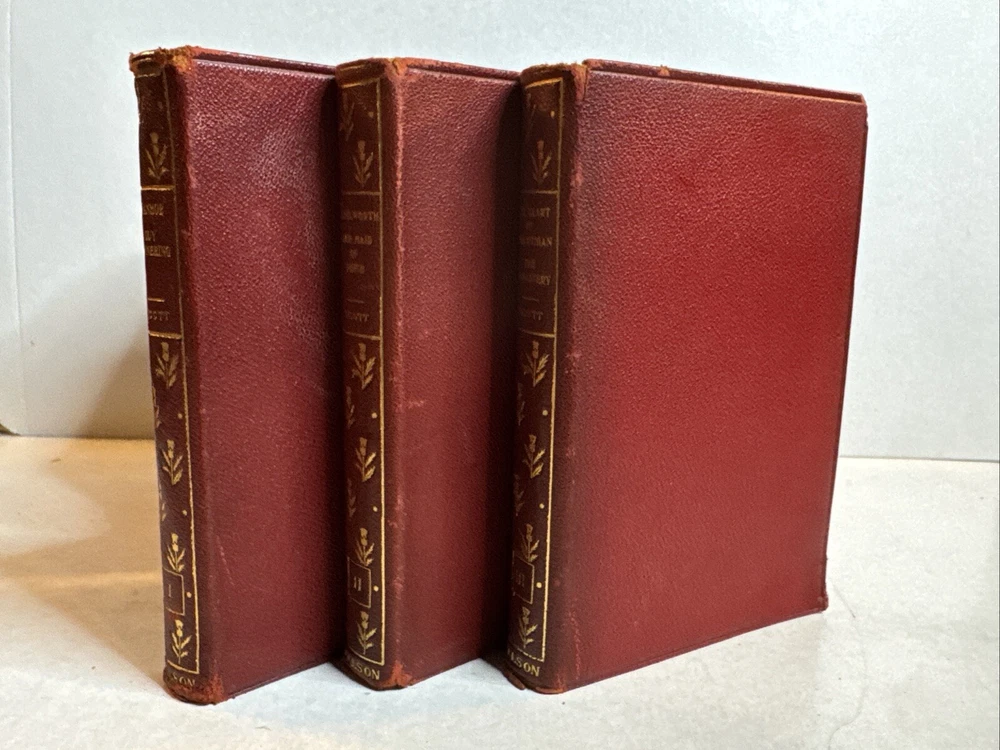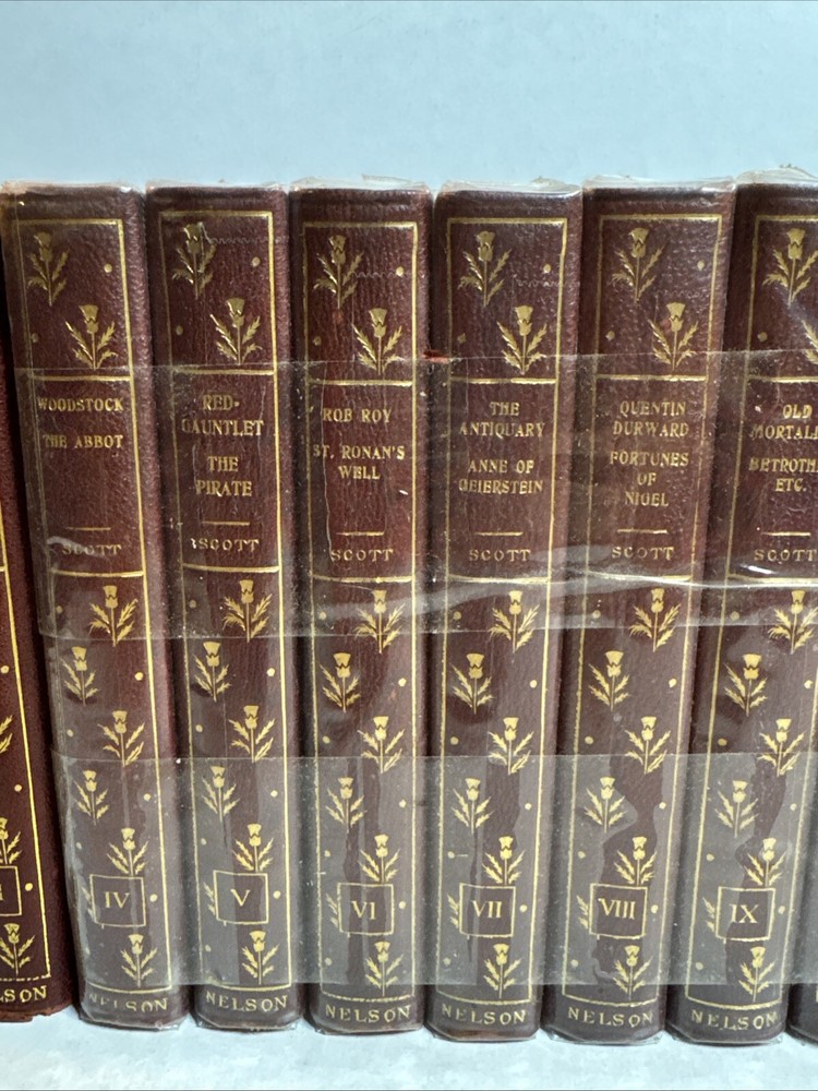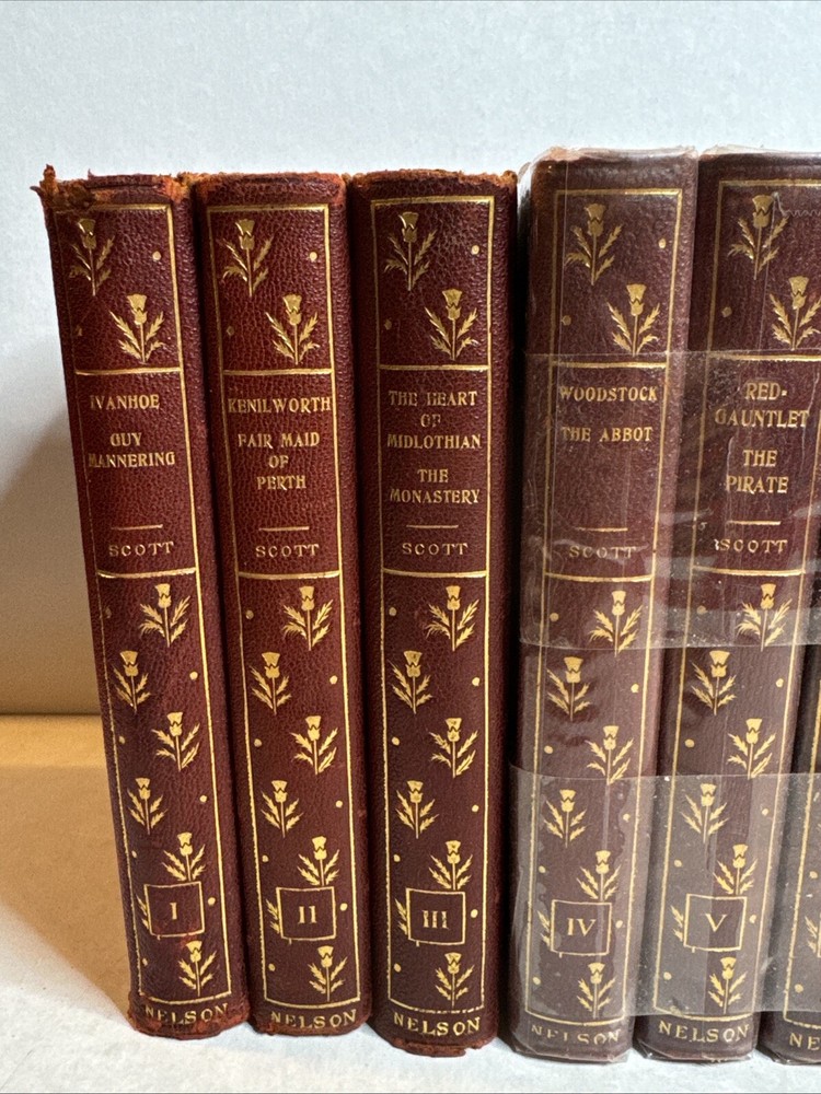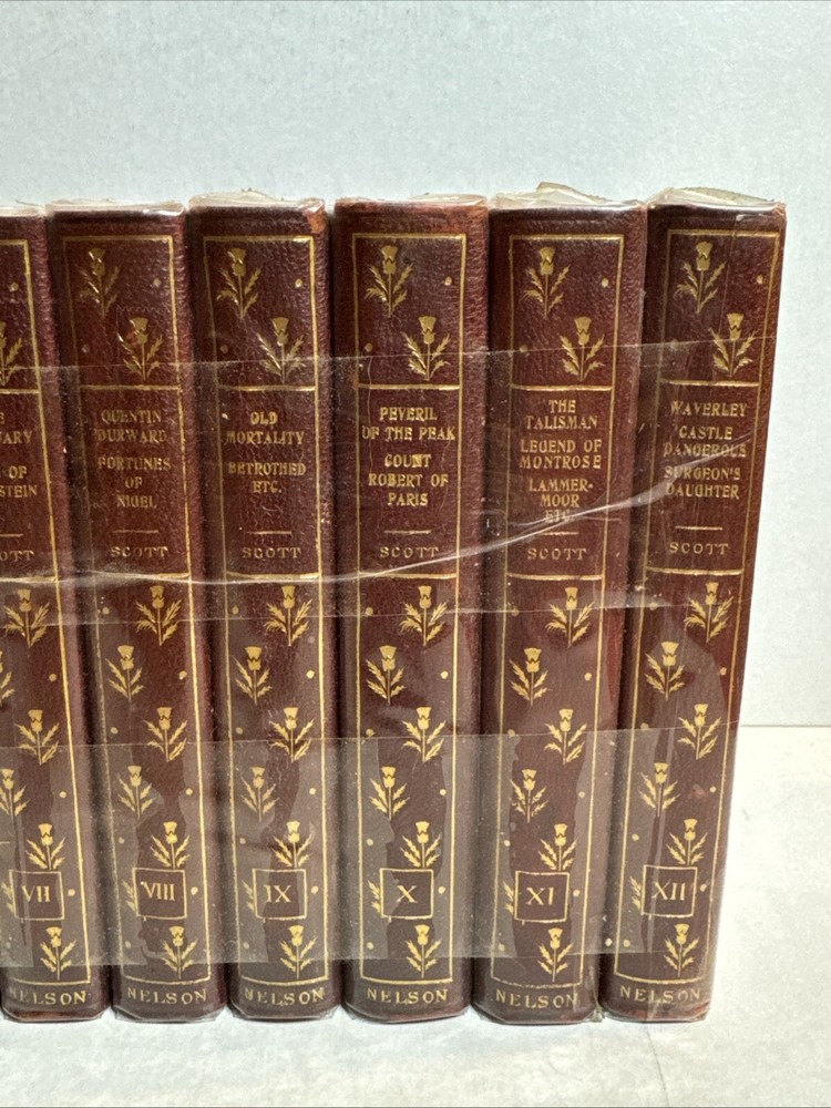 This is a collectible set of 12 leather-bound books written by Sir Walter Scott. The set includes volumes 1-12 and was originally published by Nelson & Sons in London and New York around 1900. The books are in their original state and are not facsimiles. Each book contains stories and adventures written by Sir Walter Scott, a famous author of his time.