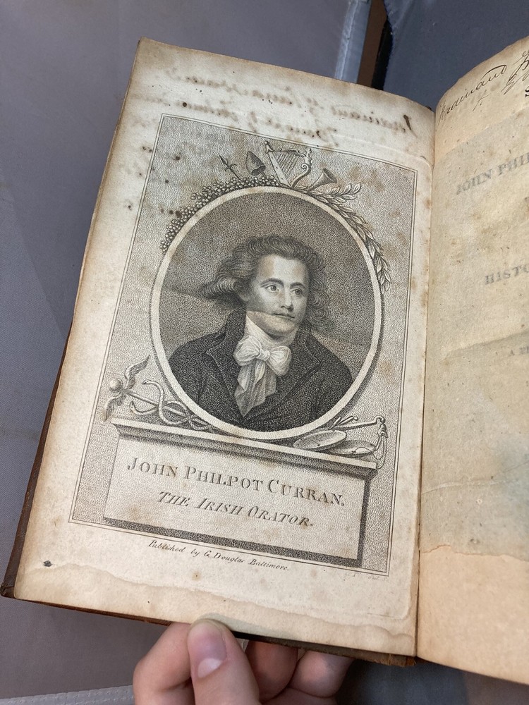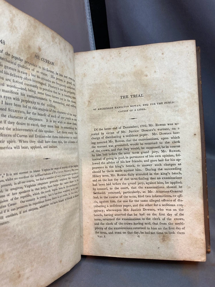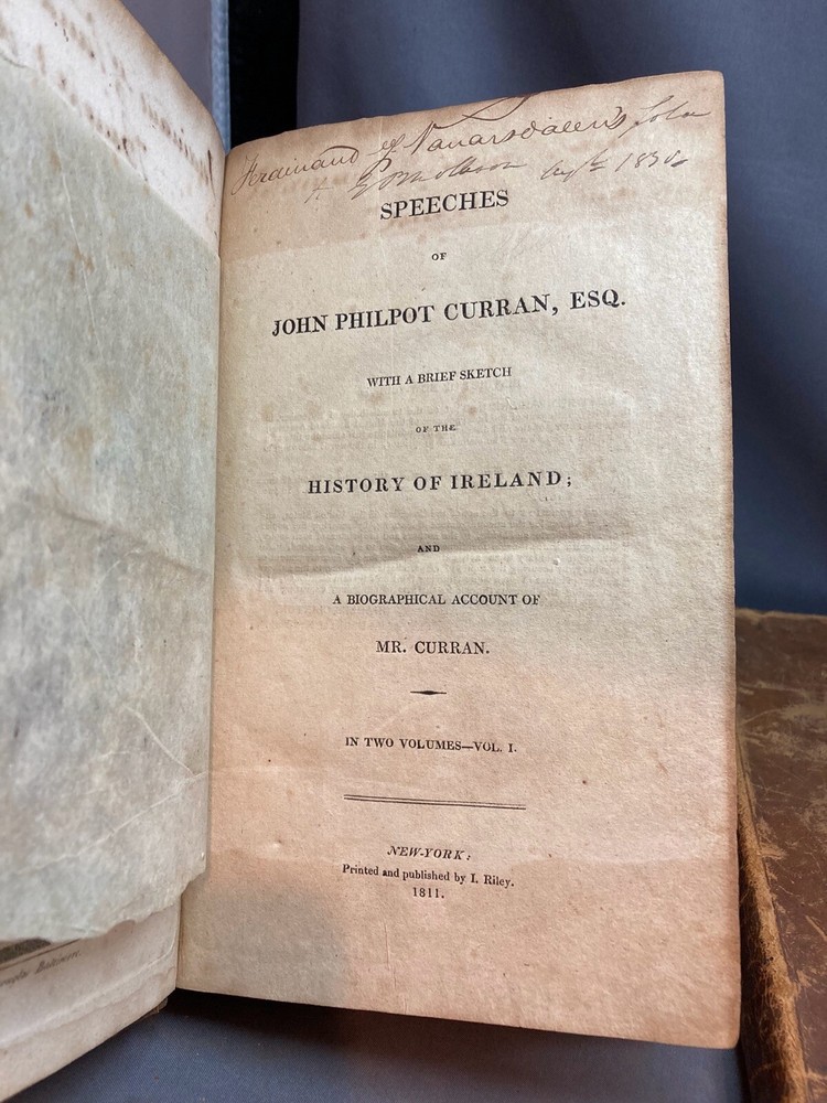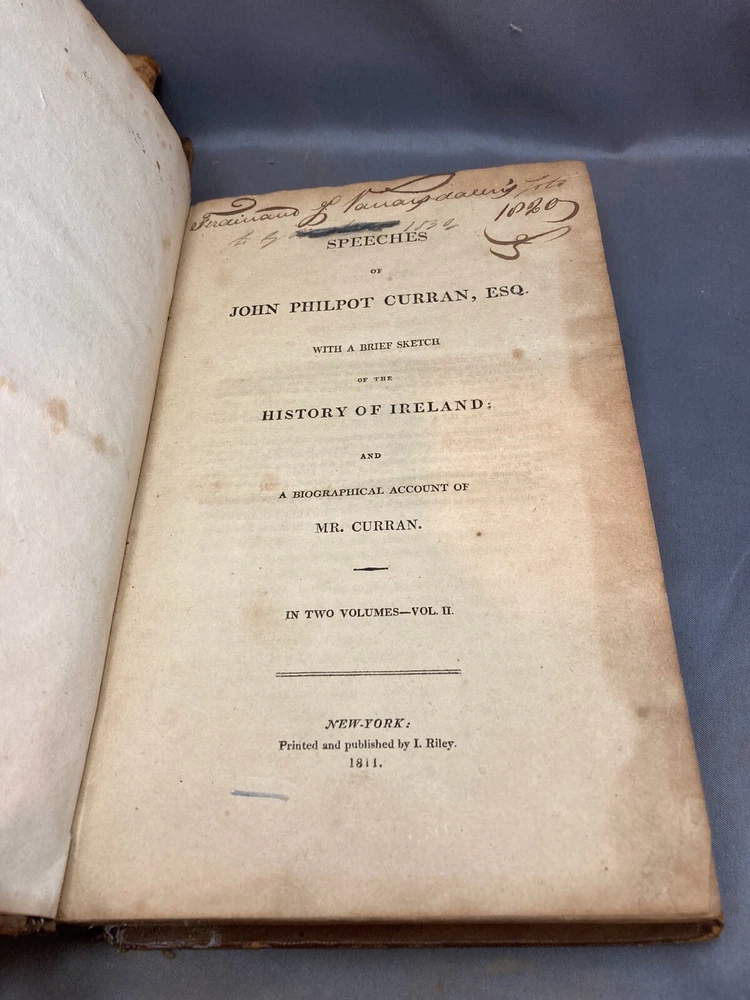 SPEECHES OF JOHN PHILPOT CURRAN (1811) 2 VOL. COMPLETE SET Title: Speeches of John Philpot Curran, with a Brief Sketch of the History of Ireland; and a Biographical Account of Mr. Curran Author: John Philpot Curran Date: 1811 Publisher: I. Riley Size: Both volumes are 5 1/2’’ x 9 1/2'' Condition: GOOD. Leather bindings are fully intact. Wear to the covers and spines. Vol. 2 has some engraved damage to the cover (see photos). Gilt lettering on spines. Both spines are taut and unbroken. Bumped corners and edgewear, consistent with age. Light browning of pages and foxing/ staining from age. Vol. 1 has 340 pages and vol. 2 has 331 pages. Notes: First volume has frontispiece of Curran. Please ask questions before bidding or purchasing! Check my Ebay store for more antique and collectible books, ephemera, vintage magazines, and other paper products. I also have a wide range of fine china, crystal, silverplate and sterling silver. If there's something that you want me to look for send an email and I'll look for those special items too. _gsrx_vers_1292 (GS 8.3.6 (1292))