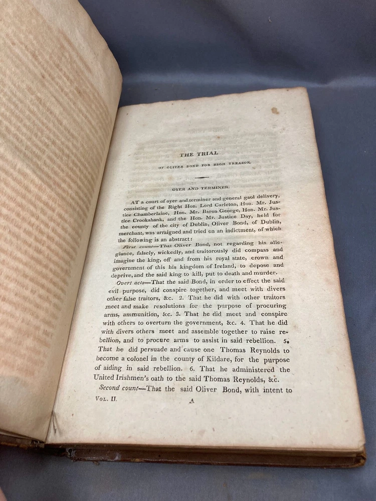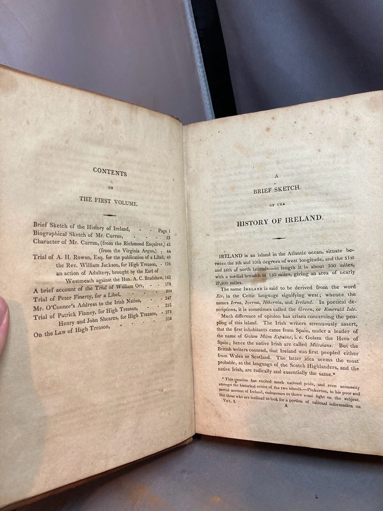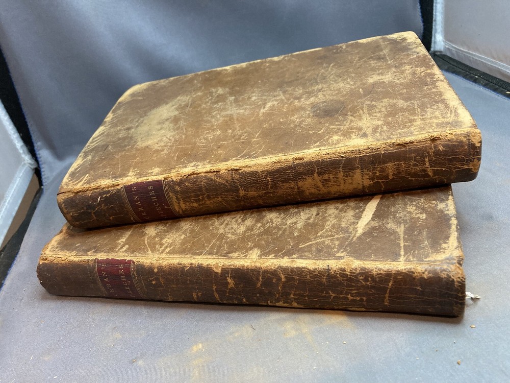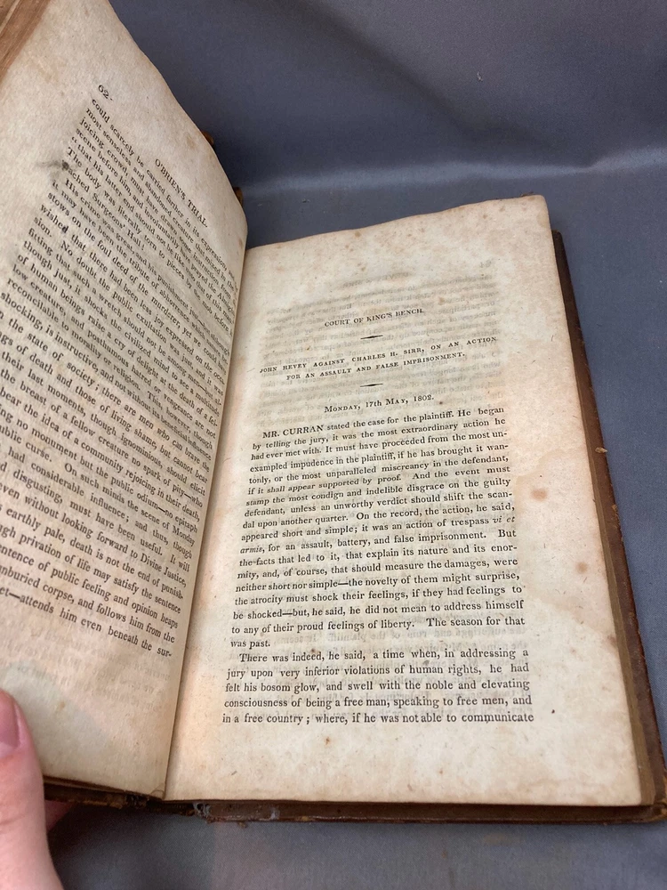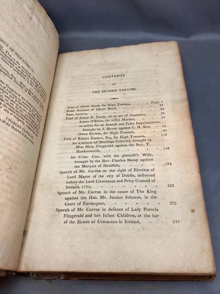 SPEECHES OF JOHN PHILPOT CURRAN (1811) 2 VOL. COMPLETE SET Title: Speeches of John Philpot Curran, with a Brief Sketch of the History of Ireland; and a Biographical Account of Mr. Curran Author: John Philpot Curran Date: 1811 Publisher: I. Riley Size: Both volumes are 5 1/2’’ x 9 1/2'' Condition: GOOD. Leather bindings are fully intact. Wear to the covers and spines. Vol. 2 has some engraved damage to the cover (see photos). Gilt lettering on spines. Both spines are taut and unbroken. Bumped corners and edgewear, consistent with age. Light browning of pages and foxing/ staining from age. Vol. 1 has 340 pages and vol. 2 has 331 pages. Notes: First volume has frontispiece of Curran. Please ask questions before bidding or purchasing! Check my Ebay store for more antique and collectible books, ephemera, vintage magazines, and other paper products. I also have a wide range of fine china, crystal, silverplate and sterling silver. If there's something that you want me to look for send an email and I'll look for those special items too. _gsrx_vers_1292 (GS 8.3.6 (1292))