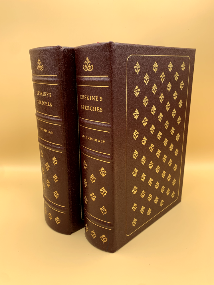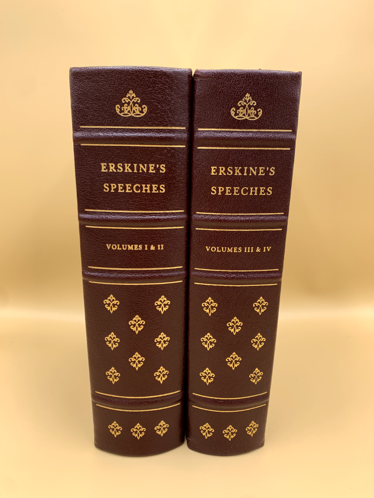 4 Volumes of Erskine's Speeches in 2 Leather bound books. Like New. Spines are unbroken. Excellent edges and corners. Very light scuffing on some gold leaf pages. Part of the Legal Classics Library.