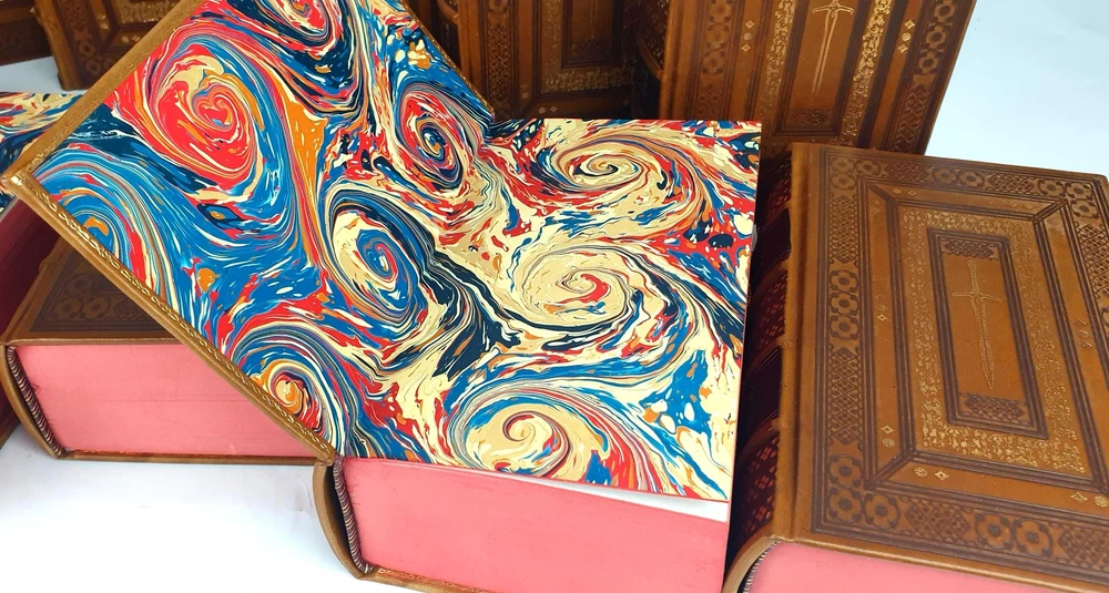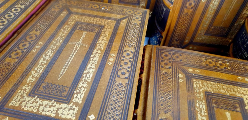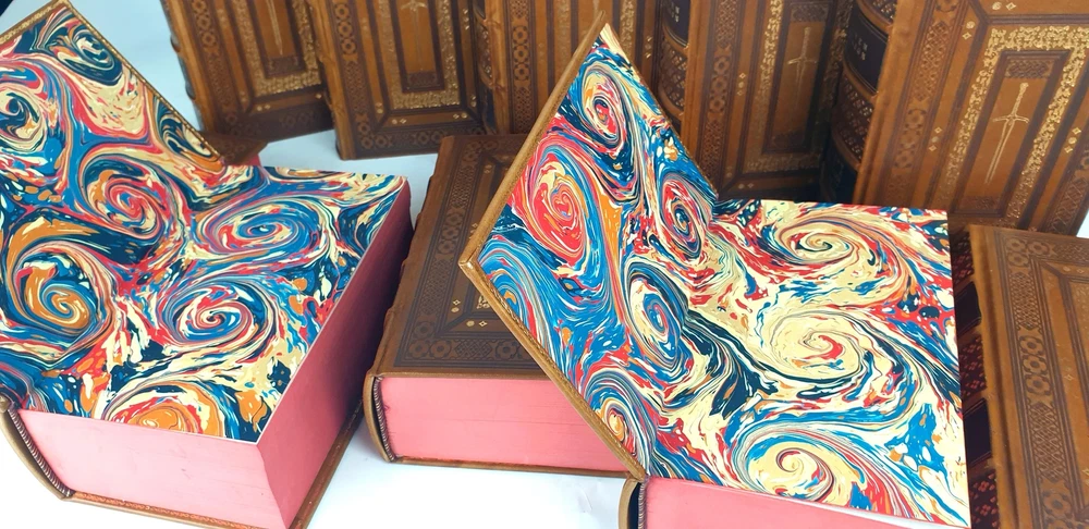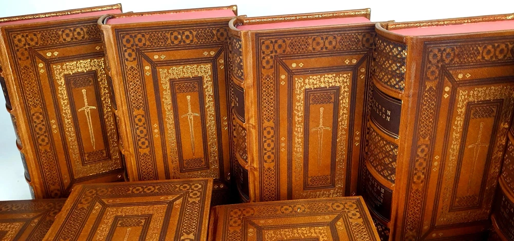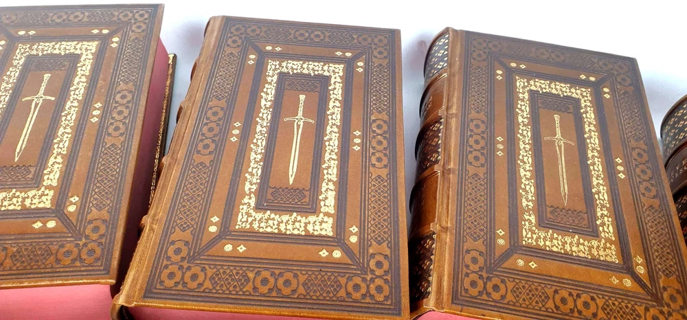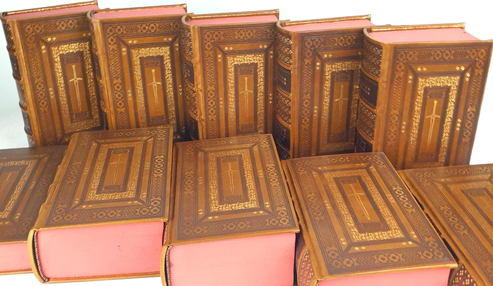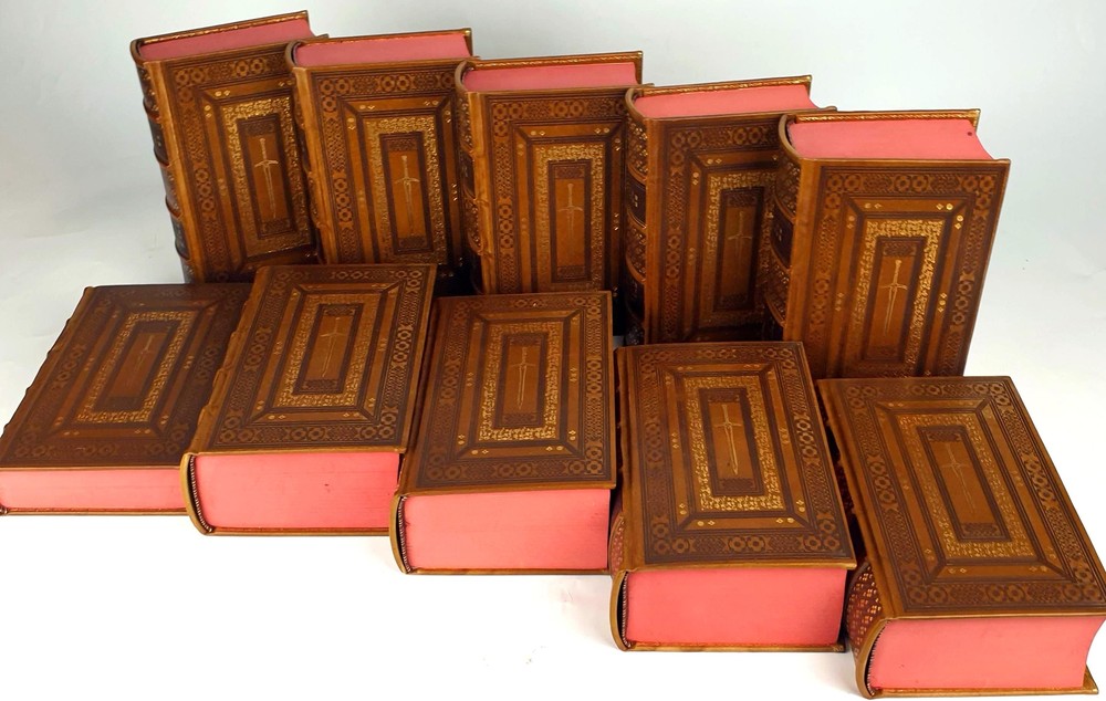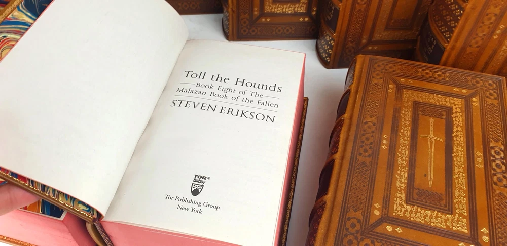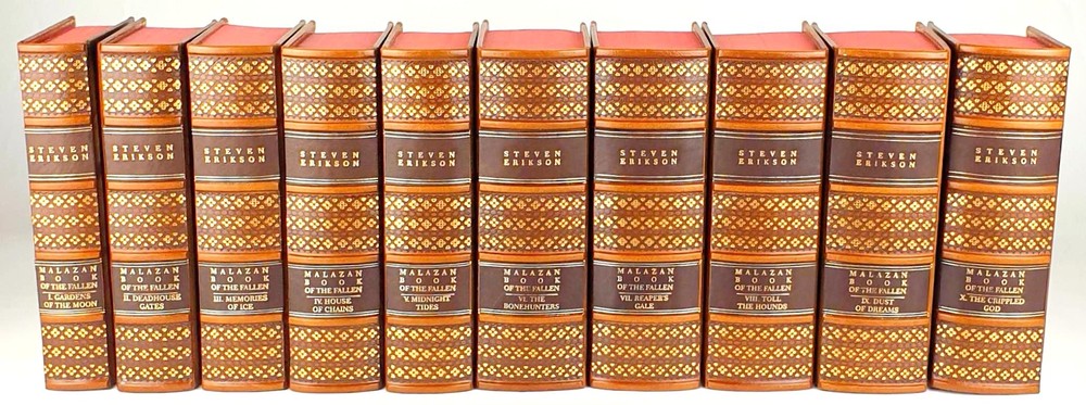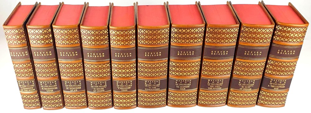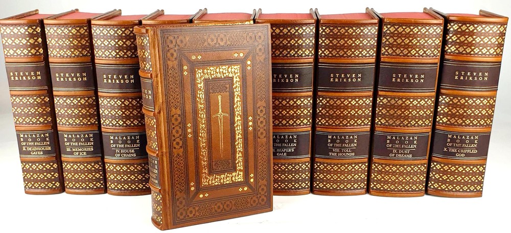 Antykwariat Sobieski/ Sobieski Antiquarian Bookstore presents STEVEN ERIKSON - MALAZAN BOOK OF THE FALLEN Complete Collection Set 1-10, leather rebound Be sure to read the data about our company or the rarity of Polish books. Details under the photos. STEVEN ERIKSON MALAZAN BOOK OF THE FALLEN Complete Collection Set 1-10 Titles Include: -Gardens of the Moon -Deadhouse Gates -Memories of Ice -House of Chains -Midnight Tides -The Bonehunters: -Reaper's Gale: -Toll the Hounds: -Dust of Dreams: -The Crippled God: Doherty Associates, LLC, Tom&Co 2005; ISBN 9780765348784 HARDCOVER FULL LEATHER BINDING. ON THE SPINE, THERE ARE CONVEX BINDINGS, EMBOSSING AND A GOLD-PLATED TITLE. THERE ARE DEEPLY EMBORDED DECORATIVE BORDERS ON BOTH FACES, ELABORATELY FINISHED WITH DETAILS REMINISCENT OF THE STYLE OF OLD PRINTS, SOME OF THE DECORATIONS ARE GOLD-PLATED. IN THE MIRROR OF THE COVERS A SWORD, A DECORATIVE END PAPERS. COLORED CARD CUTTS. VERY GOOD CONDITION/ NICE COPY NOTE: Handmade product made to order. The leather may vary slightly in texture or color. The paper of the endpapers and the color of the cutouts may be different. The photos are for illustration purposes only Online antiquarian Sobieski - a unique offer Sobieski Antiquarian Bookstore is an antiquities shop and an online store where you will find valuable, rare old books of high value and historical significance. We have been on the market for over a dozen years, collecting an impressive collection of unique works printed in Poland hundreds of years ago. What distinguishes us from other antique shops are not only beautiful things for sale, but also the form of activity - we work online, so that individual copies can be ordered from us online. All items come from legal sources - we can even issue a company certificate confirming the authenticity and originality of each item in our offer. Our assortment includes unique items on the bibliophile market, rare books and old prints, but also luxurious leather binding. A few notes for collectors from abroad. The rarity of Polish books. We make every effort to ensure that the facilities we offer are accurately described and photographed. Due to the history of the Polish state abounding in various armed conflicts, several partitions and partitions of Poland [when the country disappeared from the maps of the world and its culture was destroyed by the occupant], then the 2 world wars, followed by the time of sovietization and the People's Republic of Poland, antique books in Polish language are usually much more rare than their alternative editions in the world. When there are many copies of The Little Prince in the first edition on the international market, the first Polish edition from 1947 is a real rarity. When there are many copies of Kuba in the world, the Polish pre-war edition has appeared on the market several times in the last 25 years. It should also be added that in Poland we sometimes compromise by adding a title card or other cards or dust jacket in a copy [which of course is always marked], because for some titles it may not be possible to find a complete copy in life. Please keep these comments in mind. Polish antique books can be very rare! Execution of orders We operate quickly and efficiently - like any online store. All old books and even old prints from our offer can be ordered online via the website. We carry out orders by Poczta Polska or send them by courier. The order fulfillment time should not exceed 5 business days, most often we will prepare and send the shipment within twenty-four hours from the moment of placing and paying for the order. We work with domestic and foreign customers (in this case we set shipping costs individually). In the case of buying antique books, the age of which exceeds one hundred years and their value exceeds PLN 6,000. PLN - in the case of a single book or 15 thousand. PLN - in the case of a set, a permit for their export is required. Please do not be afraid, our second-hand bookstore will arrange all formalities related to obtaining the appropriate consent on your behalf.