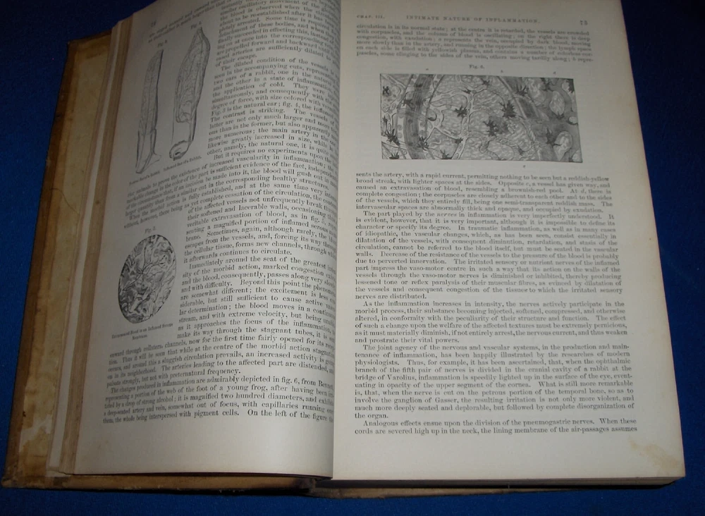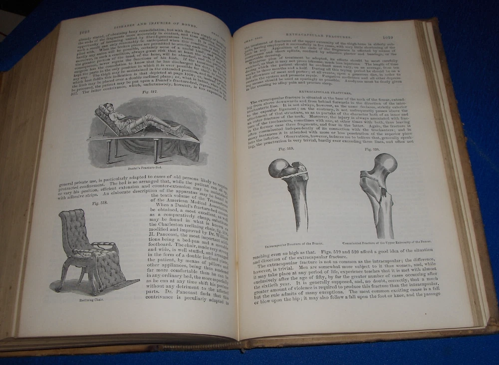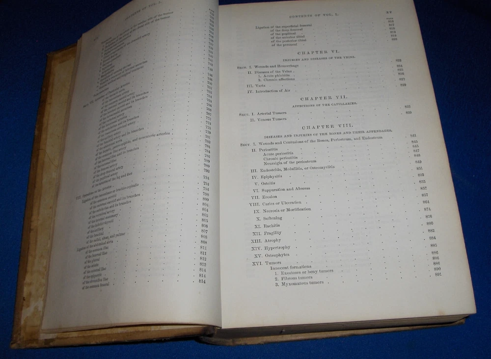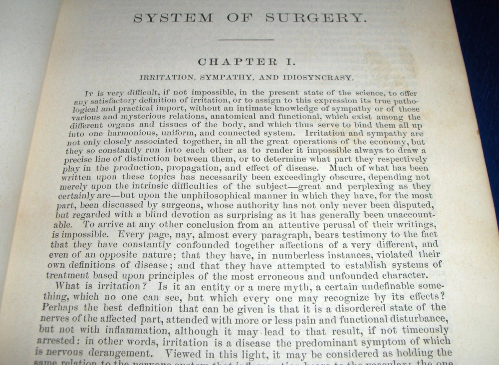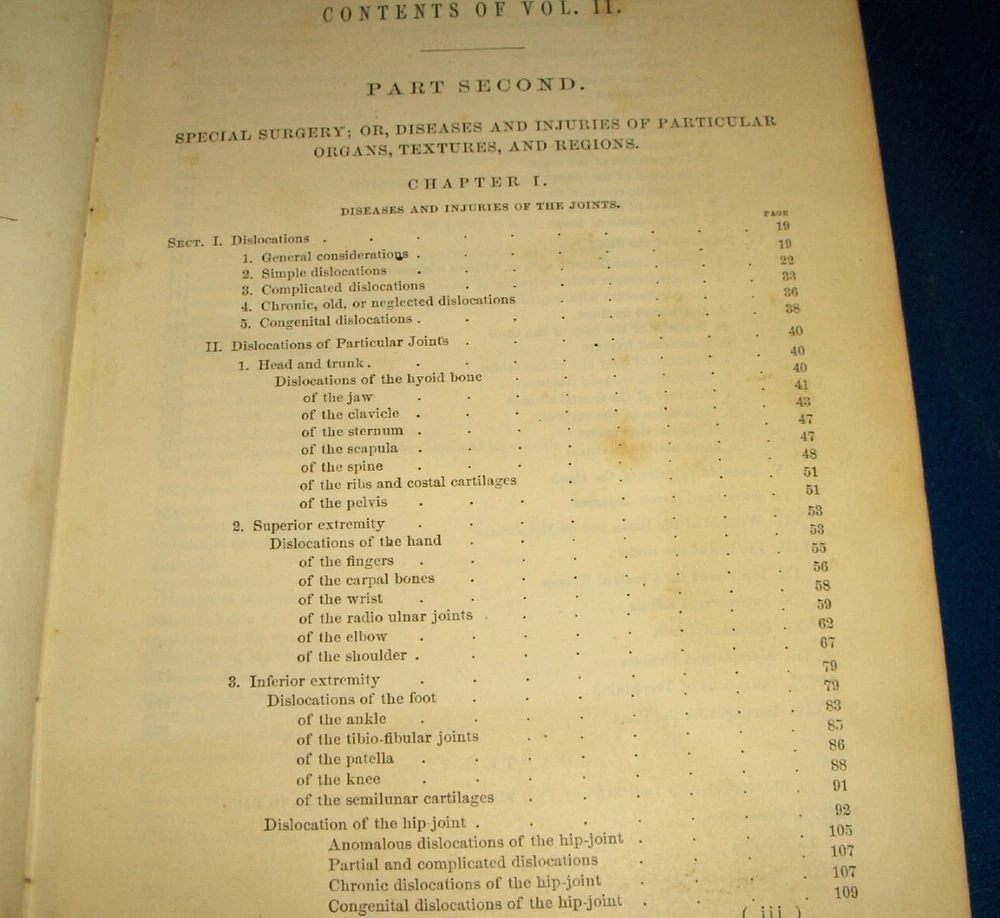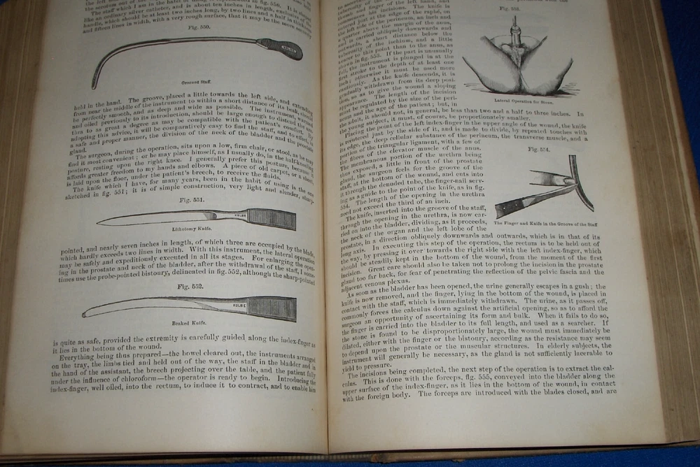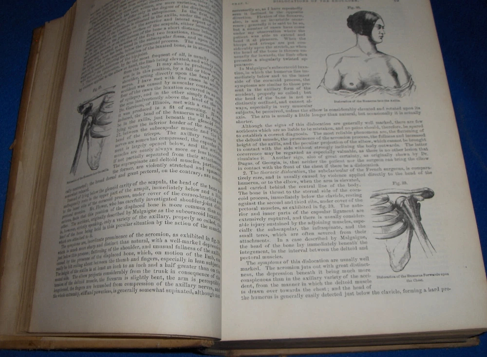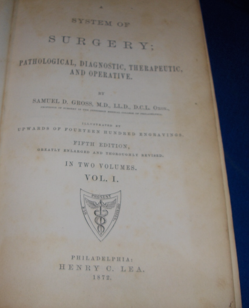 Up for auction is this leather bound 2 volume Book set titled "A SYSTEM OF SURGERY-Pathological Diagnostic Therapeutic & Operative ", written by Samuel D. Gross, MD, published by Henry C. Lea, great illustrated Medical Surgery book set with lots of detailed information on various types of Surgery, how to perform Surgery, Tools used, and much more with over 1400 illustrations, book belonged to Moreland Bros, copyright 1872, 5th Edition, 1098 and 1170 pages including very detailed Index in back of volume 2, each book size appx. 7 1/4" x 10 3/8". C ondition: Both Book leather covers show some edge, spine and corner wear, some soiling, corners lightly bumped with a some fraying along edges and at corners, covers have a few scuffs/scratches, some fraying at top and bottom of spine covers, contents are complete and VG with light edge and corner wear, light foxing on some pages mostly in blank boarders, pages have light browning around edges, will find a few tiny edge creases, light musty/smoky smell due to poor storage. Overall: Books are G+ due to leather wear on covers. INTERESTING MEDICAL 2 VOLUME BOOK SET ABOUT VARIOUS TYPES/WAYS OF SURGERY FROM NE OHIO ESTATE CHECK OUR OTHER AUCTIONS FOR PHOTOGRAPHY, LETTERS, MILITARY ITEMS, BOOKS, MAGAZINES, CATALOGS, ADVERTISING, GERMAN LANGUAGE BOOKS AND PAPER ITEMS, PAPER COLLECTABLES, AND OTHER ITEMS FROM 1820'S-2000'S