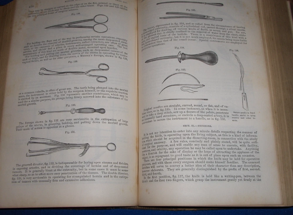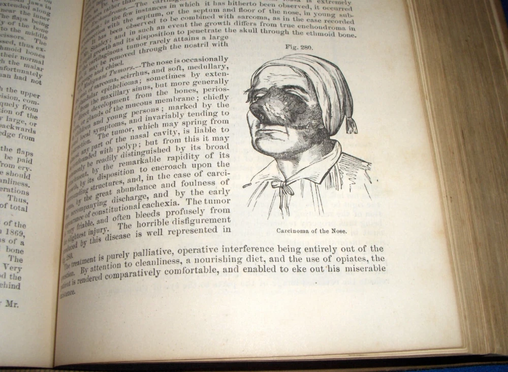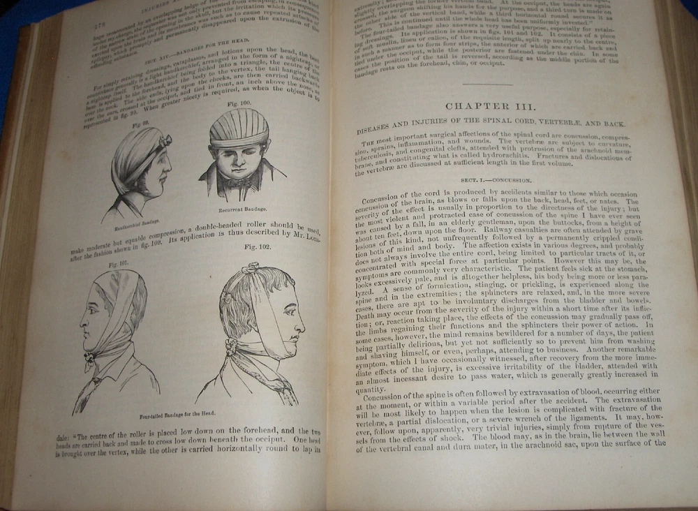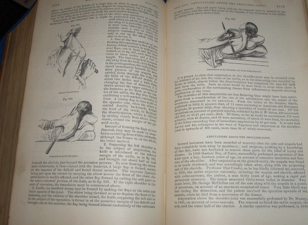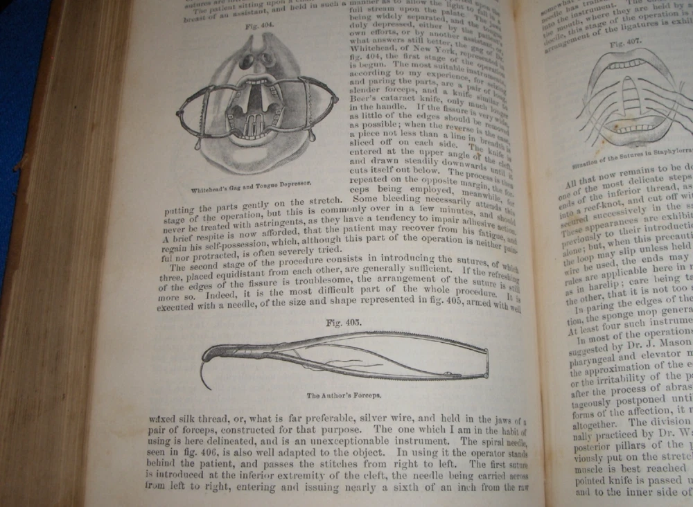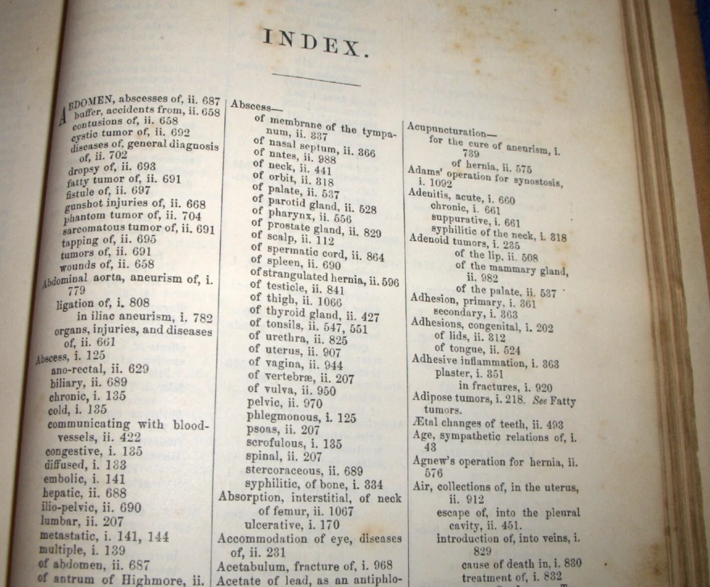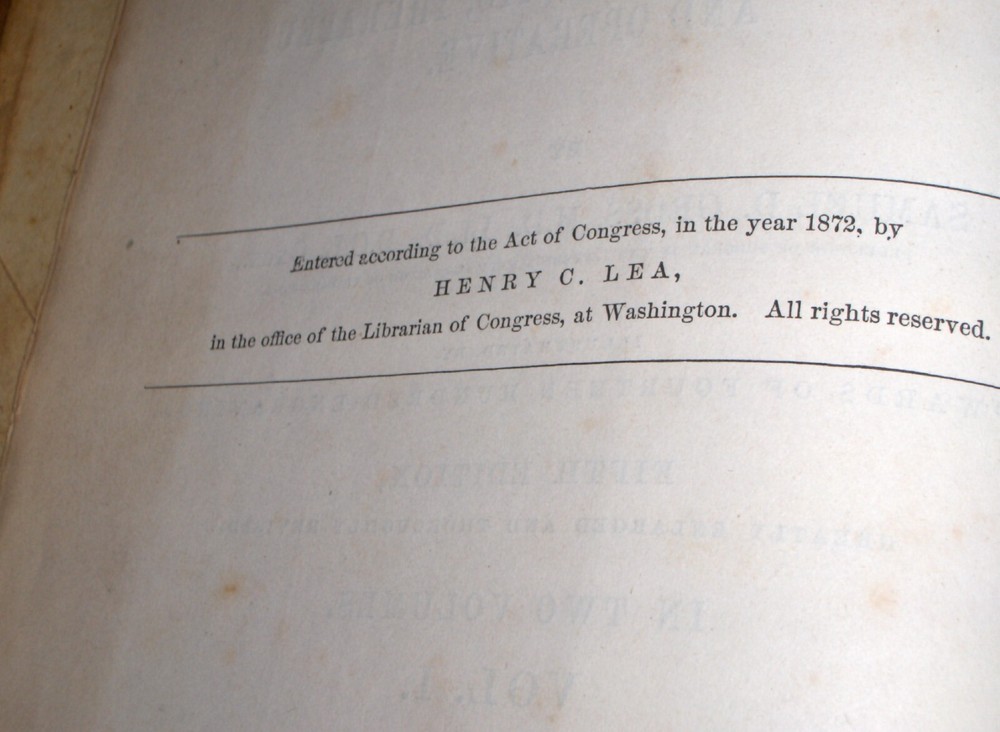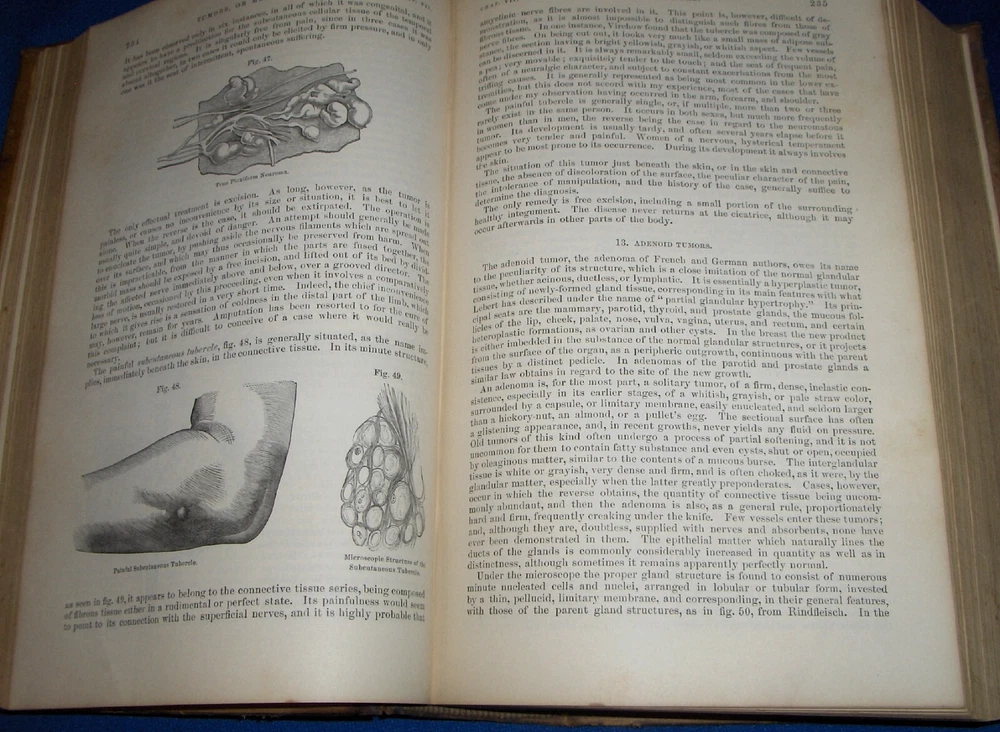 Up for auction is this leather bound 2 volume Book set titled "A SYSTEM OF SURGERY-Pathological Diagnostic Therapeutic & Operative ", written by Samuel D. Gross, MD, published by Henry C. Lea, great illustrated Medical Surgery book set with lots of detailed information on various types of Surgery, how to perform Surgery, Tools used, and much more with over 1400 illustrations, book belonged to Moreland Bros, copyright 1872, 5th Edition, 1098 and 1170 pages including very detailed Index in back of volume 2, each book size appx. 7 1/4" x 10 3/8". C ondition: Both Book leather covers show some edge, spine and corner wear, some soiling, corners lightly bumped with a some fraying along edges and at corners, covers have a few scuffs/scratches, some fraying at top and bottom of spine covers, contents are complete and VG with light edge and corner wear, light foxing on some pages mostly in blank boarders, pages have light browning around edges, will find a few tiny edge creases, light musty/smoky smell due to poor storage. Overall: Books are G+ due to leather wear on covers. INTERESTING MEDICAL 2 VOLUME BOOK SET ABOUT VARIOUS TYPES/WAYS OF SURGERY FROM NE OHIO ESTATE CHECK OUR OTHER AUCTIONS FOR PHOTOGRAPHY, LETTERS, MILITARY ITEMS, BOOKS, MAGAZINES, CATALOGS, ADVERTISING, GERMAN LANGUAGE BOOKS AND PAPER ITEMS, PAPER COLLECTABLES, AND OTHER ITEMS FROM 1820'S-2000'S