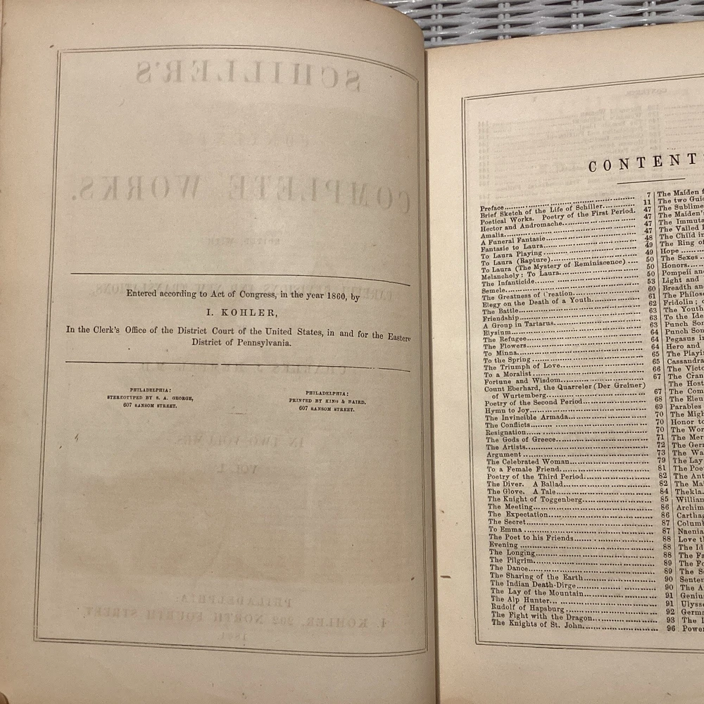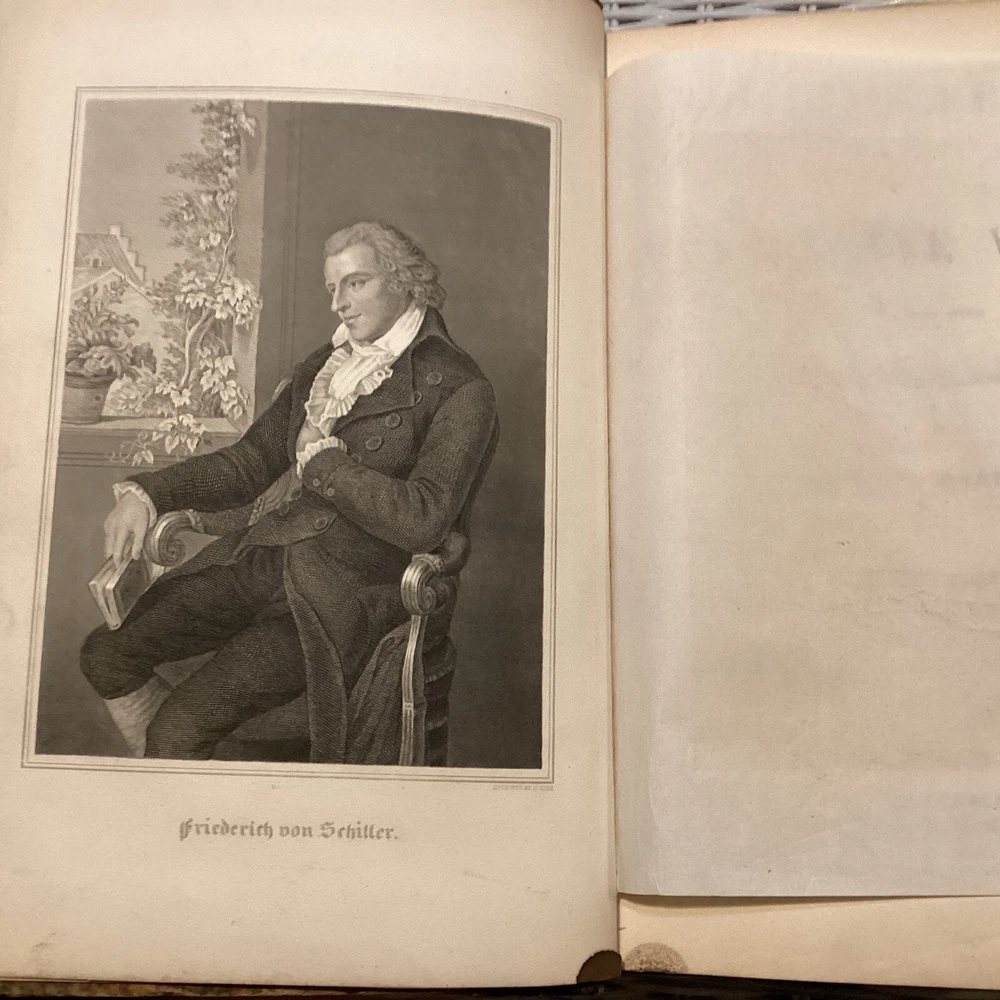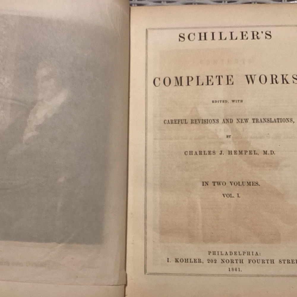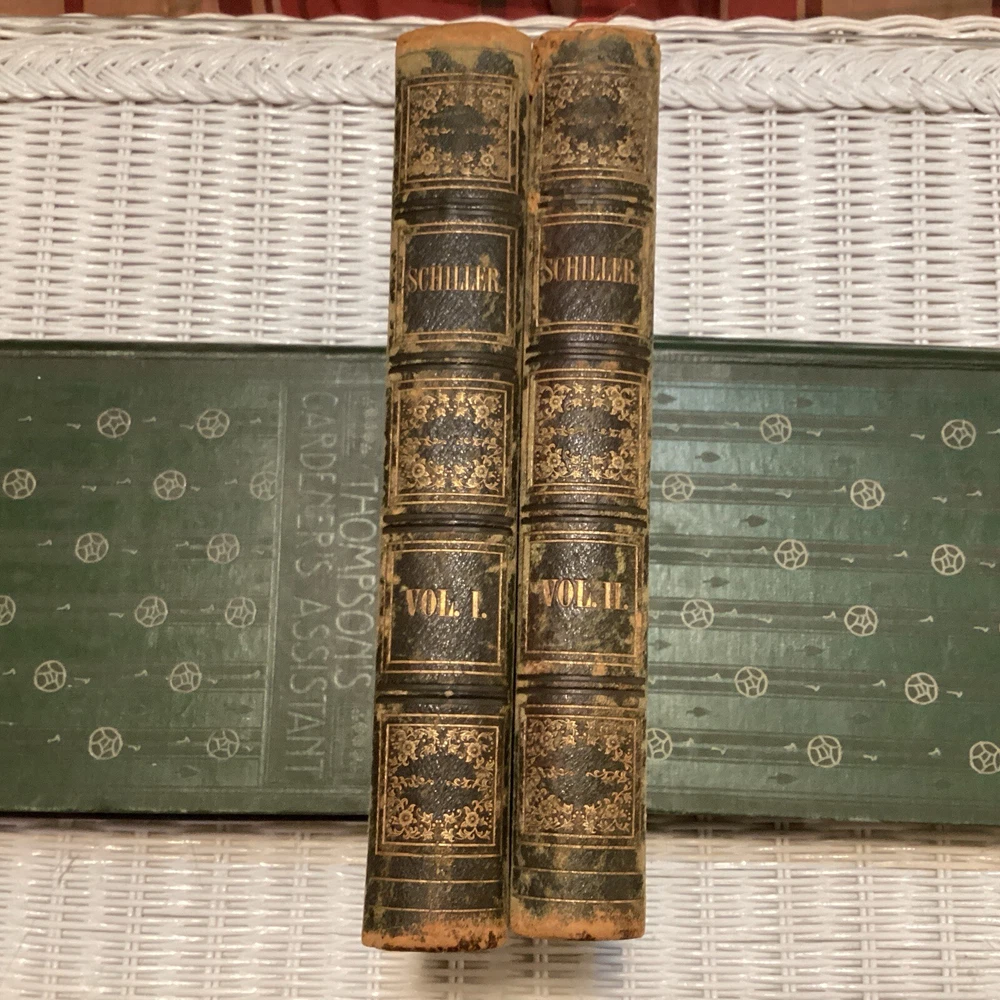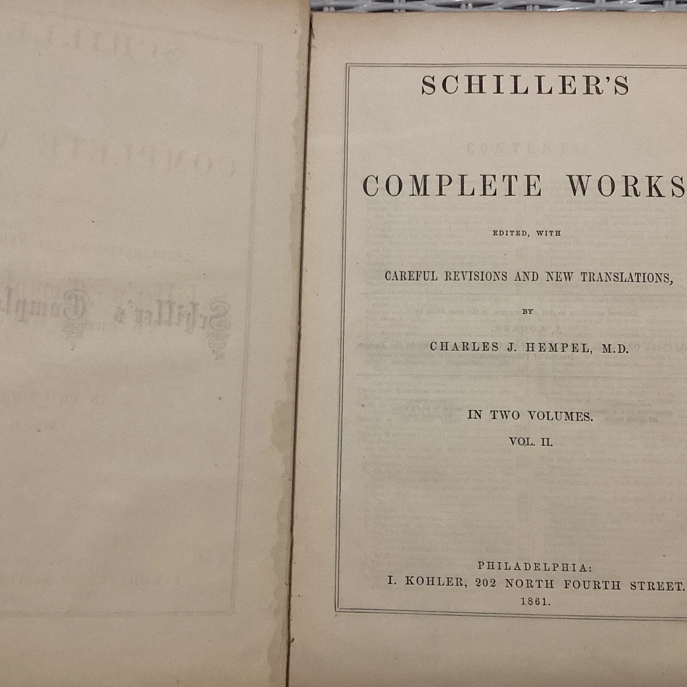 Schiller's Complete Works by Charles J. Hempel. Complete 2 volume set. 1861. Original leather spine with gold gild and original boards. 11 inches tall, 8 inches wide, and 1.5 inches thick. Books are in great condition . Writing from previous own on first page as seen in photos. Please look at photos for condition and message me if you have any questions or concerns. Please check out my other antique book listings, as I have a collection that I am now starting to sell. Thank you and be well!