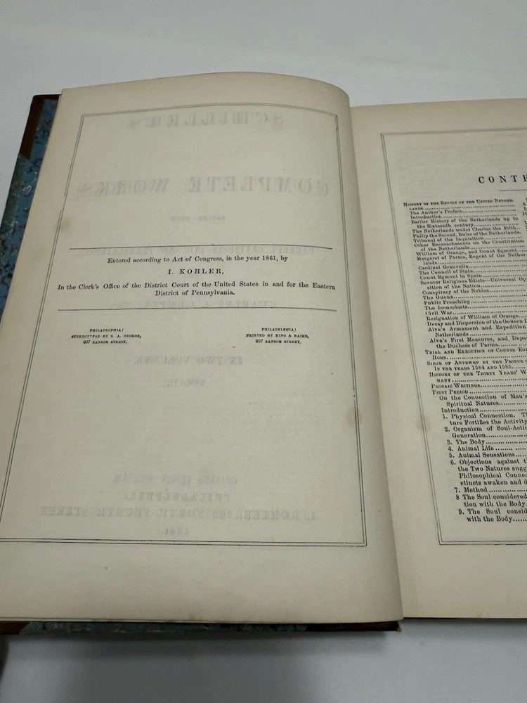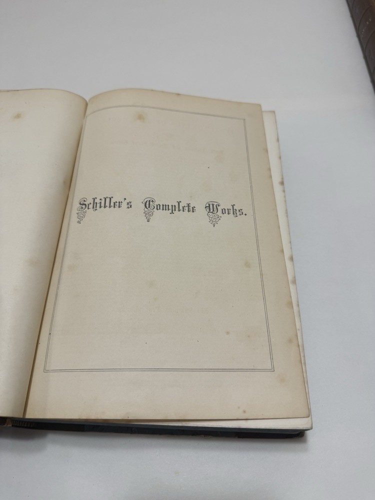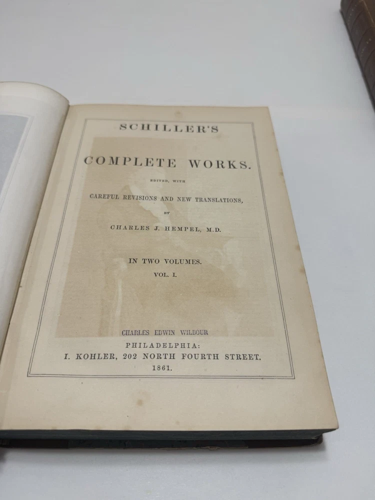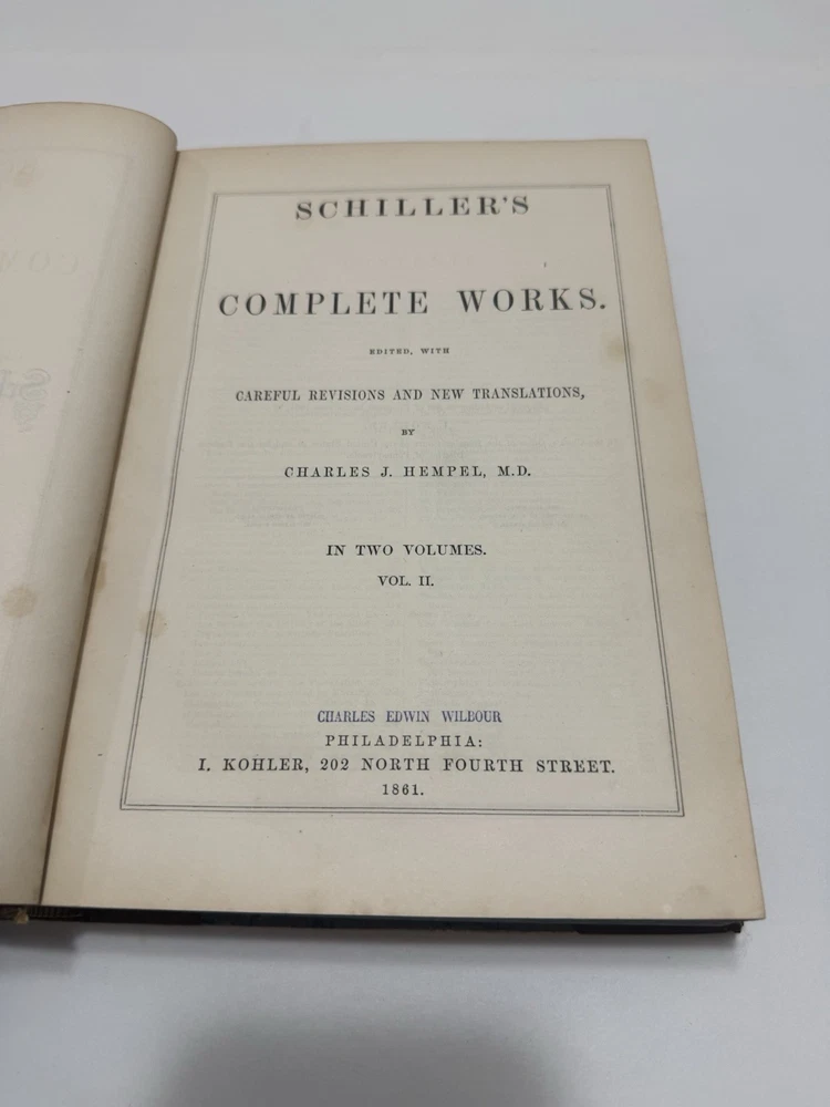Title: Schiller's Complete Works by Charles J. Hempel – 1861 Original Leather 2-Volume Set – Rare Antique Edition Item Description: A rare and valuable 2-volume set of Schiller's Complete Works , translated by Charles J. Hempel , published in 1861 . This antique edition is bound in original leather with intricate detailing and is a collector’s dream. The set contains the full works of Friedrich Schiller , one of Germany's greatest playwrights, poets, and philosophers. This is an exceptional find for collectors of rare books and lovers of German literature. Features: Author: Friedrich Schiller, translated by Charles J. Hempel Publisher: 1861 (Original Edition) Edition: Complete 2-volume set Format: Leather-bound with gilt detailing on the spine and covers Condition: Very good for its age, with slight aging and wear typical of antique books, but in overall excellent shape for a 160+ year-old set Key Highlights: Complete works of Friedrich Schiller , including his most important plays, poems, and philosophical writings. Translated by Charles J. Hempel , offering an English-language presentation of Schiller's monumental works. Antique leather binding with gilt-edged pages and decorative embossing, making this a beautifully crafted set. Ideal for collectors of rare books , this edition is a unique and historic piece that reflects the high-quality production standards of 19th-century publishing. A remarkable addition to any library of German literature or classic works , perfect for display or scholarly study.