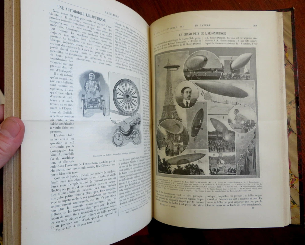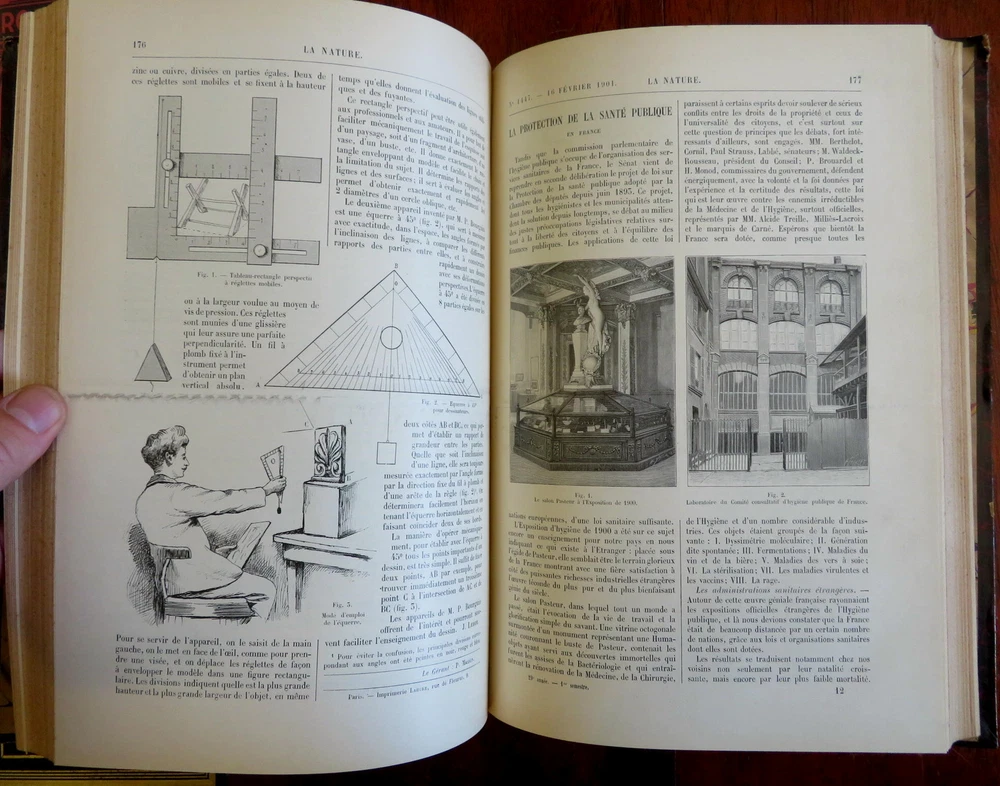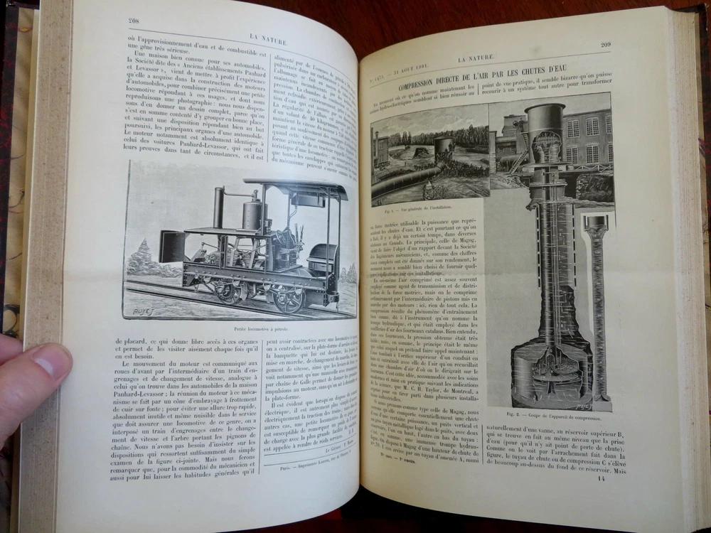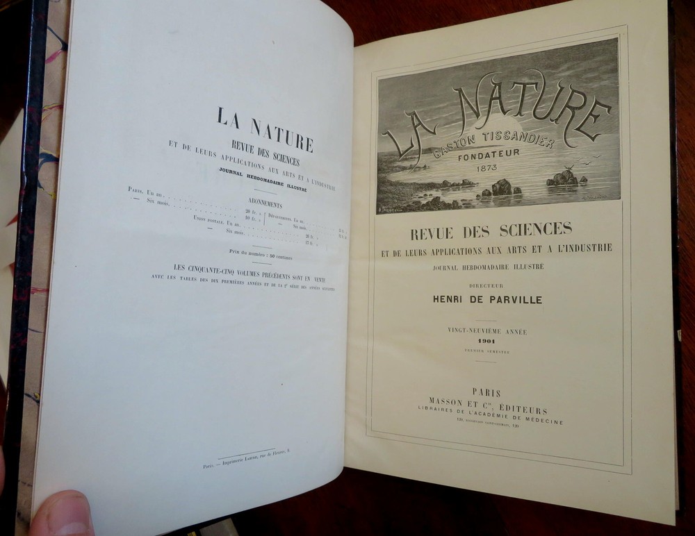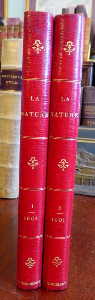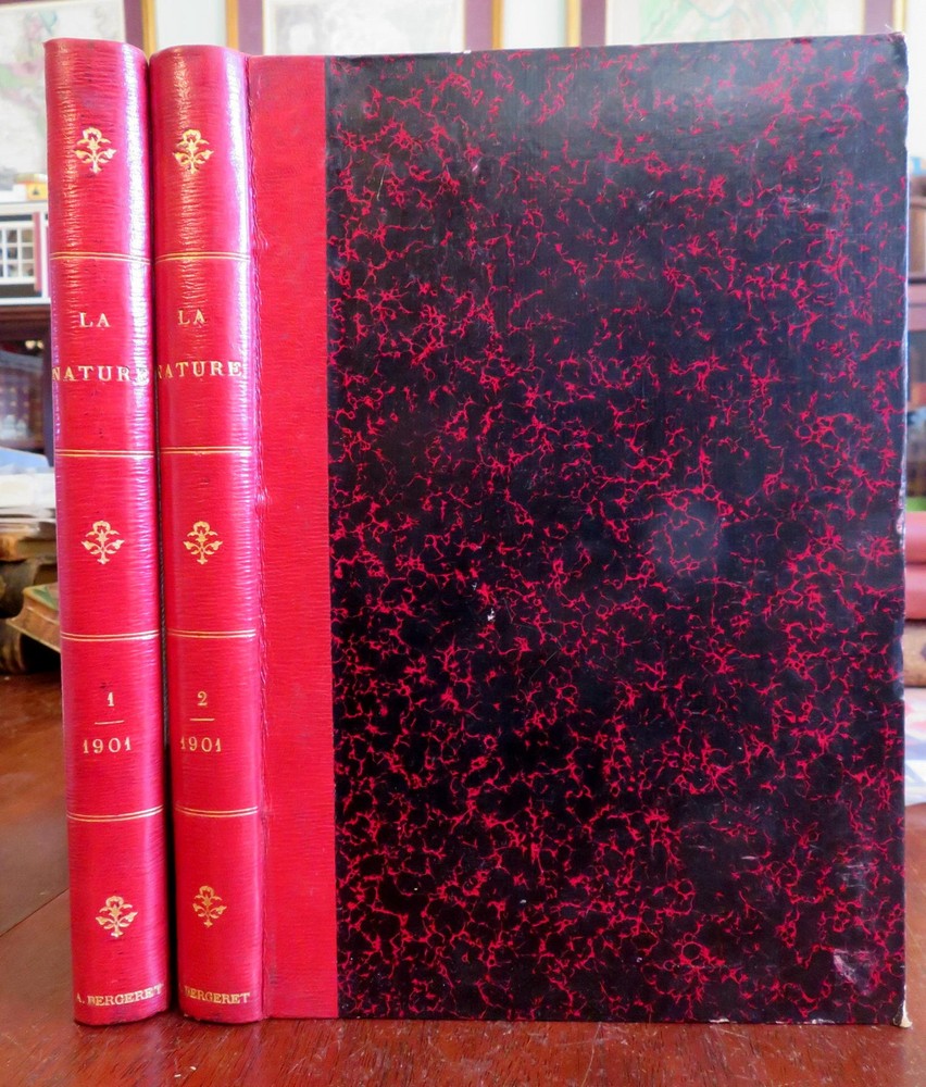 Scientific Review Arts France Inventions 1901 Illustrated 2 vol. leather set Scientific Review Arts France Inventions 1901 Illustrated 2 vol. leather set (Old Books, Early 20th Century Books, Leather Books, French Periodicals, Illustrated Books, Sciences, Engineering). Le Nature: Revue des Sciences et de Leurs Application Aux Arts et a L'Industrie, ed. by Henri de Parville. Published 1901, Paris by Masson et Cie. 2 volumes, each c. 425 pages. Text in French. Profusely illustrated throughout. Fascinating work covering a broad range of topics, including engineering, latest discoveries and inventions, science, geography, industry, medicine, chemistry, on and on. Period 1/4 leather bindings, smooth spines, gilt bands, title lettering, & compartment decorations, marbled covers & end papers. Set is physically old and shows some signs of handling and time. Set is not new or in "new" condition. Bindings gently age worn and lightly rubbed, covers are strongly and firmly attached, set remains overall attractive as an object. Text block paper is gently toned, internally still clean, well preserved, tight, sound. Still attractive on the shelf. This scarce set displays a pleasing and unique age patina and is in nice antiquarian condition, any age flaws easy to overlook or forgive. Please review photos for more detail and our best attempt to convey how this wonderful pictorial set survives. Books Measures c. 11 1/2" H x 8" W. [B8402].