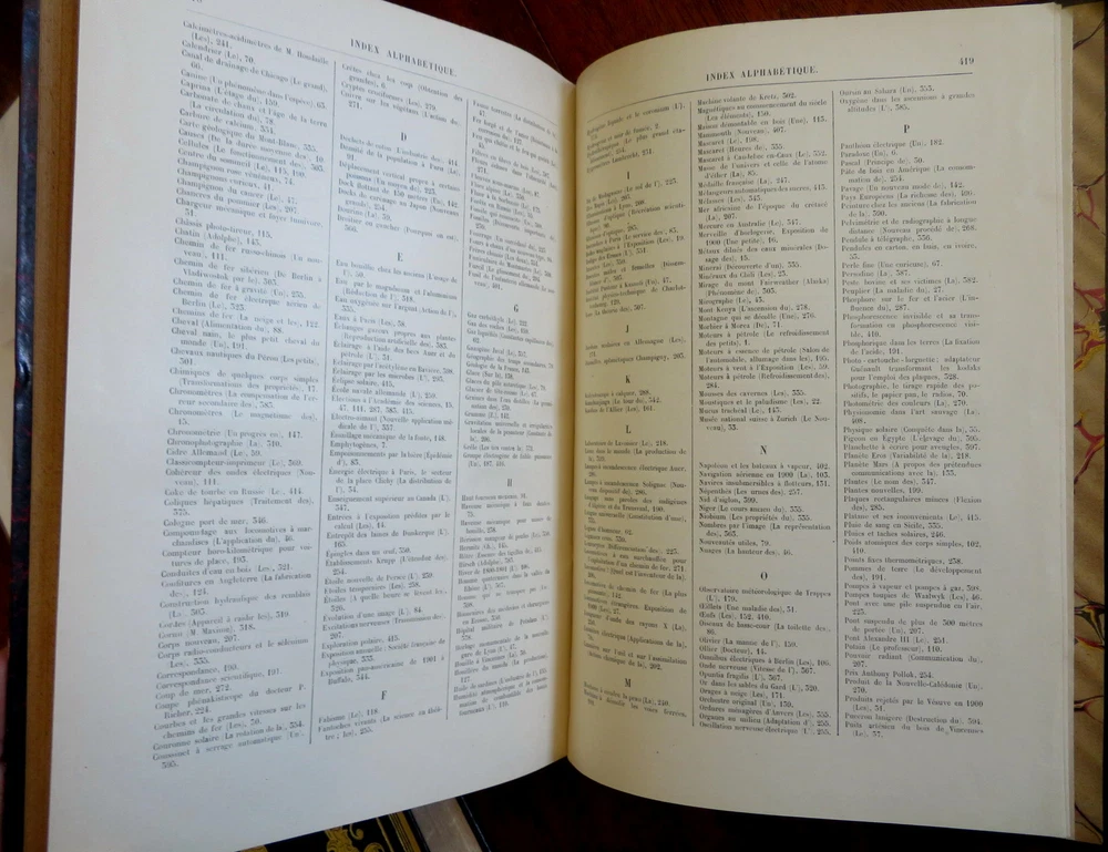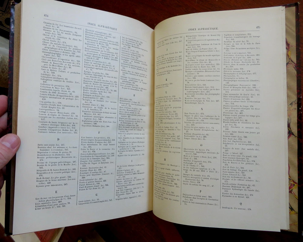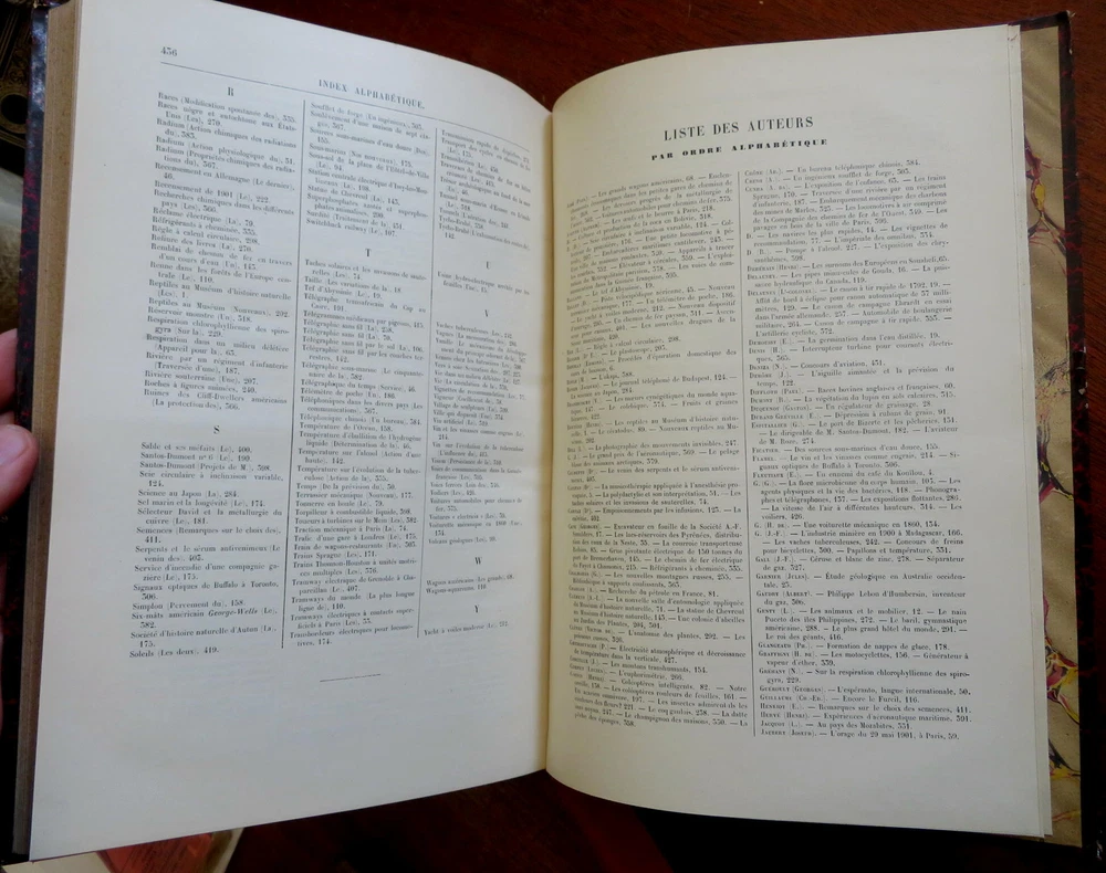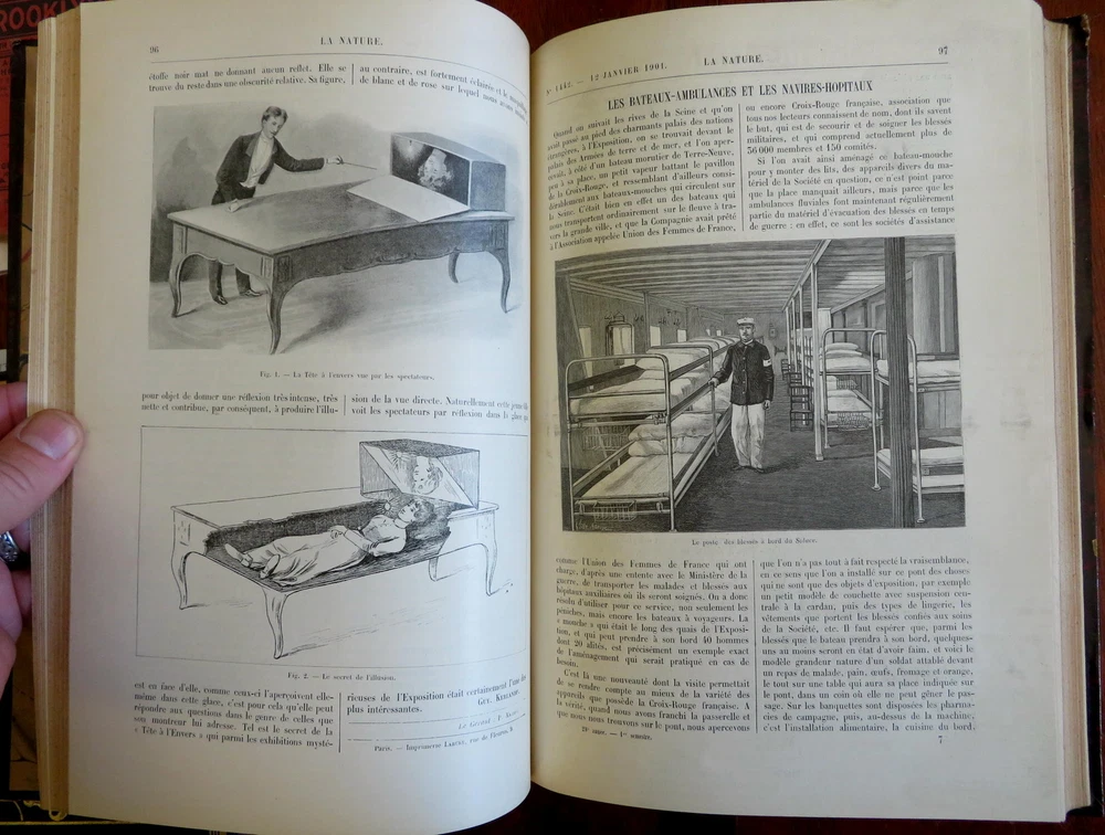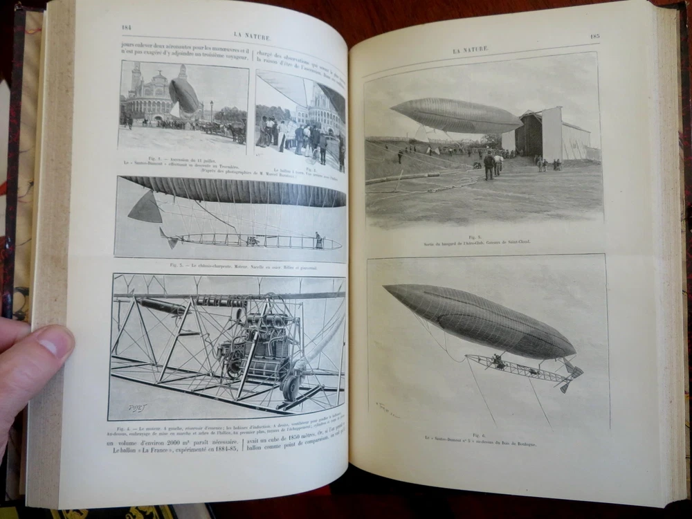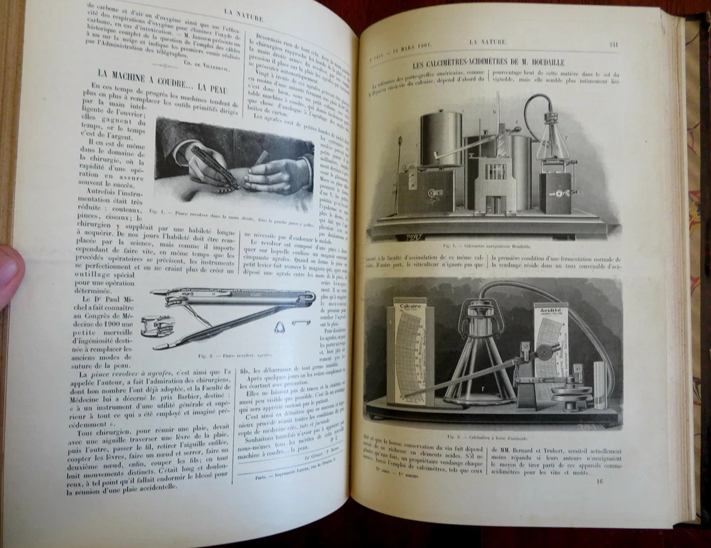 Scientific Review Arts France Inventions 1901 Illustrated 2 vol. leather set Scientific Review Arts France Inventions 1901 Illustrated 2 vol. leather set (Old Books, Early 20th Century Books, Leather Books, French Periodicals, Illustrated Books, Sciences, Engineering). Le Nature: Revue des Sciences et de Leurs Application Aux Arts et a L'Industrie, ed. by Henri de Parville. Published 1901, Paris by Masson et Cie. 2 volumes, each c. 425 pages. Text in French. Profusely illustrated throughout. Fascinating work covering a broad range of topics, including engineering, latest discoveries and inventions, science, geography, industry, medicine, chemistry, on and on. Period 1/4 leather bindings, smooth spines, gilt bands, title lettering, & compartment decorations, marbled covers & end papers. Set is physically old and shows some signs of handling and time. Set is not new or in "new" condition. Bindings gently age worn and lightly rubbed, covers are strongly and firmly attached, set remains overall attractive as an object. Text block paper is gently toned, internally still clean, well preserved, tight, sound. Still attractive on the shelf. This scarce set displays a pleasing and unique age patina and is in nice antiquarian condition, any age flaws easy to overlook or forgive. Please review photos for more detail and our best attempt to convey how this wonderful pictorial set survives. Books Measures c. 11 1/2" H x 8" W. [B8402].