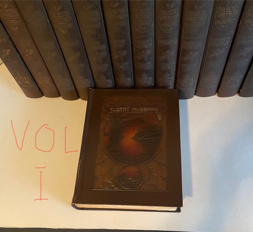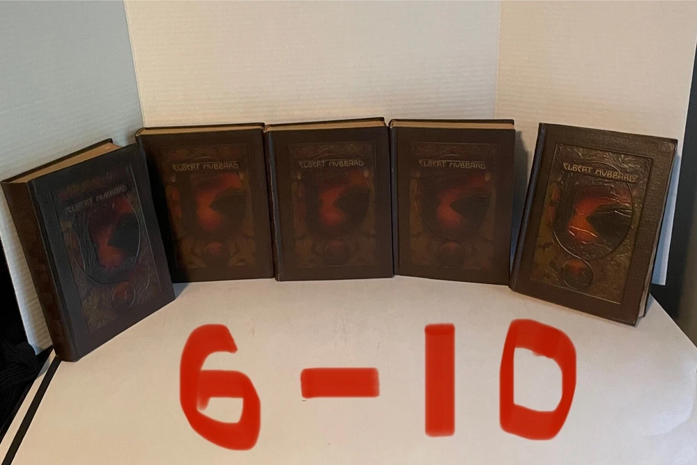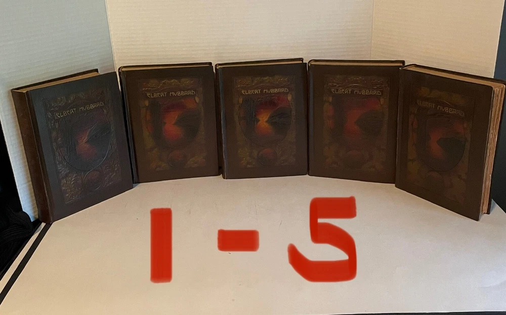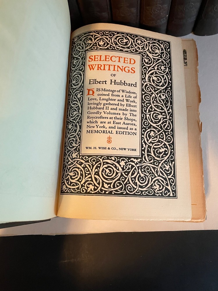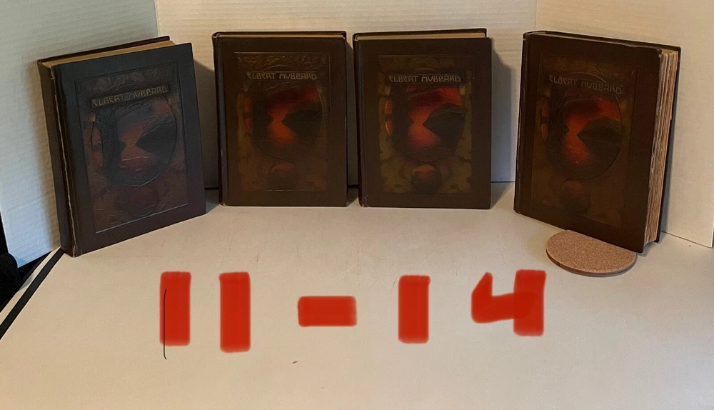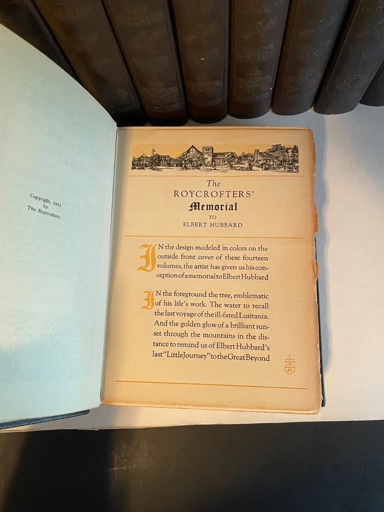 Delve into the profound works of Elbert Hubbard with this cherished complete 14 volume set from the Roycrofters Memorial Edition, printed in 1922. Each hardcover is crafted with care, bound in full leather and embellished with illustrations that bring the richness of Hubbard's prose to life. Published by Wise & Co NY, these books are a testament to the era's literary craftsmanship and aesthetic. The collection is a treasure for both enthusiasts of literature and first-edition collectors alike. With text in English and origins in the United States, these original works are not just reading material but historical artifacts. This set stands as a tribute to the legacy of one of America's notable authors, encapsulating the spirit of literature from a bygone era. This beautiful set has some minor issues on the books like light wear and paper toning. Vol III has a rip on the inside back cover that does not go through the leather. See photos 12 & 13. This Memorial Edition was created after Elbert Hubbard and his wife Alice went down in the sinking of the S/S Lusitania by a German Navy U-boat May 7, 1915. From a private collection, clean and without any school or library stamps etc. that most similar online listings have. Each leather volume is less than $18 at this price of $250. I will ship in two boxes, 7 volumes each and mail both at the same time. Thank you for your view!