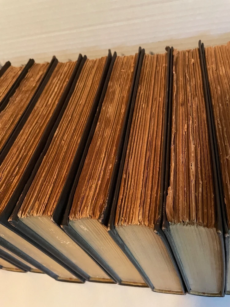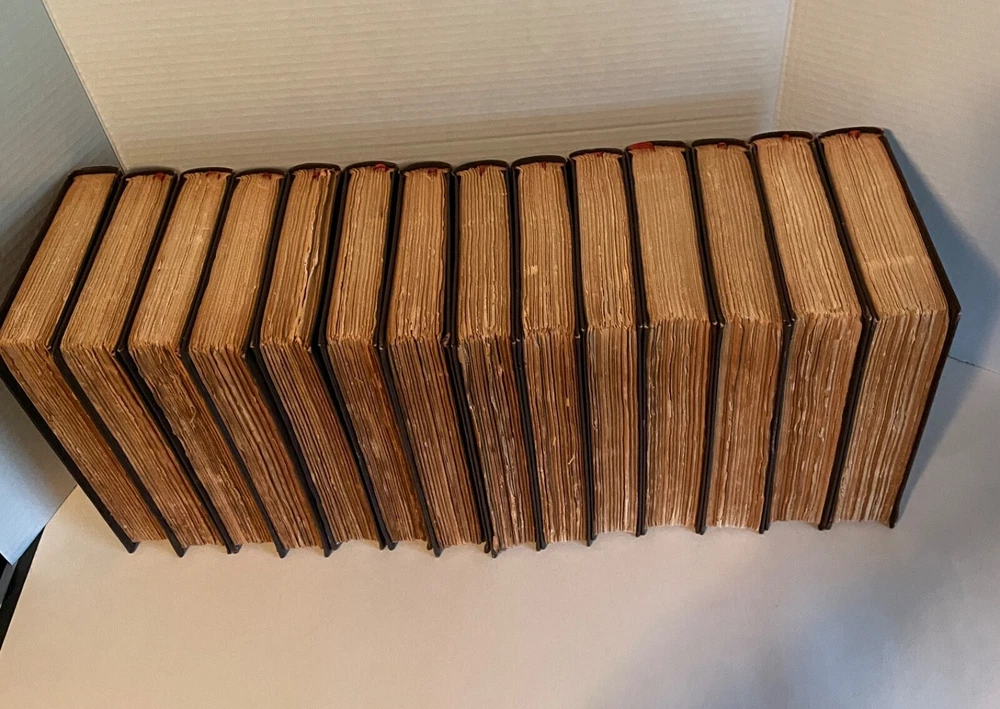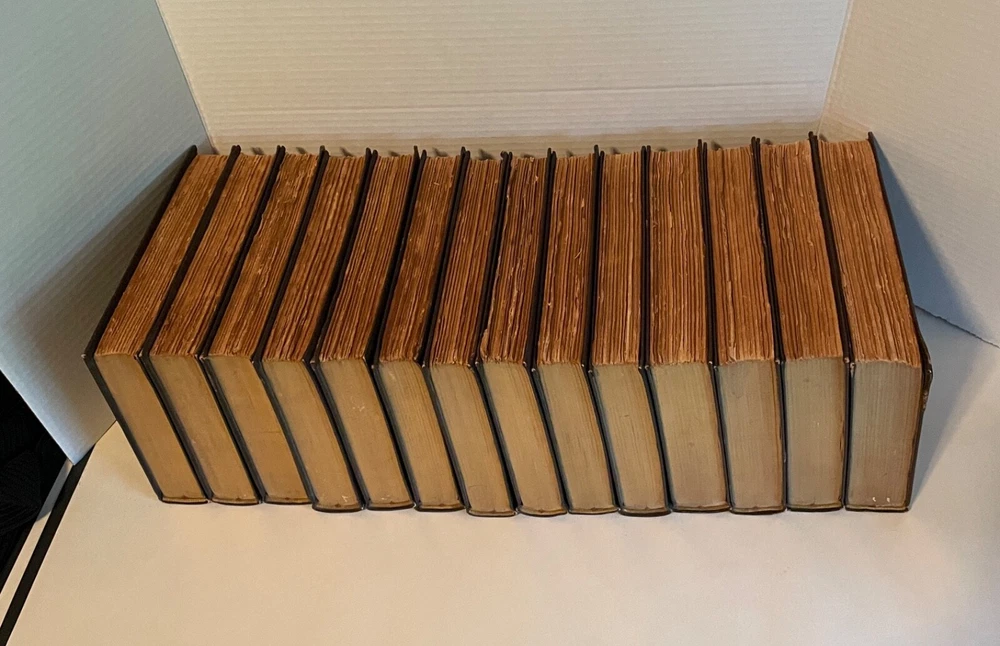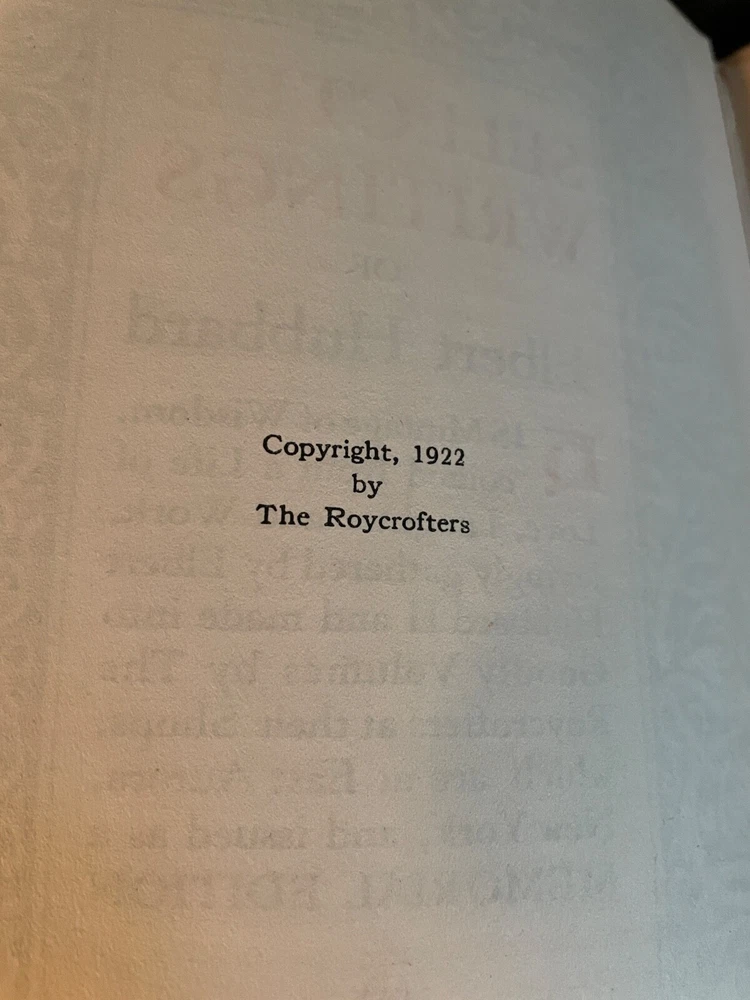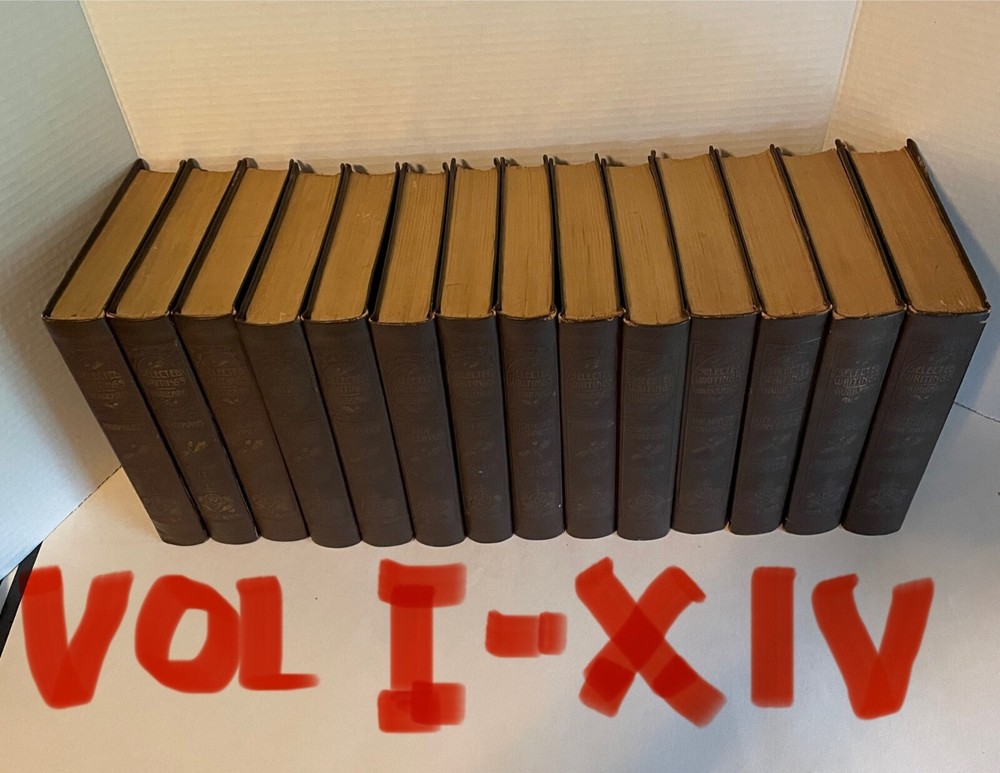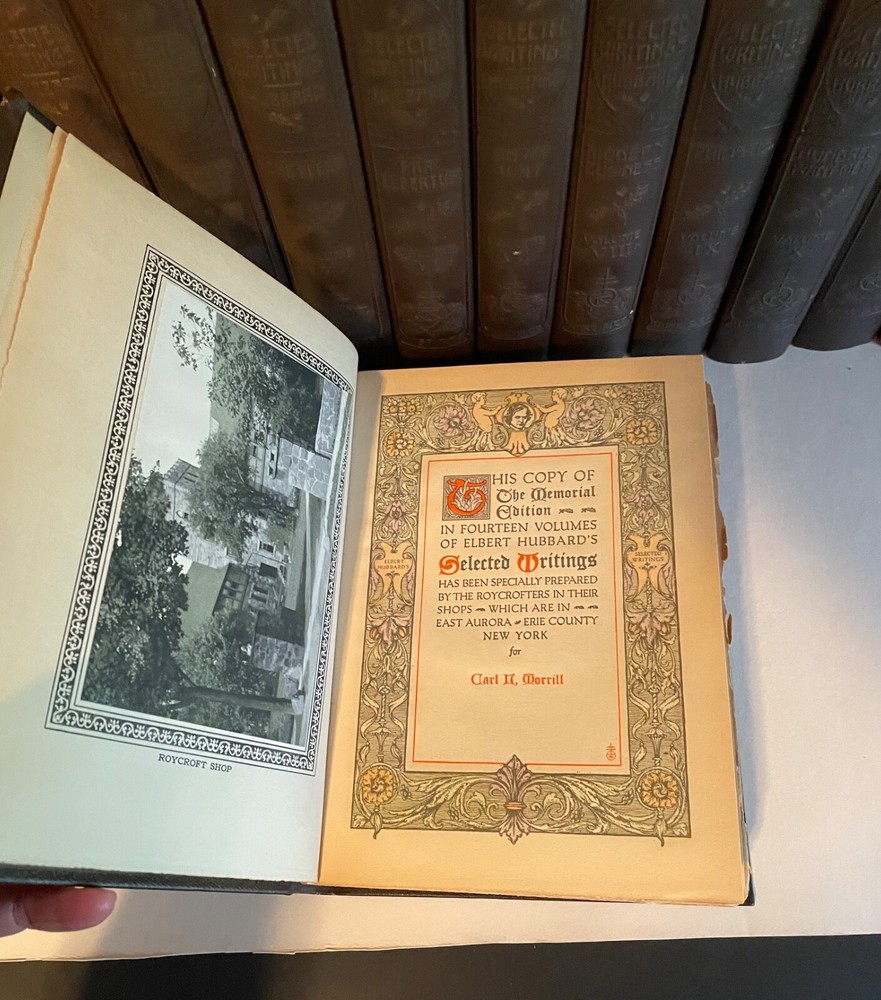 Delve into the profound works of Elbert Hubbard with this cherished complete 14 volume set from the Roycrofters Memorial Edition, printed in 1922. Each hardcover is crafted with care, bound in full leather and embellished with illustrations that bring the richness of Hubbard's prose to life. Published by Wise & Co NY, these books are a testament to the era's literary craftsmanship and aesthetic. The collection is a treasure for both enthusiasts of literature and first-edition collectors alike. With text in English and origins in the United States, these original works are not just reading material but historical artifacts. This set stands as a tribute to the legacy of one of America's notable authors, encapsulating the spirit of literature from a bygone era. This beautiful set has some minor issues on the books like light wear and paper toning. Vol III has a rip on the inside back cover that does not go through the leather. See photos 12 & 13. This Memorial Edition was created after Elbert Hubbard and his wife Alice went down in the sinking of the S/S Lusitania by a German Navy U-boat May 7, 1915. From a private collection, clean and without any school or library stamps etc. that most similar online listings have. Each leather volume is less than $18 at this price of $250. I will ship in two boxes, 7 volumes each and mail both at the same time. Thank you for your view!