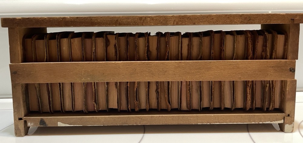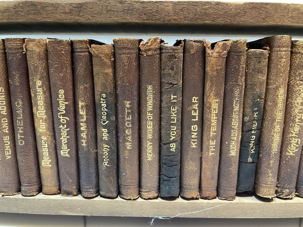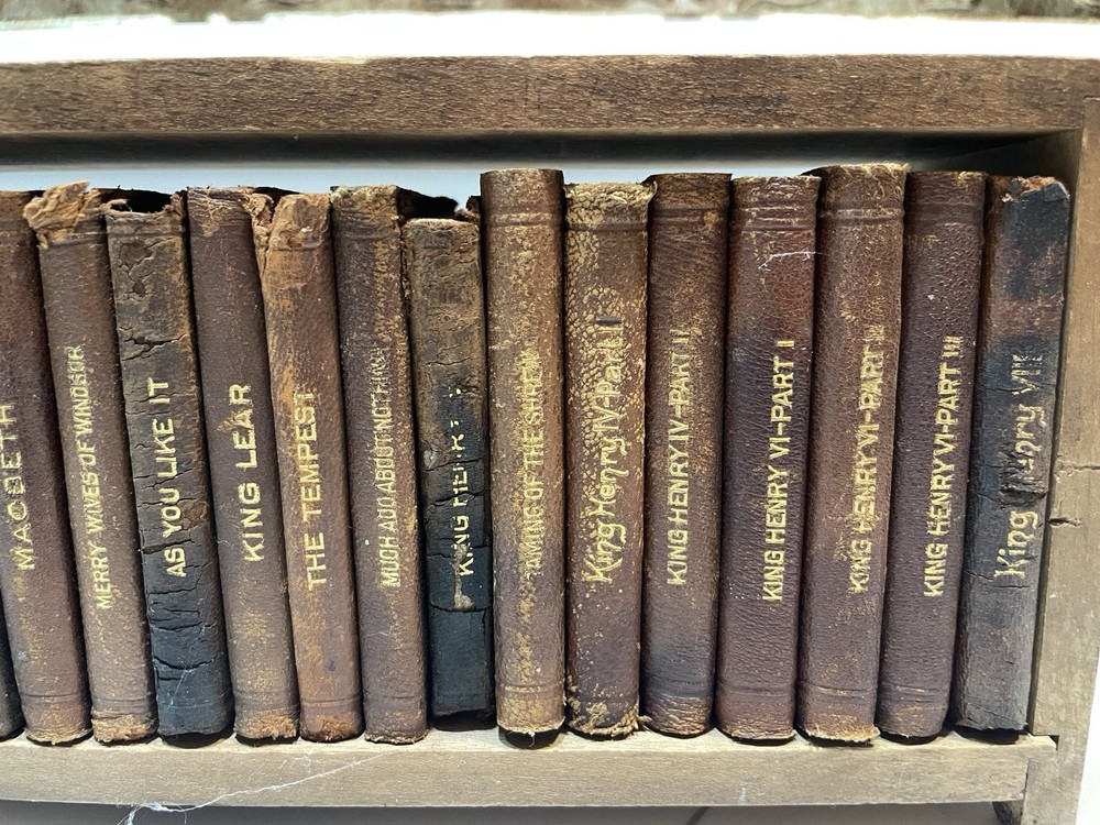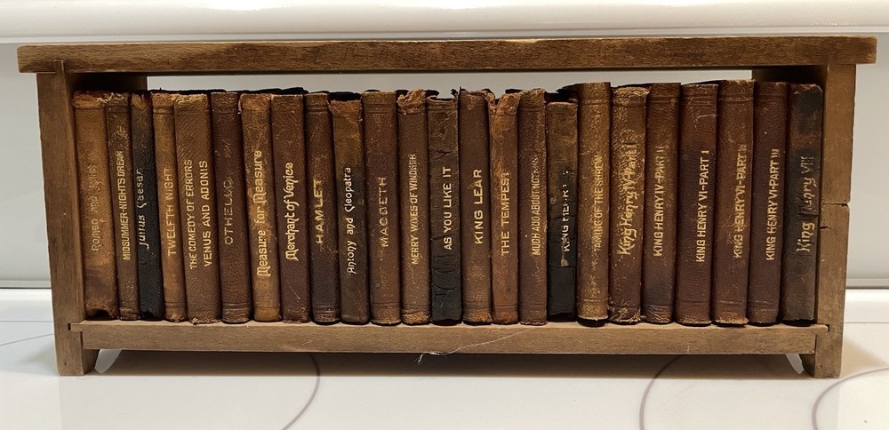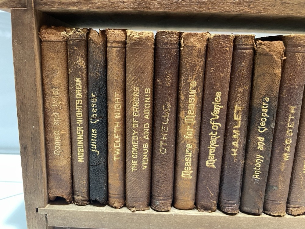 This product is a set of 24 vintage miniature leather books featuring works by William Shakespeare. These early 1900s collectibles are a unique and charming addition to any bookshelf, especially for literature enthusiasts or Shakespeare fans. The fact that these books are miniature adds an extra element of whimsy and nostalgia to their appeal, making them a special and lasting addition to any collection. Free Priority Shipping