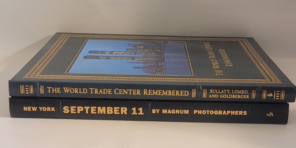 This set of 2 fine letter books, "World Trade Center Remembered" and "New York September 11," The books focus on the topic of terrorism, specifically the history of the events surrounding September 11th. They are original editions and bound in leather. Please ask any questions. The New York September 11 book has a black mark on the front cover picture. Besides that these books are in excellent condition. These would be great coffee table books.