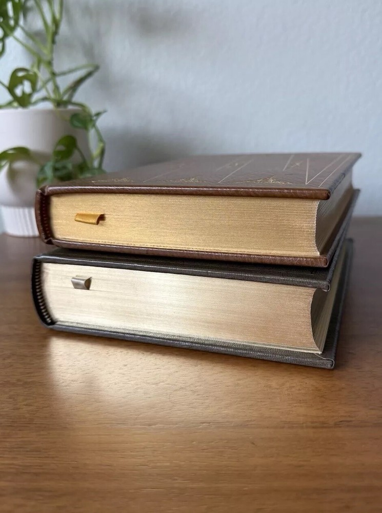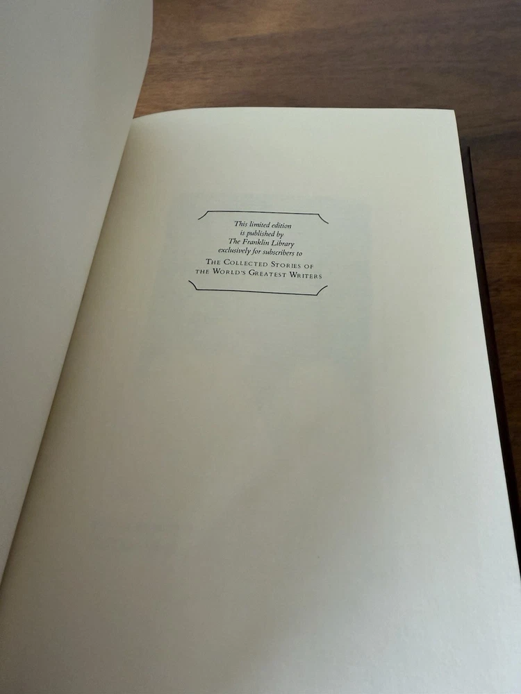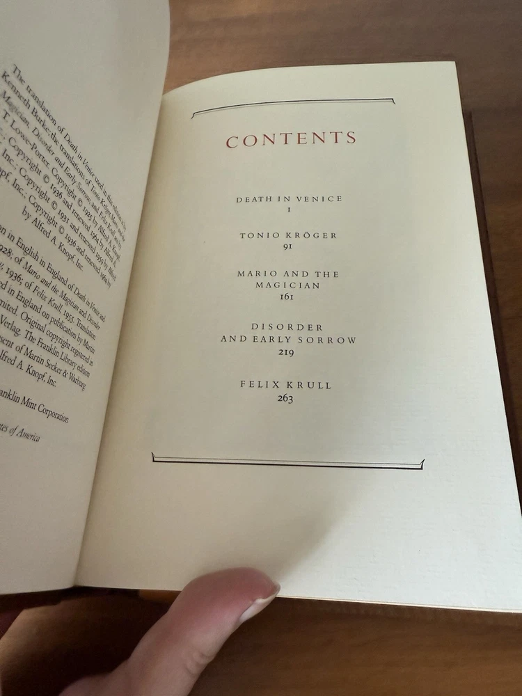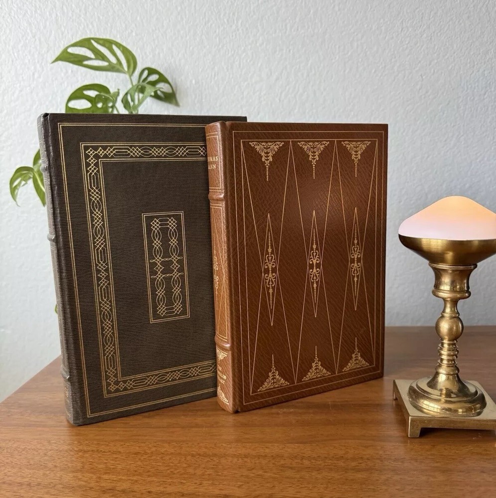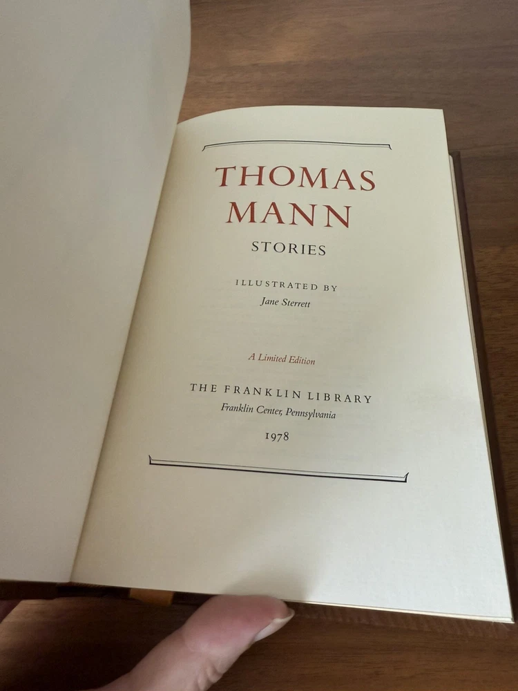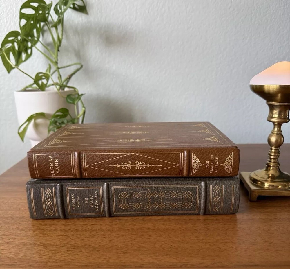 Set Of 2 Thomas Mann Franklin Library Leather Bound Books Magic Mountain & Stories “Stories” is in brown leather, a limited edition, part of the Collected Stories of the Worlds Greatest Writers collection. Includes: Death in Venice Tonio Kroger Mario & The Magician Disorder & Early Sorrow Felix Krull Leather Bound, Accented in 22kt gold. Printed on archival paper with gilded edges. The endsheets are of moire fabric with a silk ribbon page marker. Smyth sewing and concealed muslin joints. “The Magic Mountain” is in gray leatherette. Leatherette, Accented in gold. Printed on archival paper with gilded edges. The endsheets are marbled paper with a silk ribbon page marker. Smyth sewing and concealed muslin joints. Both are in excellent preowned condition, neither appear to have been read. Near mint condition!