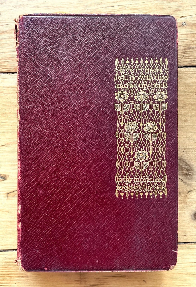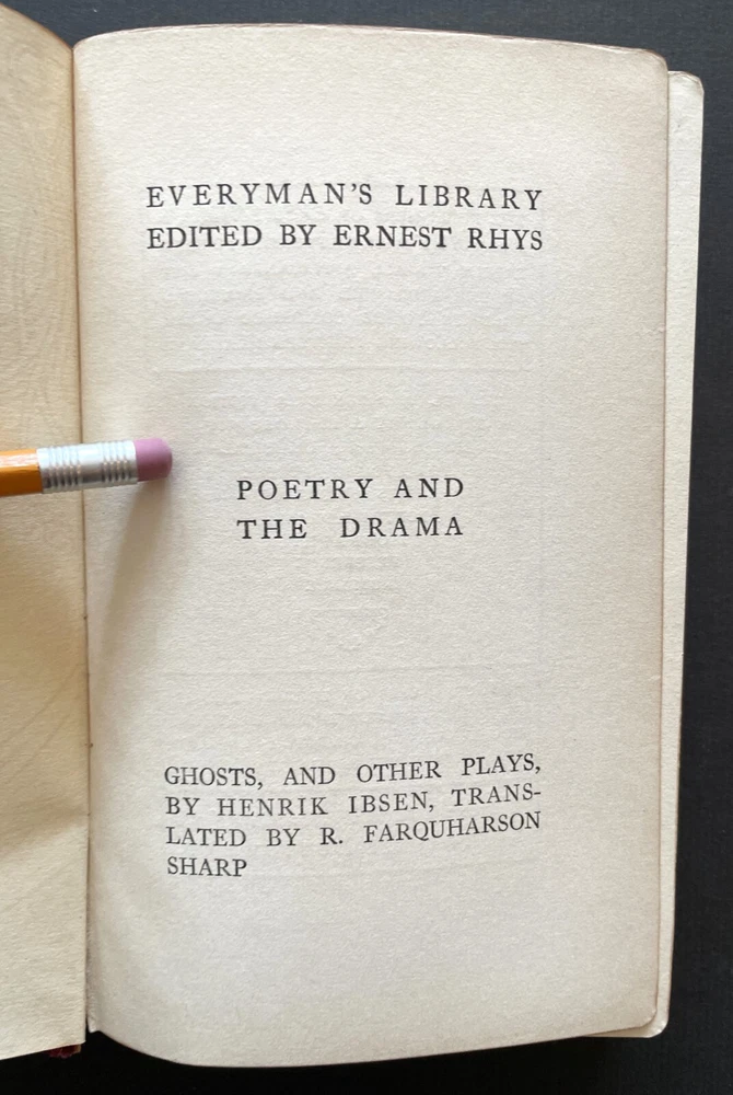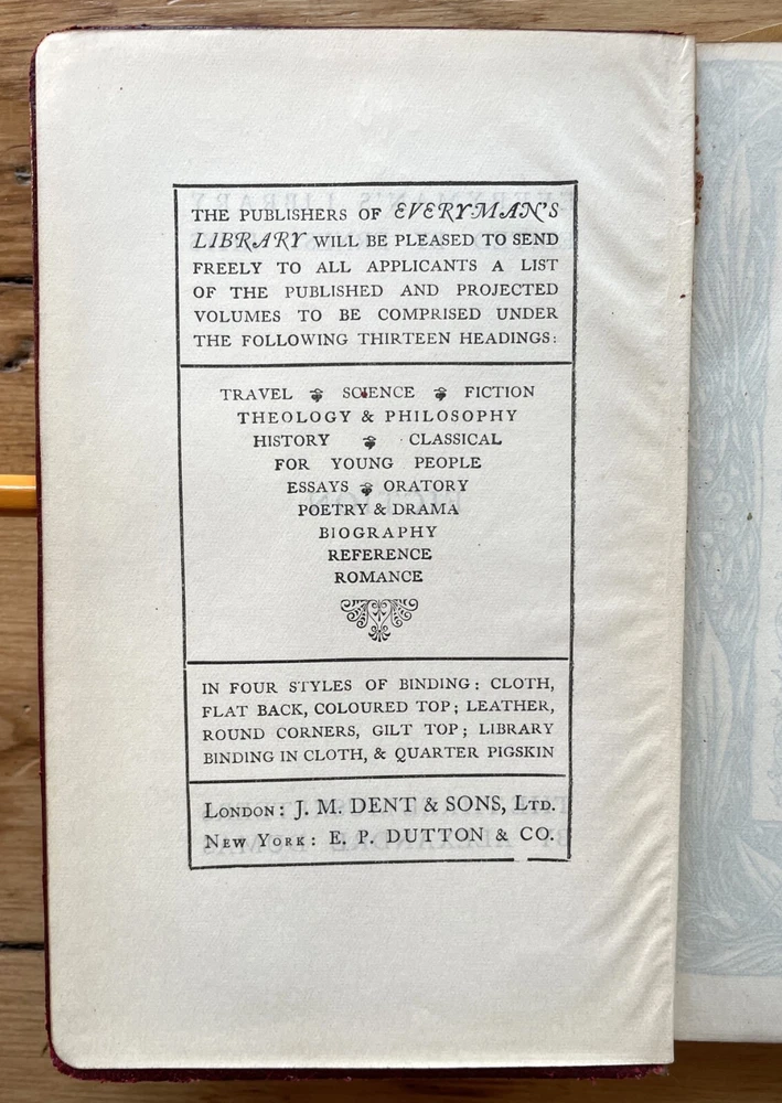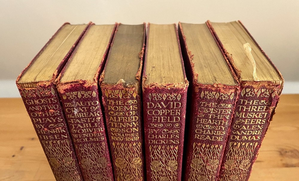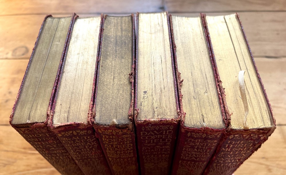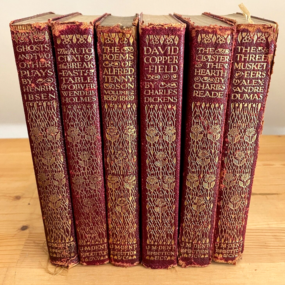 Set of 6 Everyman's Library 1912 - 1913 J. M. Dent & E. P. Dutton Burgundy Leather with decorative gilt spines David Copperfield by Charles Dickens Ghosts and Other Plays by Henrik Ibsen The Autocrat at the Breakfast Table by Oliver Wendel Holmes The Cloister and the Hearth by Charles Reade The Three Musketeers by Alexander Dumas The Poems of Alfred Tennyson Leather rubbed and worn at extremities. Cloister and Hearth front board detached; Three musketeers front board tenuously attached at joint. A couple of books have a prior owner name or bookplate. Books are a mix of 2nd, 3rd and early Everyman editions of these titles. Attractive shelf presence of these early Everyman editions in leather. Worn and Good only