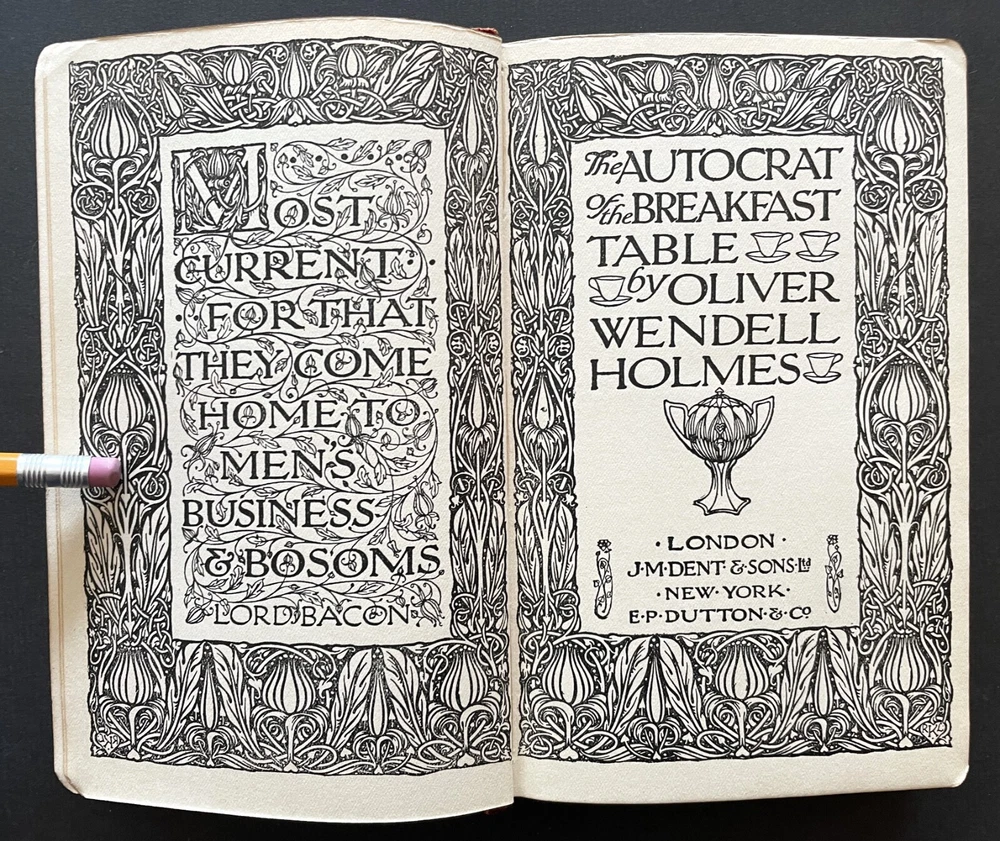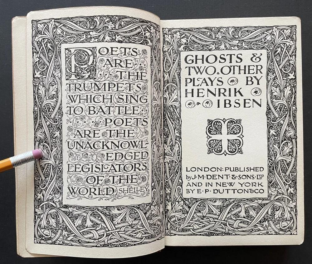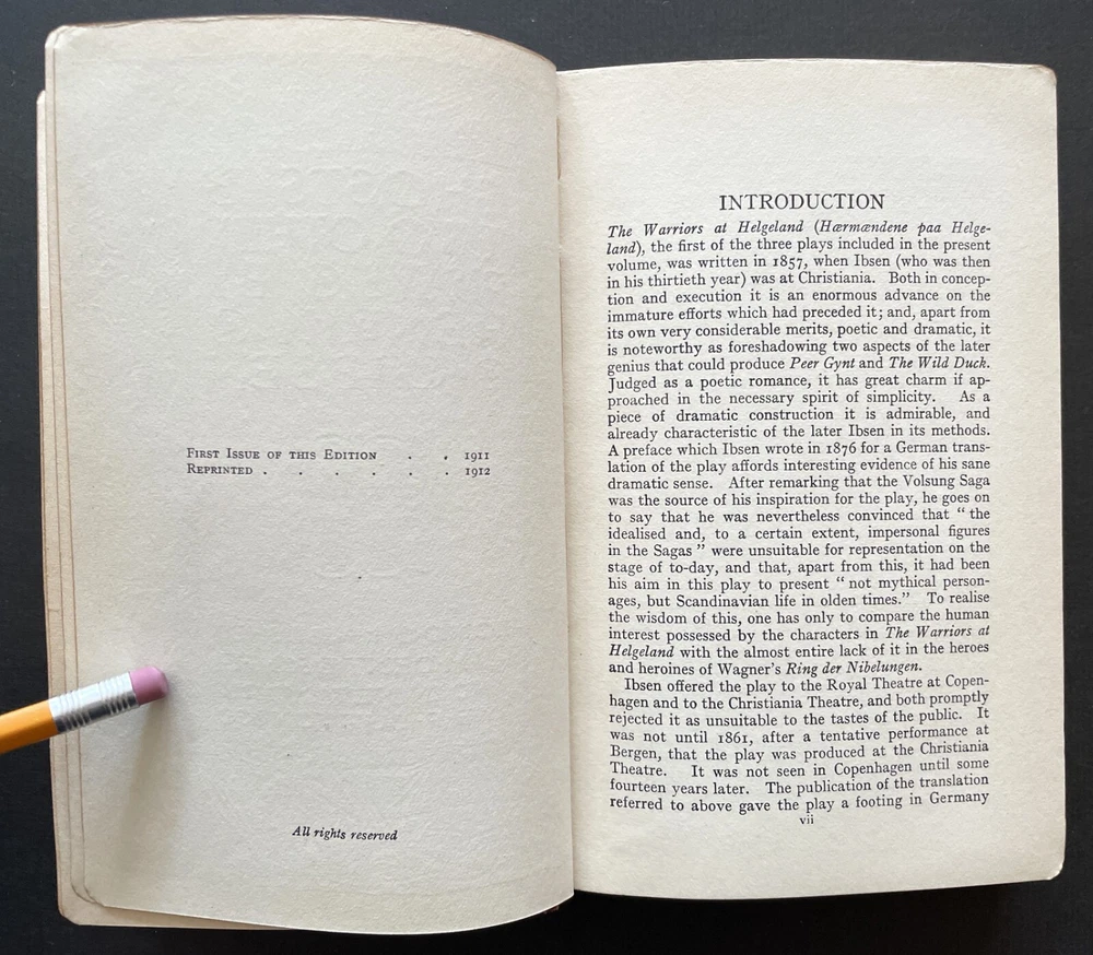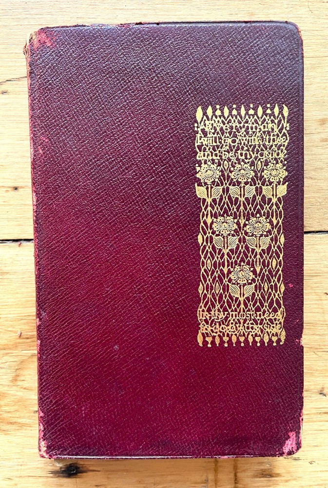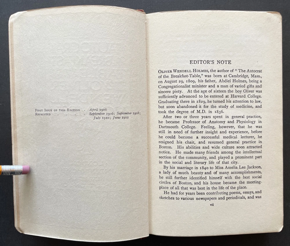 Set of 6 Everyman's Library 1912 - 1913 J. M. Dent & E. P. Dutton Burgundy Leather with decorative gilt spines David Copperfield by Charles Dickens Ghosts and Other Plays by Henrik Ibsen The Autocrat at the Breakfast Table by Oliver Wendel Holmes The Cloister and the Hearth by Charles Reade The Three Musketeers by Alexander Dumas The Poems of Alfred Tennyson Leather rubbed and worn at extremities. Cloister and Hearth front board detached; Three musketeers front board tenuously attached at joint. A couple of books have a prior owner name or bookplate. Books are a mix of 2nd, 3rd and early Everyman editions of these titles. Attractive shelf presence of these early Everyman editions in leather. Worn and Good only