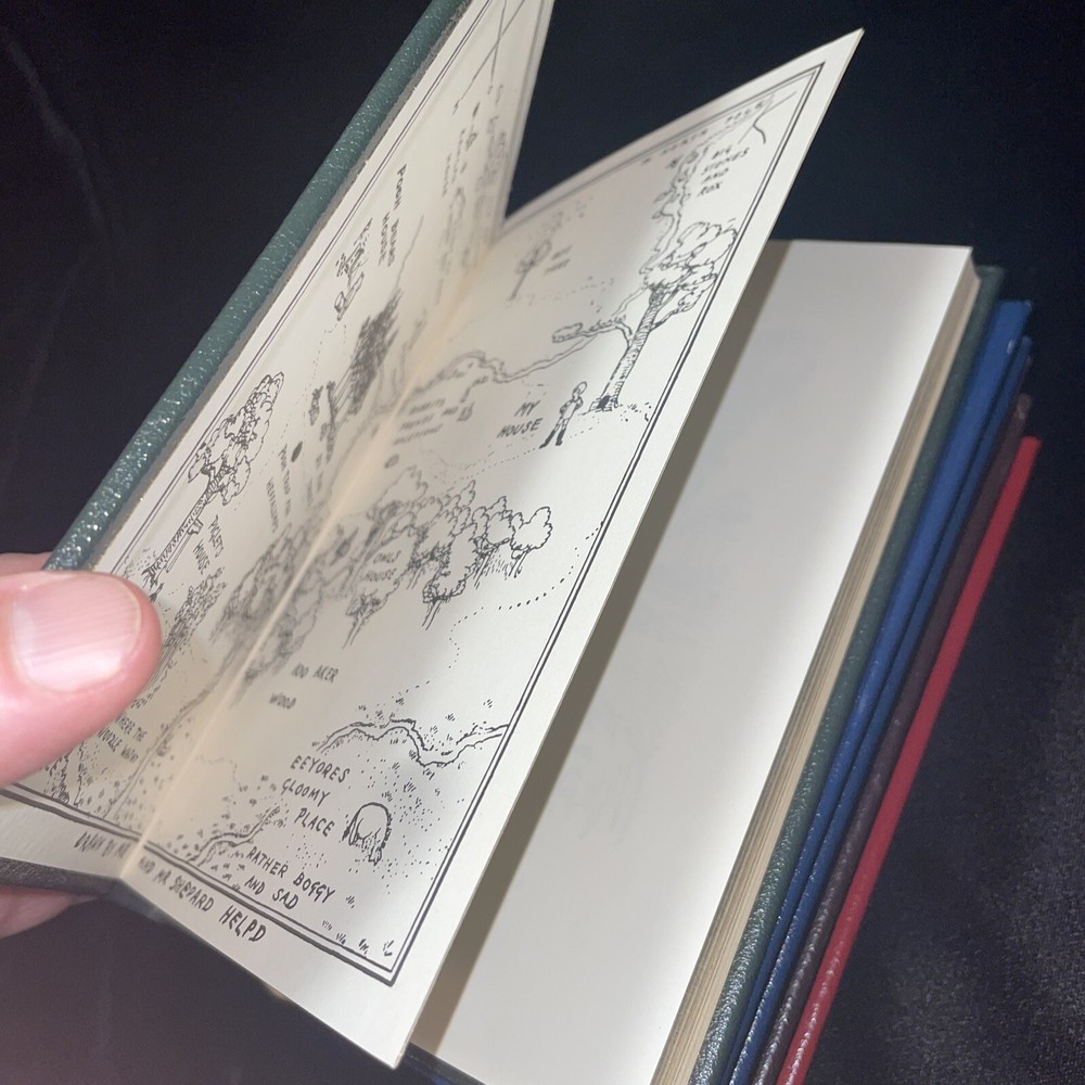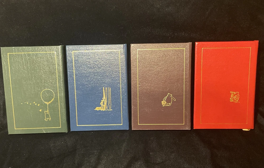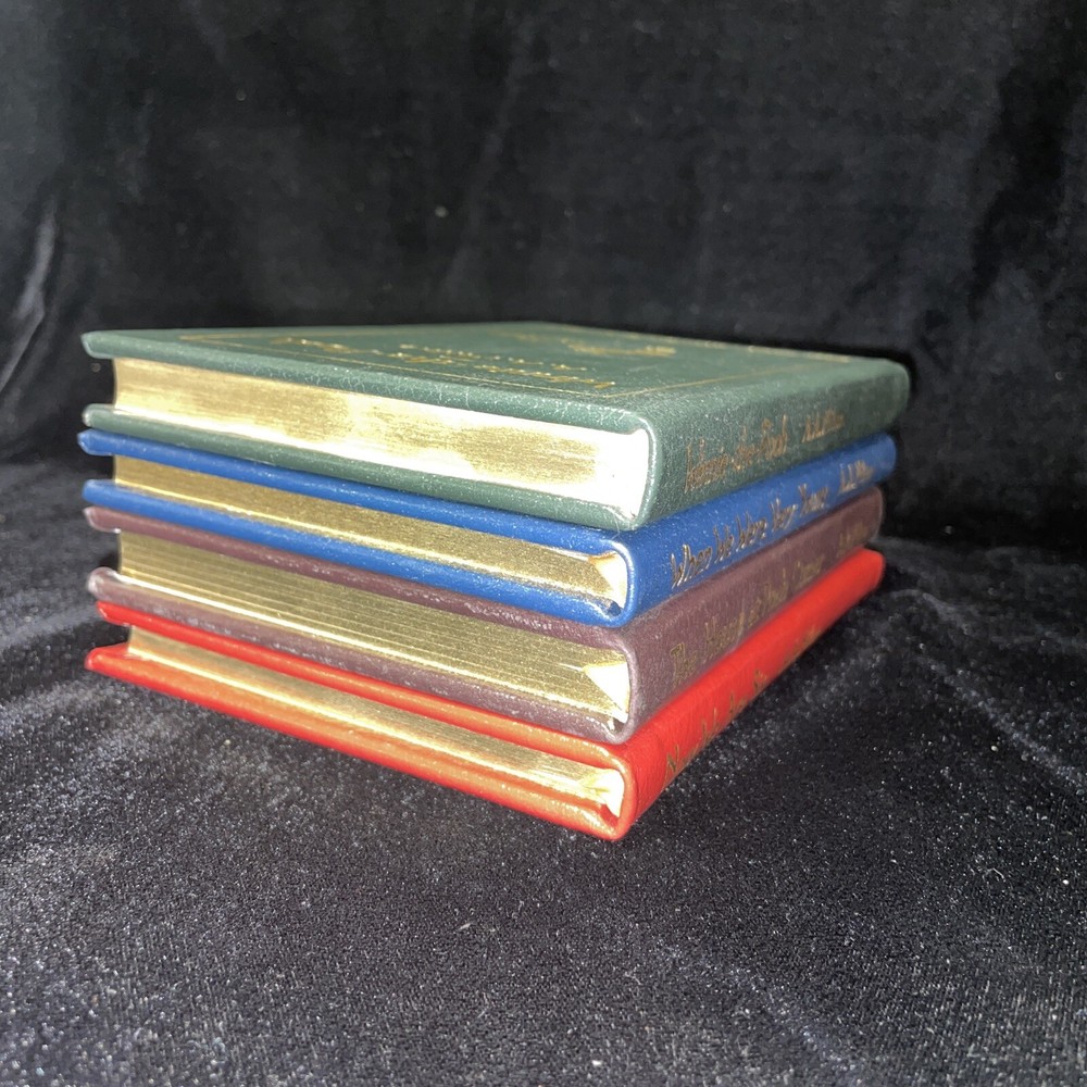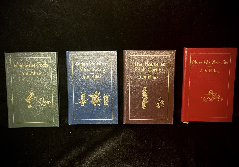 This product is a collector's edition set of A.A. Milne's classic children's books, including "Winnie the Pooh," "Now We Are Six," "When We Were Very Young," and "The House at Pooh Corner." These books are beautifully bound in leather by Easton Press, making them a limited edition set with fine binding. The stories fall under the topic of fairy tales and fantasy, making them a cherished addition to any book collection for fans of children's literature. Like New and never read.