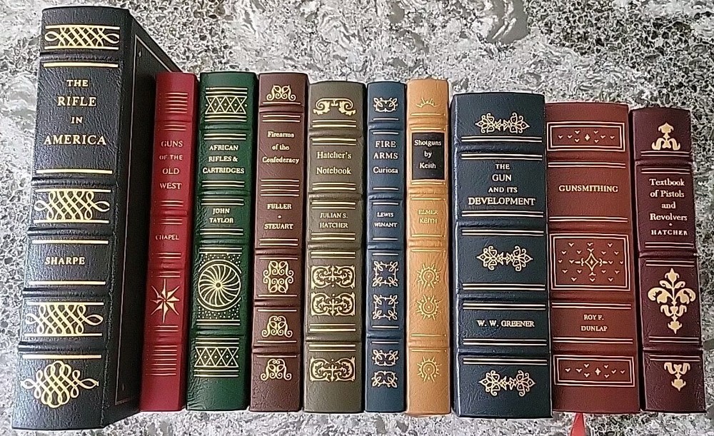 Set of 10 leather-bound Gun History books NRA Classics Library 24K gold embossed THE FIREARMS CLASSICS LIBRARY OF THE NATIONAL RIFLE ASSOCIATION AND ITS NATIONAL FIREARMS MUSEUM PUBLISHED FOR THE NATIONAL RIFLE ASSOCIATION BY ODYSSEUS EDITIONS INC The Rifle in America by Philip B Sharpe Guns of the Old West by Charles Edward Chapel Hatcher's Handbook by Julian S. Hatcher Textbook of Pistols and Revolvers by Major Julian S. Hatcher The Gun and It's Development by W.W. Greener Firearms of the Confederacy by Claud E. Fuller and Richard D. Steuart African Rifles & Cartridges by John Taylor Firearms Curiosa by Lewis Winant Shotguns by Keith by Elmer Keith Gunsmithing by Roy F. Dunlap