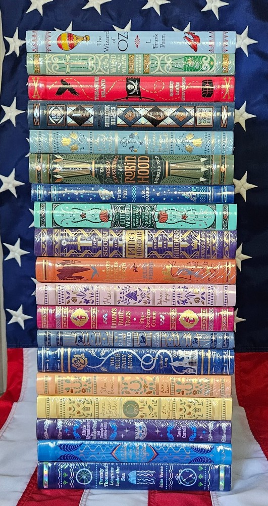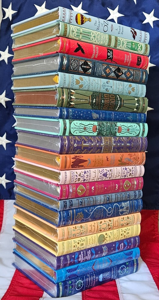 Set of 19 Bonded Leather Kids Books! 1 - Alice's Adventures in Wonderland 2 - The Blue Fairy Book 3 - Peter Pan 4 - Aladdin and the Arabian Nights 5 - The Wizard of Oz 6 - The Secret Garden 7 - The Wind in the Willows 8 - The Little Mermaid 9 - Anne of Green Gables 10 - Black Beauty 11 - Treasure Island 12 - Heidi 13 - Sherlock Holmes 14 - Grimms Fairy Tales 15 - Call of the Wild 16 - Robin Hood 17 - Journey to the Center of the Earth 18 - Twenty Thousand Leagues Under the Sea 19 - Tale of King Arthur Special Bonded Leather Collectible Editions BRAND NEW!! All books are 6.5" W x 8.25" H Item Description These books are brand new and sealed , never read or used in any way, perfect condition. Beautiful gilt lettering on the cover and spine Silver & Gold gilt page edges Satin ribbon book marker attached Bonded Leather bound hardback boards Black Beauty A handsome horse with a glossy black coat and a pretty white star on his forehead, Black Beauty seems to lead a charmed life. Although his mother warns him that there are 'bad, cruel men' in the world, he begins his life in a happy home, with a friendly groom to look after him and plenty to eat. However, when a change of circumstances means that he is sold, he soon discovers the truth of his mother's words. Anna Sewell's moving story is one of the best-loved animal adventures ever written. Anne of Green Gables Brother and sister Marilla and Matthew Cuthbert look forward to meeting the young orphpan boy whom they hope to give a good life to at their Avonlea farm, Green Gables. When they are accidentally sent Anne Shirley instead, they make the most of the orphanage's mistake, and welcome the imaginative girl with loving arms. Under their care and through the friendships she forges at school, Anne enjoys adventures and experiences that teach her how to be loving and caring in return. Heidi Heidi is the timeless tale of the orphan girl Heidi, who lives with her grandfather in the mountains of Switzerland and who brings cheer and comfort into the lives of all who know her. This edition of Johanna Spyri's classic novel features illustrations in full color by Jessie Wilcox Smith. The Secret Garden On the grounds of Misselthwaite, her Uncle Archibald's estate near the Yorkshire moors, nine-year-old Mary Lennox finds a walled-in garden that has been locked securely for years. With the help of Dickon Sowerby, a young local boy who can charm animals, Mary cultivates the garden, an experiences that both improves her health and raises her spirits. Ultimately, the secret garden proves beneficial not only to to Mary, but to her sickly cousin Colin, whom her estranged uncle has locked away in solitude following the death of his beloved wife, Colin's mother. Nurtured with love and tenderness, the secret garden proves it has the power to heal the heart. The Little Mermaid Hans Christian Andersen is one of the world's most popular storytellers, and his fairy tales are among the best-loved works of literature. Readers the world over know his poignant tale of "The Little Mermaid," who sacrifices everything for love, and "Thumbelina," the miniscule maiden who captures the heart of many members of the animal kingdom. Several of Andersen's stories are so well known—among them "The Emperor's New Clothes" and "The Ugly Duckling"—that their titles alone have become meaningful figures of speech. The Little Mermaid and Other Fairy Tales collects seventeen of Andersen's incomparable stories, among them "The Princess and the Pea," "The Red Shoes," "The Wild Swans," and his fantasy masterpiece, "The Snow-Queen." The book is illustrated in full color by W. Heath Robinson. Grab this great addition to your collectible children's books library. The Wind in the Willows First published in 1908, The Wind in the Willows chronicles the adventures of four friends drawn together by their love of the Thames River valley: mild-mannered Mole, refined Ratty, solitary Badger, and irascible and reckless Toad. More than a century after Kenneth Grahame first imagined his tale as bedtime stories to tell his son, The Wind in the Willows remains one of the best-loved classics of children's literature. This edition is illustrated with the full-color art of Nancy Barnhart, reprinted from the book's first American edition . The Wizard of Oz After a cyclone scoops them up with their Kansas farmhouse, Dorothy and her dog Toto find themselves transported to Oz, a magical land that is home to diminutive munchkins, witches wicked and good, flying monkeys, and all manner of marvelous creatures and beings. In the company of friends whom she makes during her stay--a Tin Woodman in search of a heart, a Scarecrow desperate for a brain, and a Cowardly Lion who craves courage--Dorothy seeks out the Wizard of Oz, the only person in the land with the power to return her home. The Wizard of Oz has delighted generations of readers since L. Frank Baum first published it in 1900. Illustrated by W. W. Denslow, whose magnificent art distinguished the first edition of Baum's tale, this special 2013 edition features and elegant bonded-leather binding, a satin-ribbon bookmark, distinctive gilt edging, and pictorial endpapers. It's a book that will be cherished by readers of all ages. Aladdin and Arabian Nights First collected nearly a millennium ago, these folktales are presented as stories that the beautiful Scheherazade tells her husband, King Shahryar, over 1001 consecutive nights. They include some of the best-known legends of eastern storytelling: "The Seven Voyages of Sinbad the Sailor," "The Story of Aladdin; or, The Wonderful Lamp," and "The Story of Ali Baba and the Forty Thieves." This beautiful collection features more than 20 tales plus illustrations in full color and black and white by René Bull. Peter Pan Neverland is home to Peter Pan, a young boy who has never grown up. On one of his visits to London, Peter makes the acquaintance of young Wendy Darling, whom he invites to travel with him to Neverlan