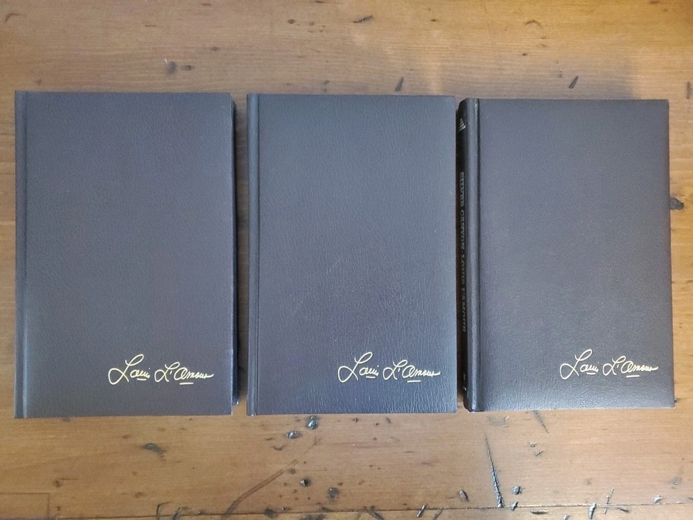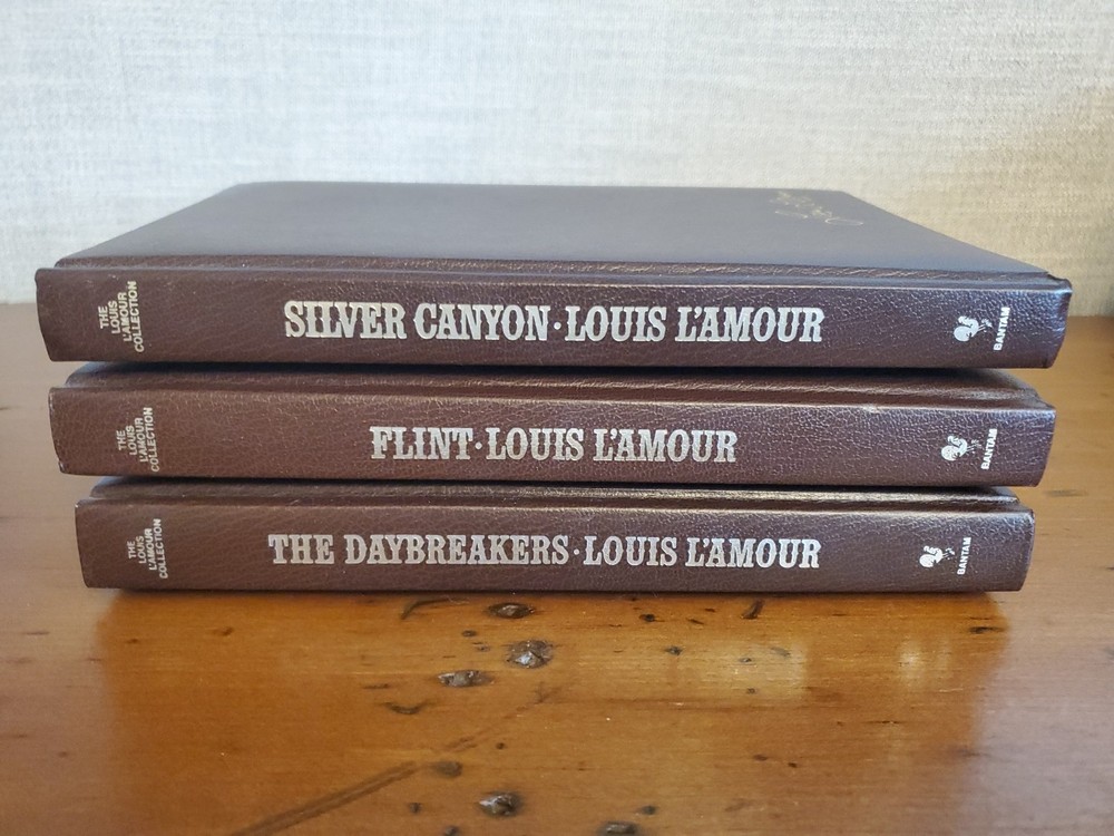 This set of three Louis L'Amour books have never been opened and read. They include "Silver Canyon," "Flint," and "The Daybreakers," and feature faux leather bound hardcovers editions published by Bantam Books in 1981. The books are in excellent condition and offer a great addition to any Western fiction collection. The narratives follow the adventures of Cowboys and Indians in the American West, making them a must-read for fans of the genre. The books are written in English and are intended for an adult audience.