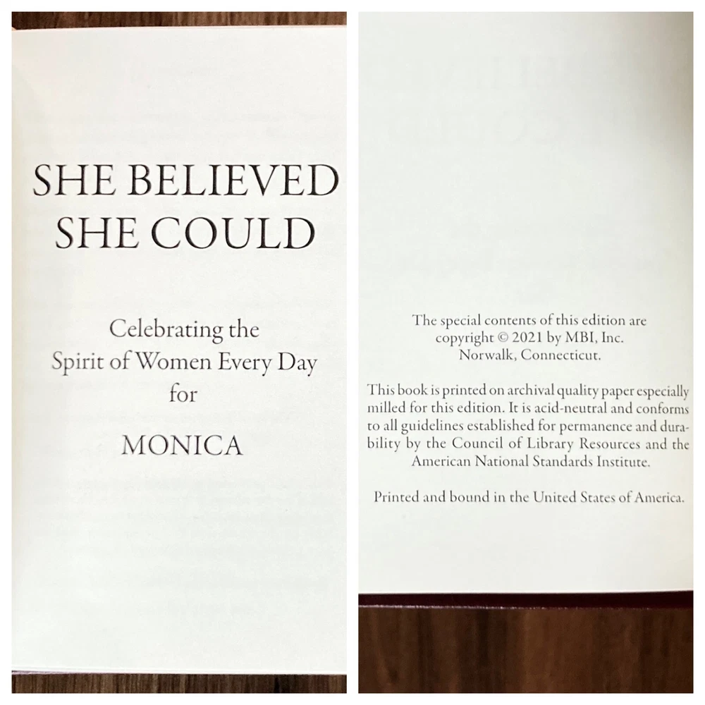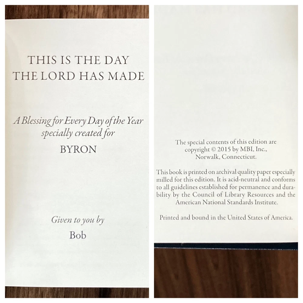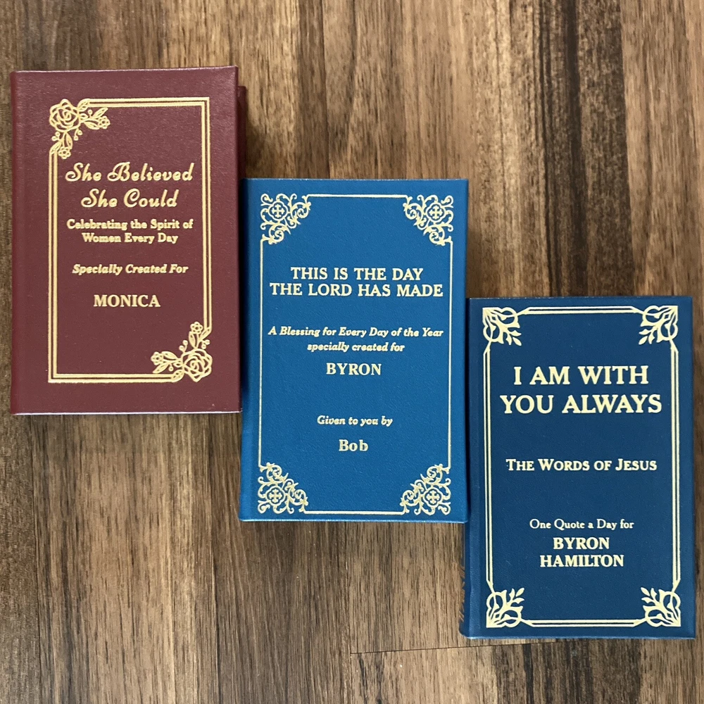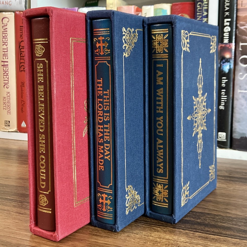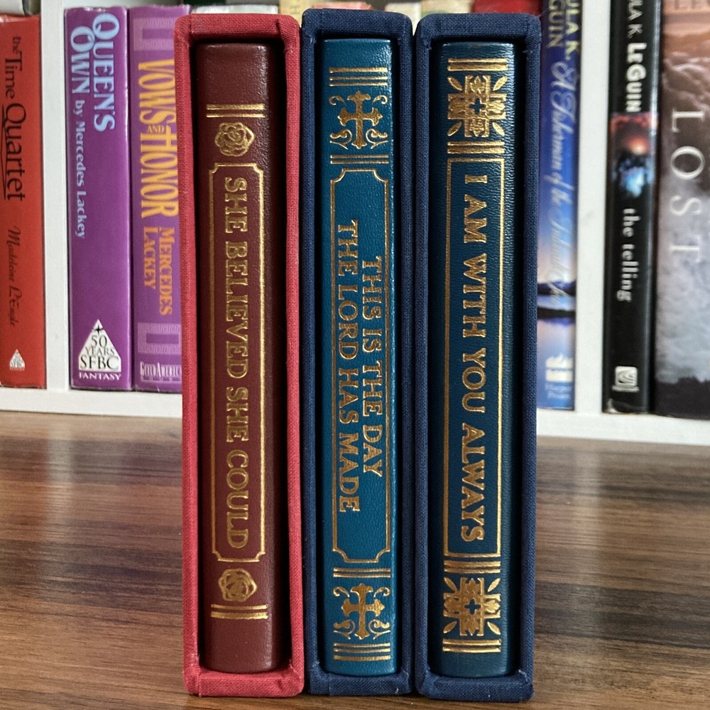 Set of three leather bound Collector’s Edition hardcover Daily Devotional books in cloth-wrapped slipcases (Easton Press, 2015-2021). Set contains: She Believed She Could (2021) / This is the Day the Lord Has Made (2021) / I Am With You Always (2017). All three have personalized gilt lettering to covers and to title pages. A beautiful set with gilt page edges, pictorial covers, decorative endpapers and attached tassel ribbon bookmarks. Mild shelf wear to slipcases. Leather bound covers slightly curved away from text block at fore edge. Binding is firm and spine is straight. All pages clean and unmarked. Possibly unread. See photos for condition. Packaged with care and shipped via USPS Media Mail