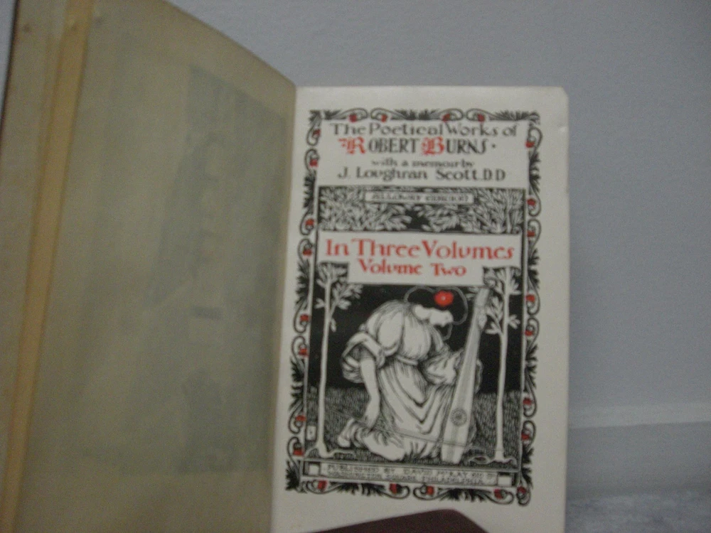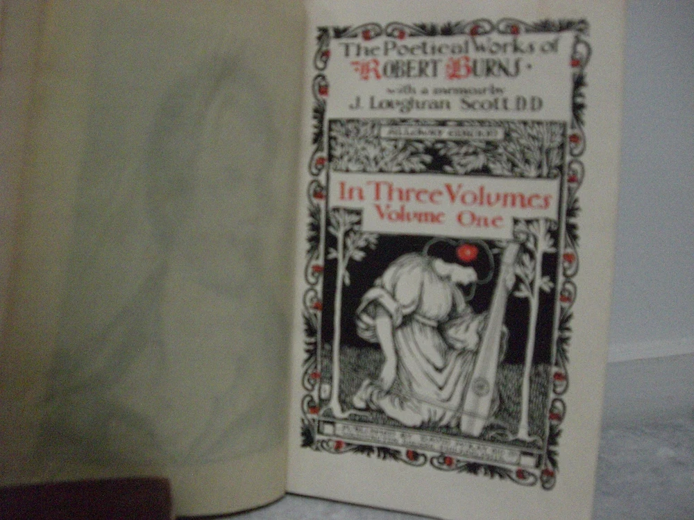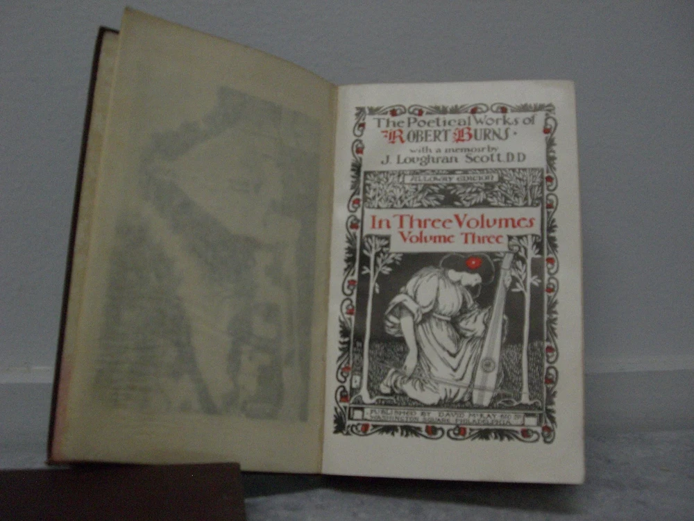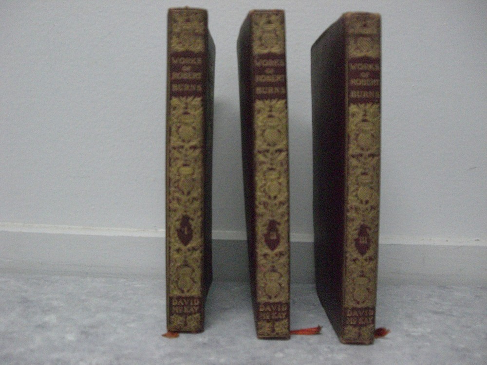 Complete Set of 3 leatherbound volumes of The Works of Robert Burns The Poetical Works of Robert Burns with a memoir by J. Loughran Scott, D.D Alloway Edition in Three Volumes Published by David McKay 610 So. Washington Square Philadelphia Includes complete set of Volumes I, II and III. These books are in fairly good condition, red leather covers show some wear. Inside of Vol I front cover has some tearing. See pictures for condition. Each book is approximately 4" x 6" x 0.75" Free priority shipping.