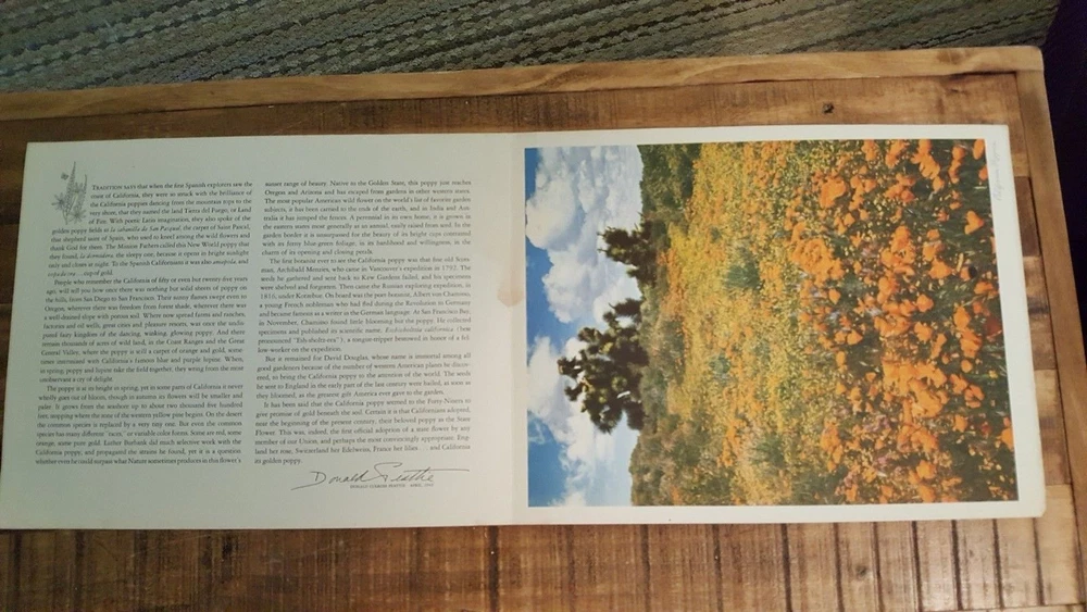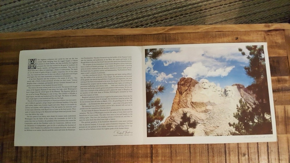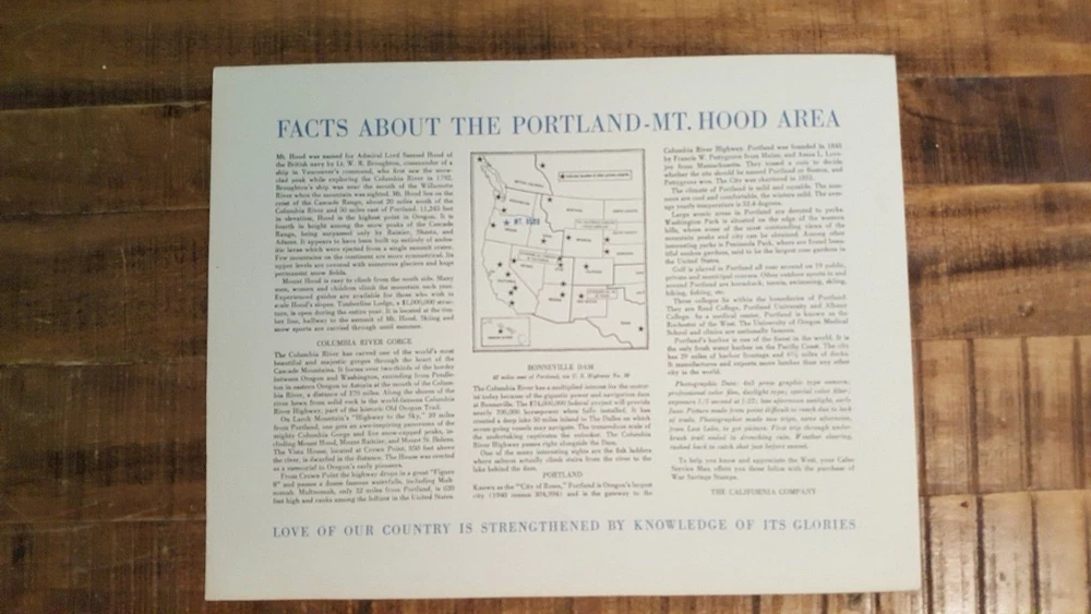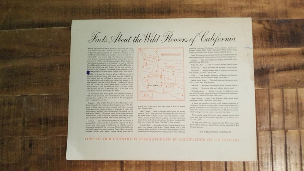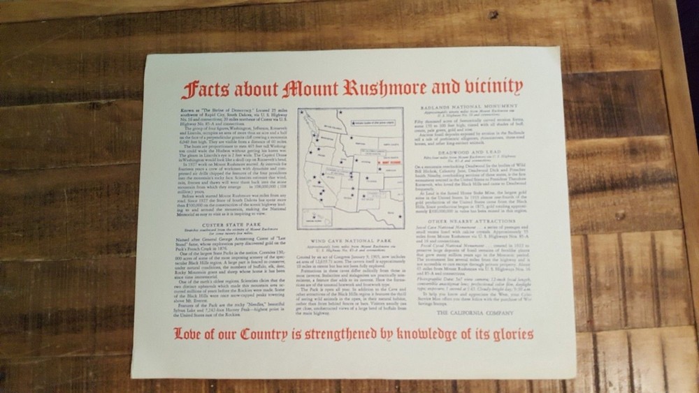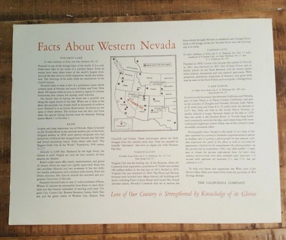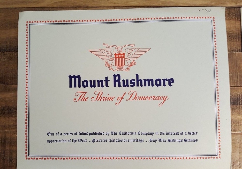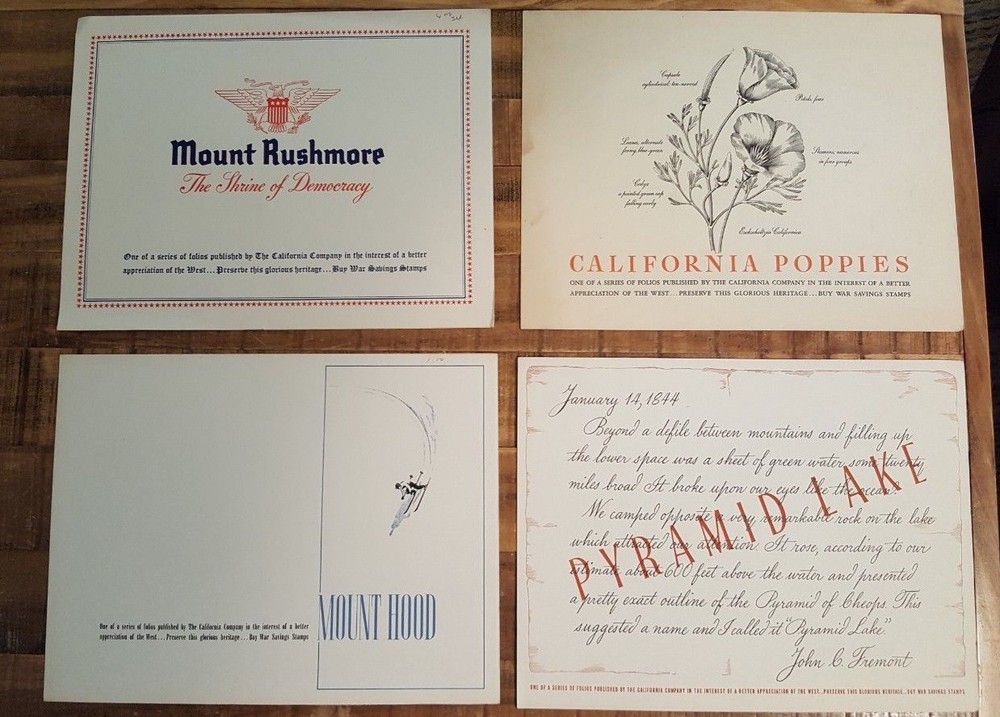 Up for sale is a copy of a set of 4 WWII Folio Prints by THE CALIFORNIA COMPANY. "A Series of Folios Published in the interest of a better appreciation of the West ... Presderve This Glorious Heritage .... Buy War Savings Stamps." Mount Rushmore - The Shrine of Democracy - Mount Hood - California Poppies - Pyramid Lake - Overall, they are in Fair+ Condition. Each soft Pamphlet open into 4 pages - 2 pages front and back. There is age-related toning and browning to them. There are a few nicks/chips along the edges of the pages. Some creased corners. Some other stains, as well. Other dings here and there. Please email with questions and see my store for other great items. Inventory R-Box 336