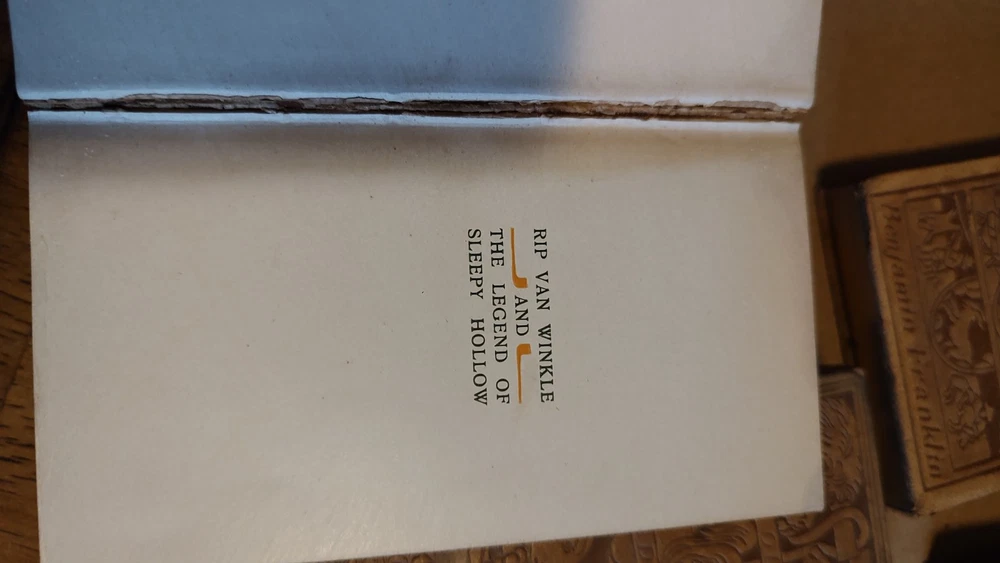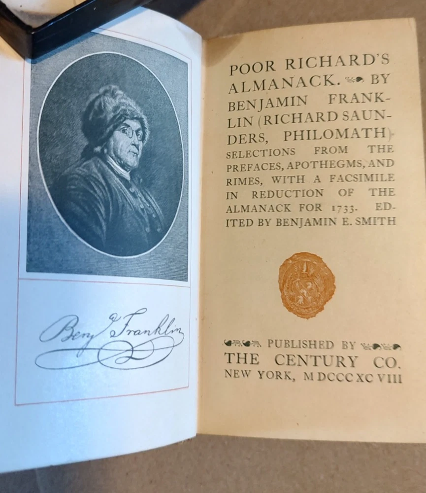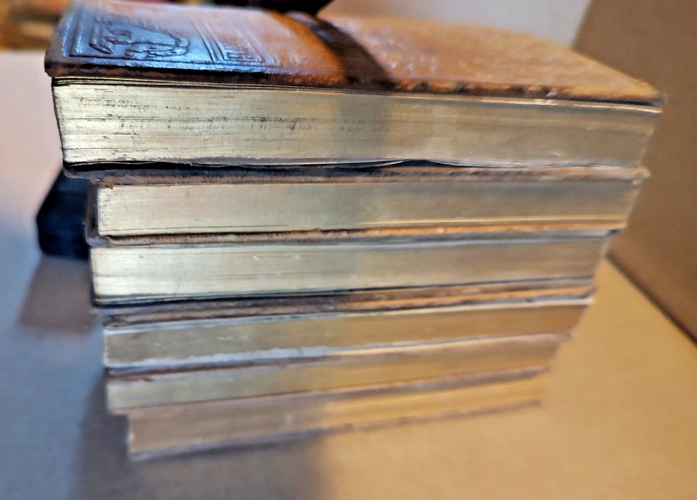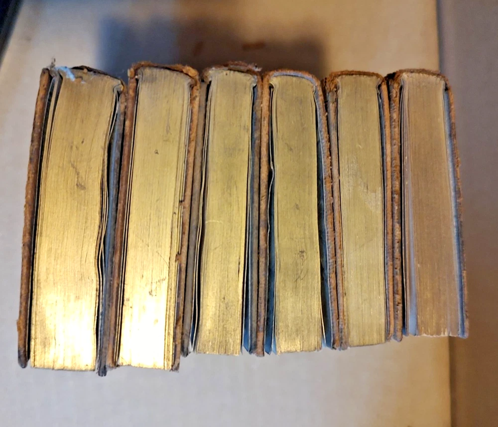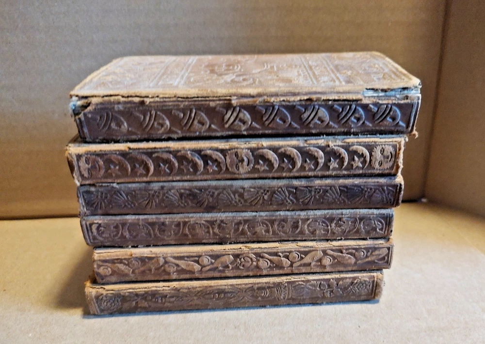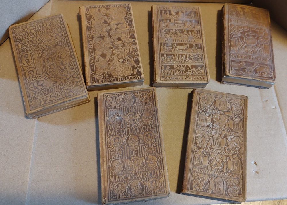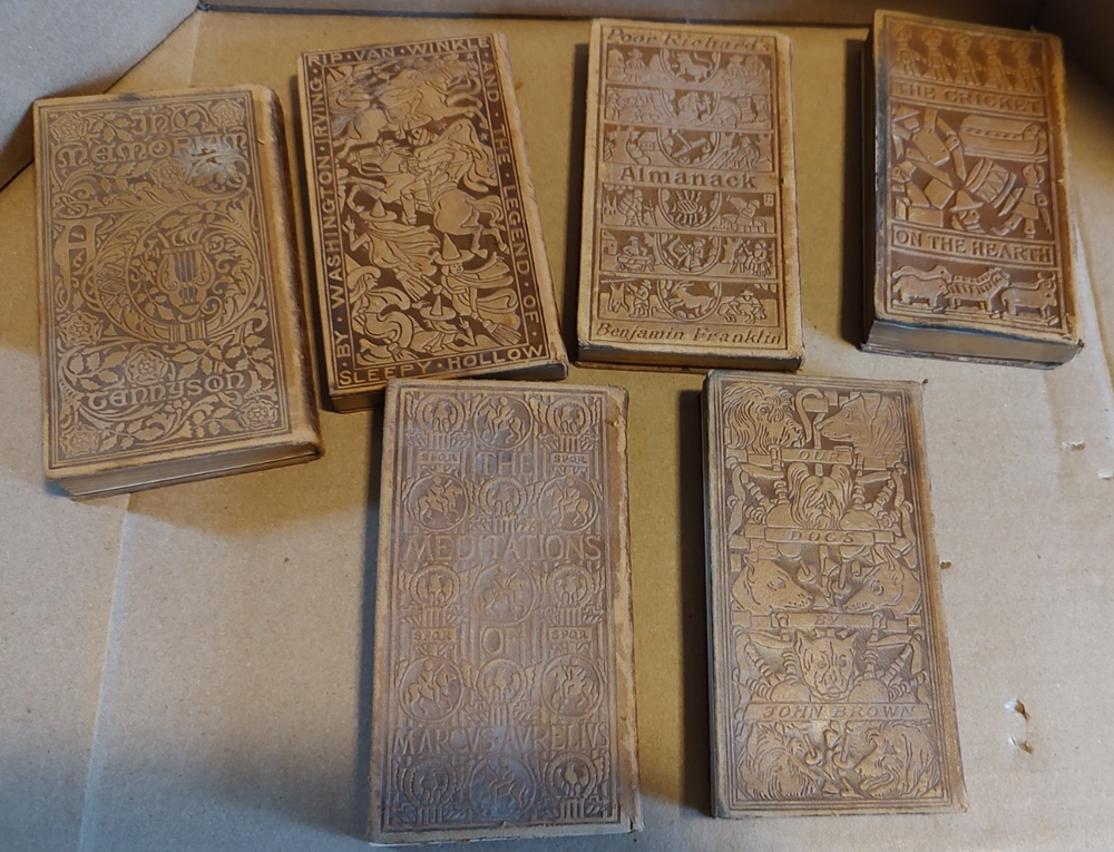 More from my inherited book collection: The Century Company, printed by De Vinne Press, six reprints of classic literature bound in tooled leather with gold gilt page edges. All with varying subjects on the covers and spines. Dates range from 1898 to 1902. Set cosists of: In Memoriam, Tennyson Sleepy Hollow, Rip Van Winkle, Washington Irving The Meditations of Marcus Aurelius Poor Richard's Almanack, Benjamin Franklin Rab and his Friends, Our Dogs, John Brown The Cricket on the Hearth, Charles Dickens Very fancy tooled covers and spines. The books do show some signs of moisture damage and did have some black smudges. The smudges wiped off, for the most part. The Cricket book has the most damage, as seen. See all photos and ask any questions. Each book is 5" by 3". Offers considered. Thank you for looking!