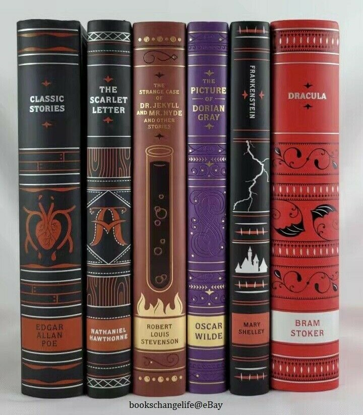 Brand New 6 Flexi bound books set. Gift quality. 1. Dracula by Bram Stoker 2. Frankenstein by Mary Shelley 3. Th Picture of Dorian Gray by Oscar Wilde 4. The Strange Case of Dr. Jekyll and Mr. Hyde and other Stories by Robert Louis Stevenson 5. The Scarlet Letter by Nathaniel Hawthorne 6. Edgar Allan Poe Classic Stories