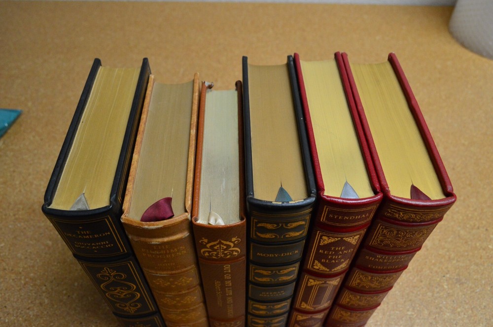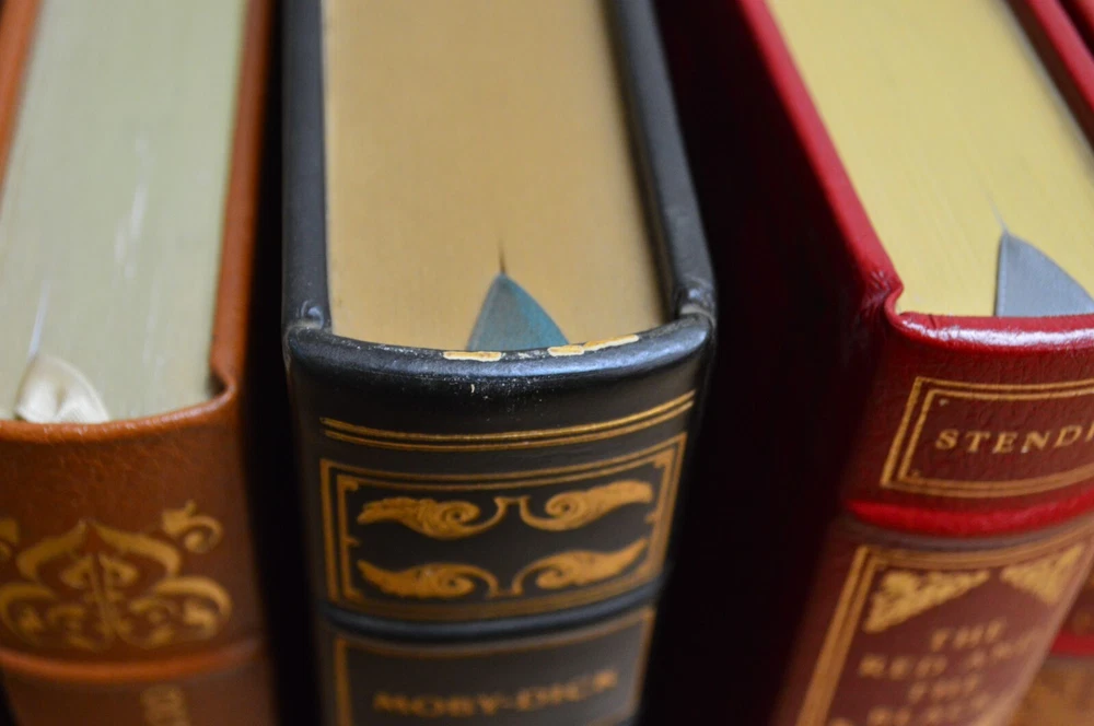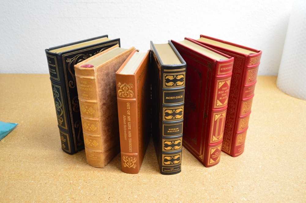 This set of 6 Franklin Library Leather Books are a GREAT DEAL! Each has a small bit of damage or blemish either to the page edges or to a leather edge, but all are full leather and show beautifully on the shelf. See Photos for each books' issue. THIS IS A GOOD OPPORTUNITY TO ADD SOME LEATHER TO YOUR LIBRARY! Great Titles!! Books are: William Shakespeare - Comedies Stendahl - The Red and The Black Melville - Moby Dick Albert Schweitzer - Out of My Life and THought John Bunyon - Pilgrim's Progress Boccaccio - Decameron Franklin was a premium bindery of leather books renowned for their fine craftsmanship from the 1970's to 2000 . There were numerous styles produced - from full leather bindings to quarter-bound leather - where only the spines were leather - to faux leather-look. These are the real deal - the full leather with a sumptuous shelf presence. Each book is bound in a signature color, and exhibits gold foil stamping of the titles and jacket designs. They are printed on archival quality acid-neutral paper and include silk moire endpapers, an expensive hubbed spine, bound-in silk ribbons bookmarks, gilded page edges, Smyth-sewn pages for strength and durability and often contain beautiful illustrations. ~~~~~~~~~~~~~~~~The Fine Print~~~~~~~~~~~~~~~~: At Rarified Books, we take pride in offering items of extraordinary quality, value and condition. We offer the finest in modern leather-bound books and more. Books are sourced from smoke free homes, and are carefully inspected. Other items are equally carefully sourced ... check out our other listings and see! All descriptions are to the best of our knowledge. Sales are made as-is and no warranty is offered as to authenticity or provenance. Title passes to the buyer upon shipment. All sales are final. Sales tax may apply which is collected automatically by eBay. Returns are not accepted except in rare circumstances upon agreement. Shipping is the responsibility of the buyer unless otherwise noted or agreed. Books are wrapped and protected in bubble wrapping for shipping, with additional cushioning paper filler in an appropriately sized carton or padded envelope. Most books will be shipped via USPS Media Mail with tracking or FedEx Home Delivery. International Shipping through eBay's Global Shipping Program only. International buyers are responsible for all local customs fees, taxes, and duties. These charges are not included in our shipping costs. We also buy books and are always open to purchasing excellent condition books from Easton Press, Franklin Library, Folio Society and similar as well as other rare and collectible books. See our website www.modernleatherbooks.com and let us know what you have. Thank you for considering our listing!
