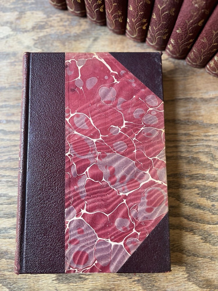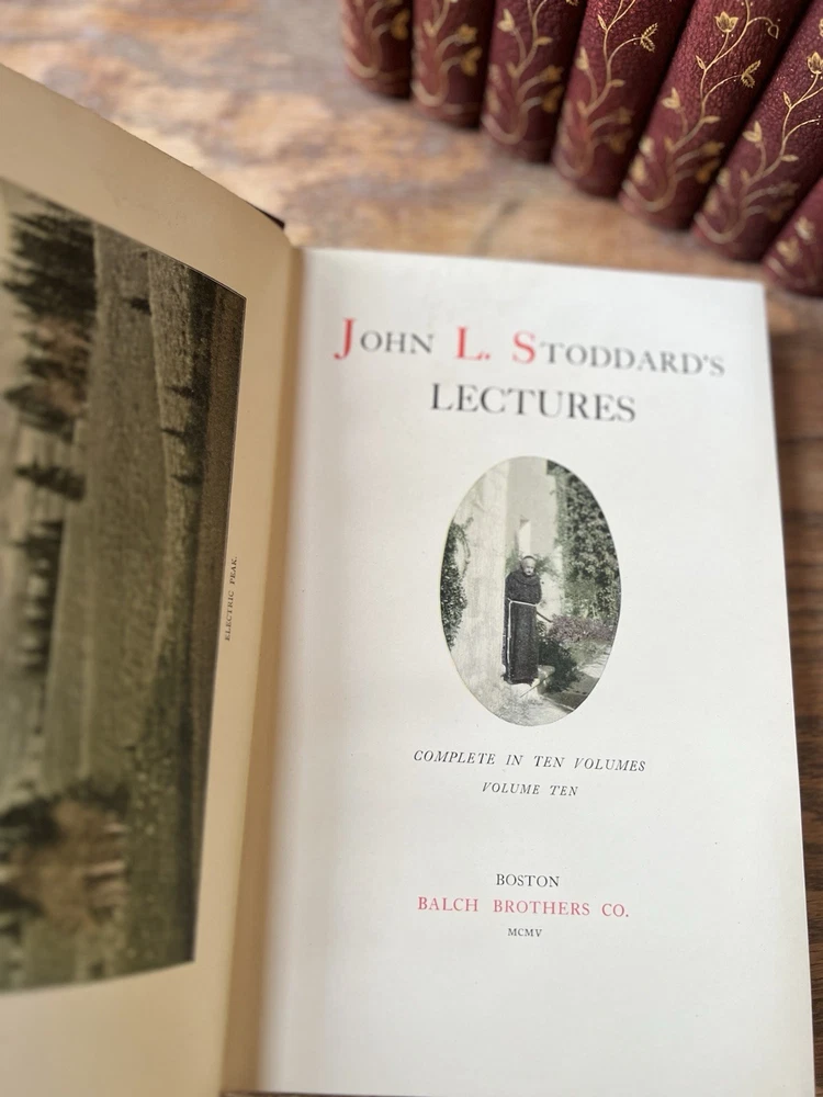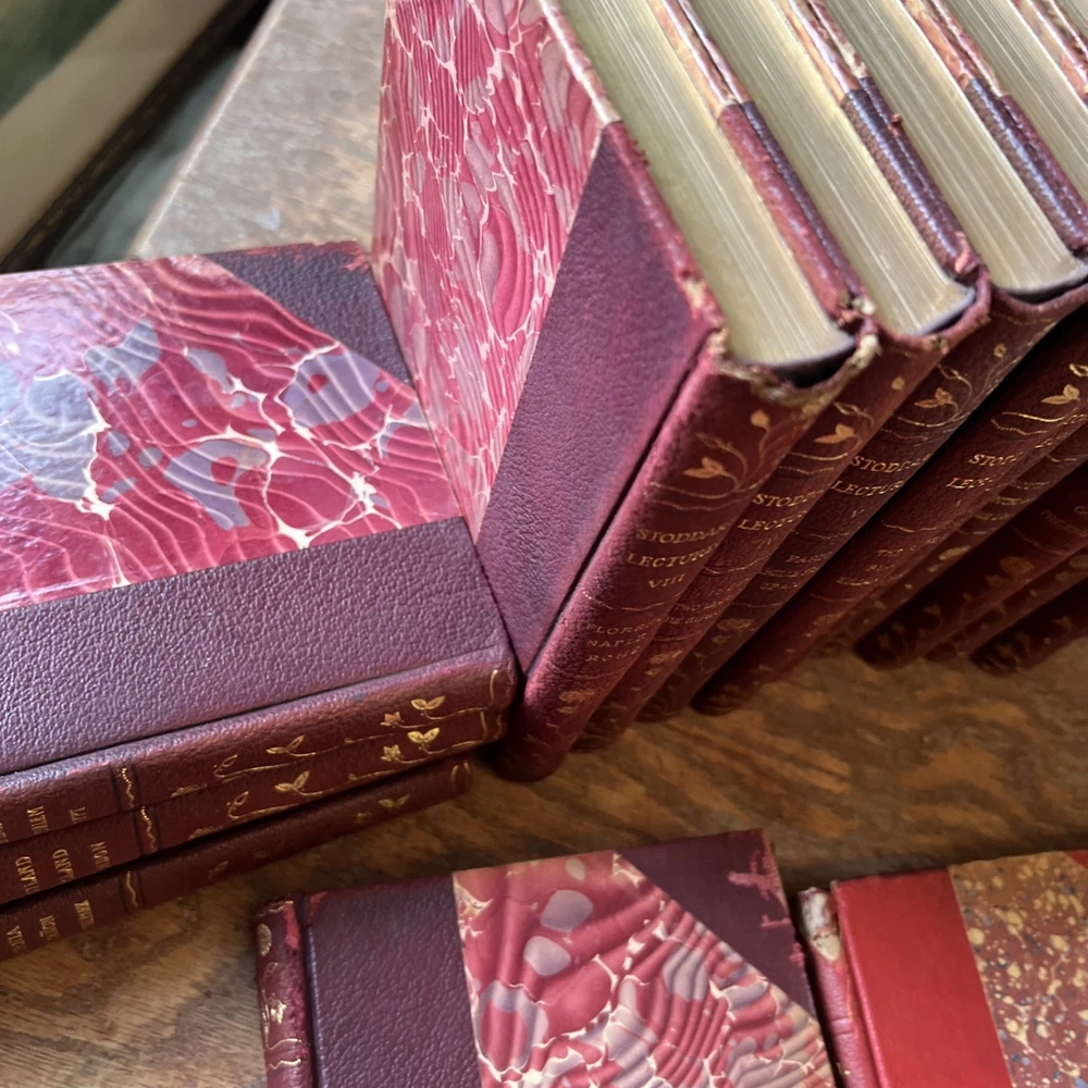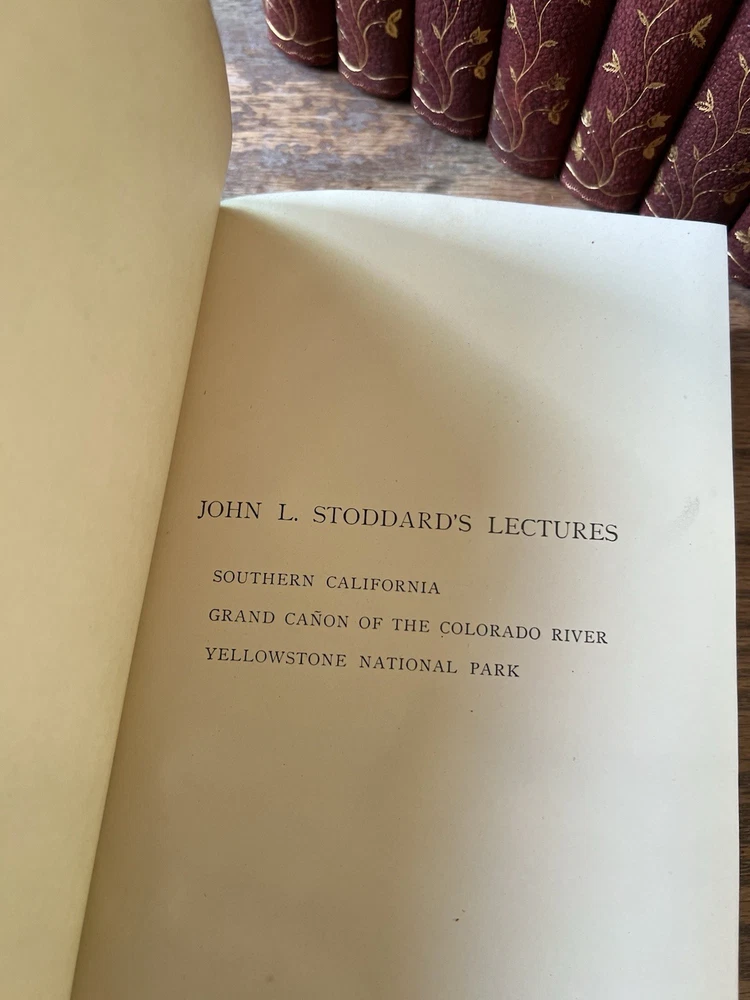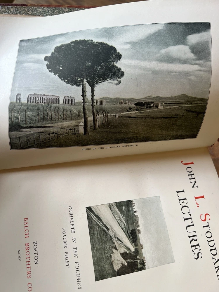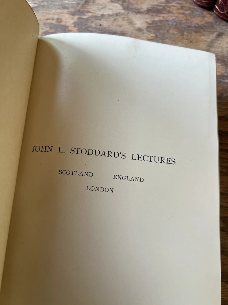 Four or five volumes. Red marbled, hardback volumes, with 3/4 red Morocco leather, guild tooling on spine and gilt edged top edge. This set of five randomly chosen travel books by John L Stoddard offers a glimpse into the world of exploration and travel during the early 1900s. The gilt-edged antique leather bindings add to the aesthetic appeal of these original books, making them a great addition to any collector's library. The books were published by Balch Brothers and cover various topics related to travel and exploration. The language used in the books is English, and they were printed in 1905. I have 14 volumes out of original set, and will sell five volumes in first two sales, and the third sale will be four volumes. The volumes are clean inside, and still securely bound. Not ex-llibrary. There is rubbing and wear at all edges, and there is a slight musty old Book smell. These are true turn of the century antiques and would look good at the top of your bookcase or stacked on a shelf. The books describe with text and photographs and illustrations the authors travels to the following locations: Berlin Vienna, St. Petersburg, Moscow, Constantinople, Jerusalem, Egypt, Scotland, England, London, California, Grand Canyon, Yellowstone Park, Florence Naples, Rome, India, Paris, Spain, France, the rain, Belgium, Holland, Mexico, Norway, Switzerland, Athens, Venice, South Tyrolia, the dolomites Lake Garda, Sicily Genoa, Canada, Malta, Gibraltar, Ireland, Denmark, Sweden, Scotland, England, London The original set included 10 volumes plus a supplement. The last book volume nine was published from a separate set. The marbling is somewhat different than the marbling on the other 13 volumes.