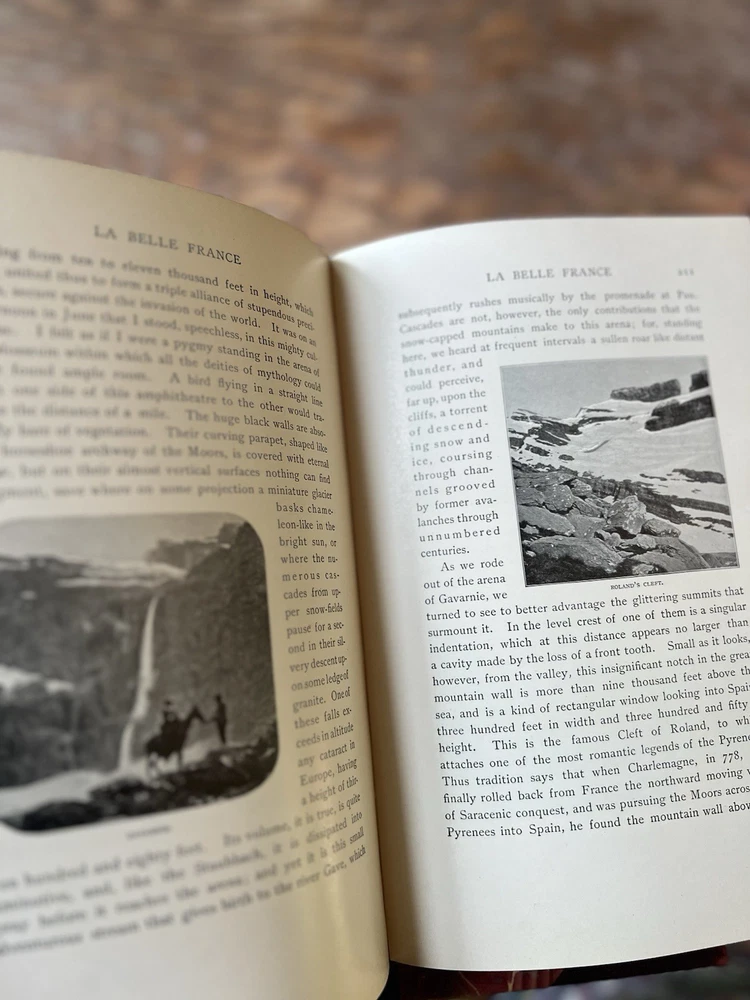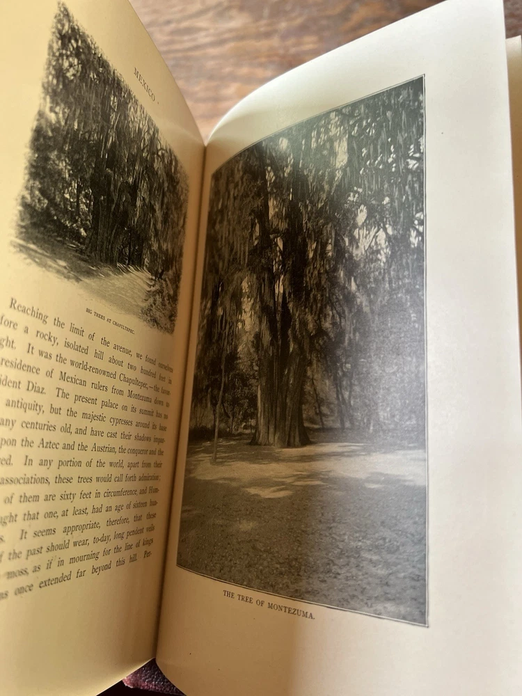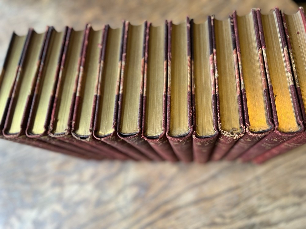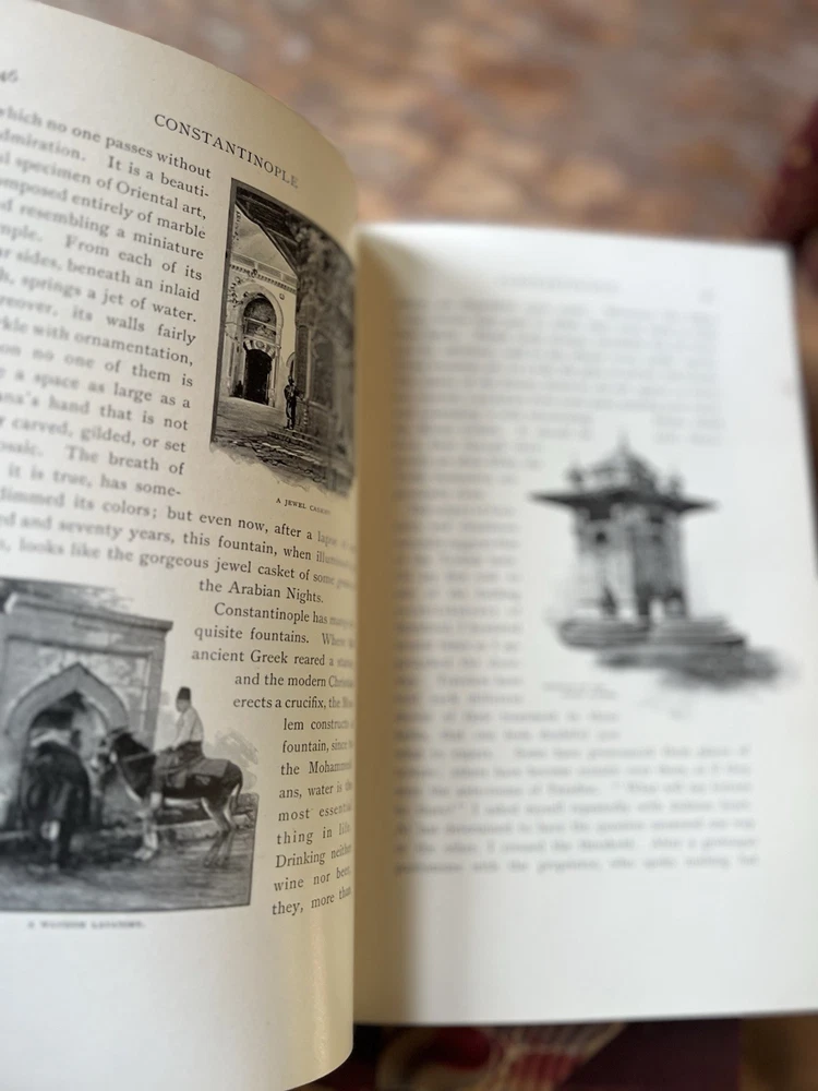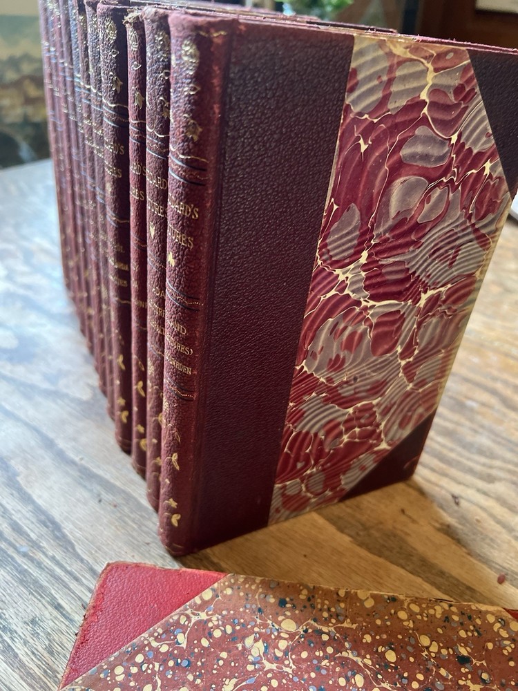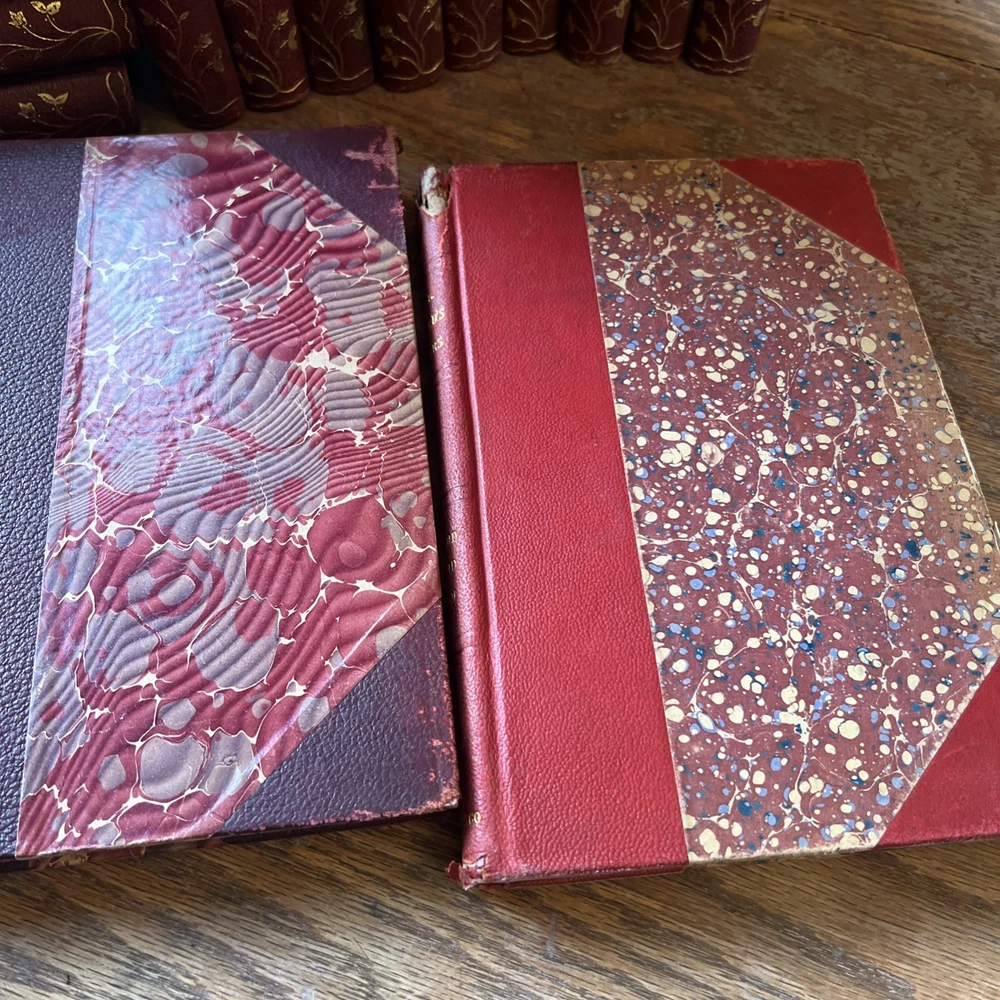 Four or five volumes. Red marbled, hardback volumes, with 3/4 red Morocco leather, guild tooling on spine and gilt edged top edge. This set of five randomly chosen travel books by John L Stoddard offers a glimpse into the world of exploration and travel during the early 1900s. The gilt-edged antique leather bindings add to the aesthetic appeal of these original books, making them a great addition to any collector's library. The books were published by Balch Brothers and cover various topics related to travel and exploration. The language used in the books is English, and they were printed in 1905. I have 14 volumes out of original set, and will sell five volumes in first two sales, and the third sale will be four volumes. The volumes are clean inside, and still securely bound. Not ex-llibrary. There is rubbing and wear at all edges, and there is a slight musty old Book smell. These are true turn of the century antiques and would look good at the top of your bookcase or stacked on a shelf. The books describe with text and photographs and illustrations the authors travels to the following locations: Berlin Vienna, St. Petersburg, Moscow, Constantinople, Jerusalem, Egypt, Scotland, England, London, California, Grand Canyon, Yellowstone Park, Florence Naples, Rome, India, Paris, Spain, France, the rain, Belgium, Holland, Mexico, Norway, Switzerland, Athens, Venice, South Tyrolia, the dolomites Lake Garda, Sicily Genoa, Canada, Malta, Gibraltar, Ireland, Denmark, Sweden, Scotland, England, London The original set included 10 volumes plus a supplement. The last book volume nine was published from a separate set. The marbling is somewhat different than the marbling on the other 13 volumes.