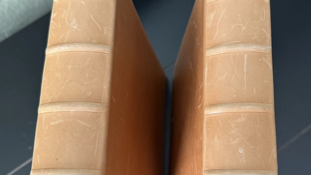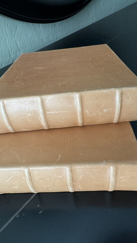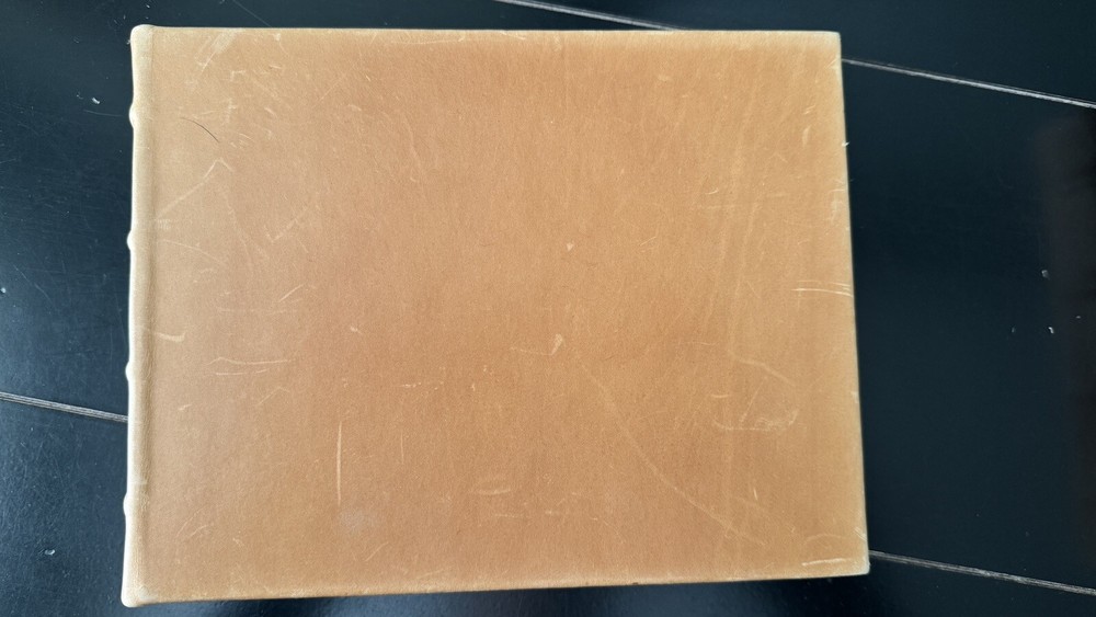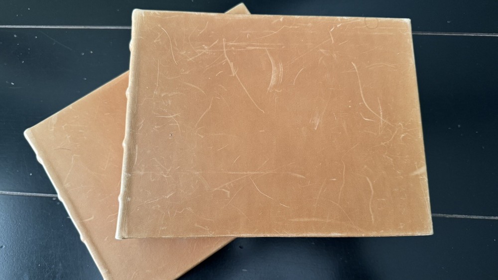 This set of two leather-bound photo albums is the perfect addition to any camera collection. Made with high-quality materials, these albums are designed to securely store and display your favorite photos. The stylish leather design adds a touch of elegance to your photos, making them a great gift for any occasion. 8 1/4 x 6 1/4 x 1 3/4. Leather shows some scarring but otherwise an excellent condition. Comes from smoke-free home.