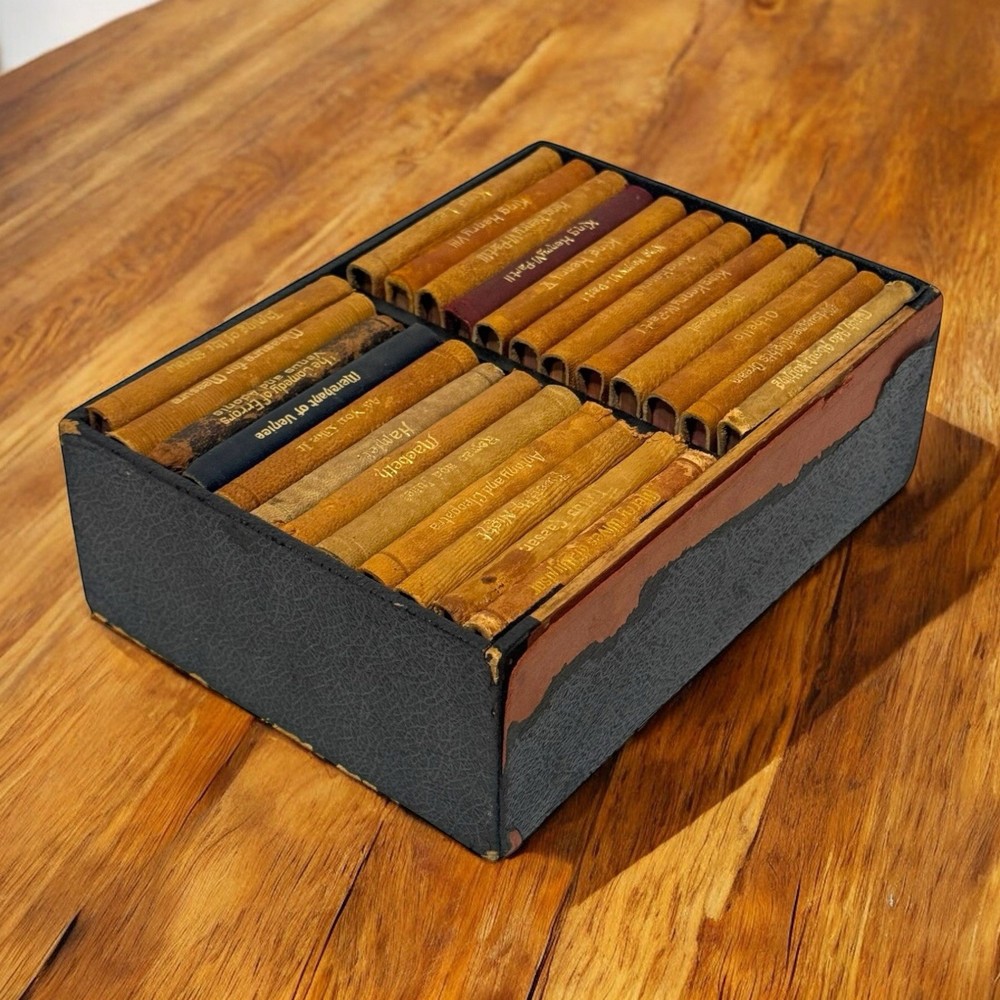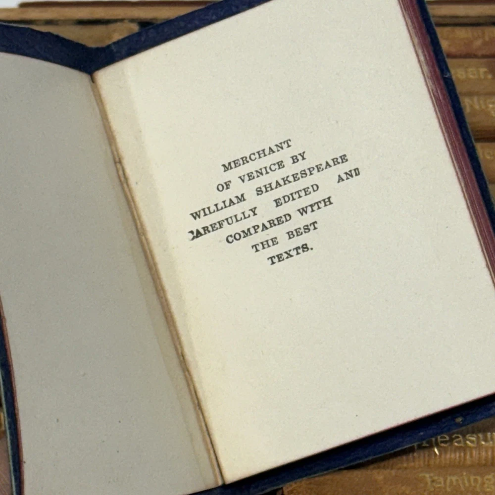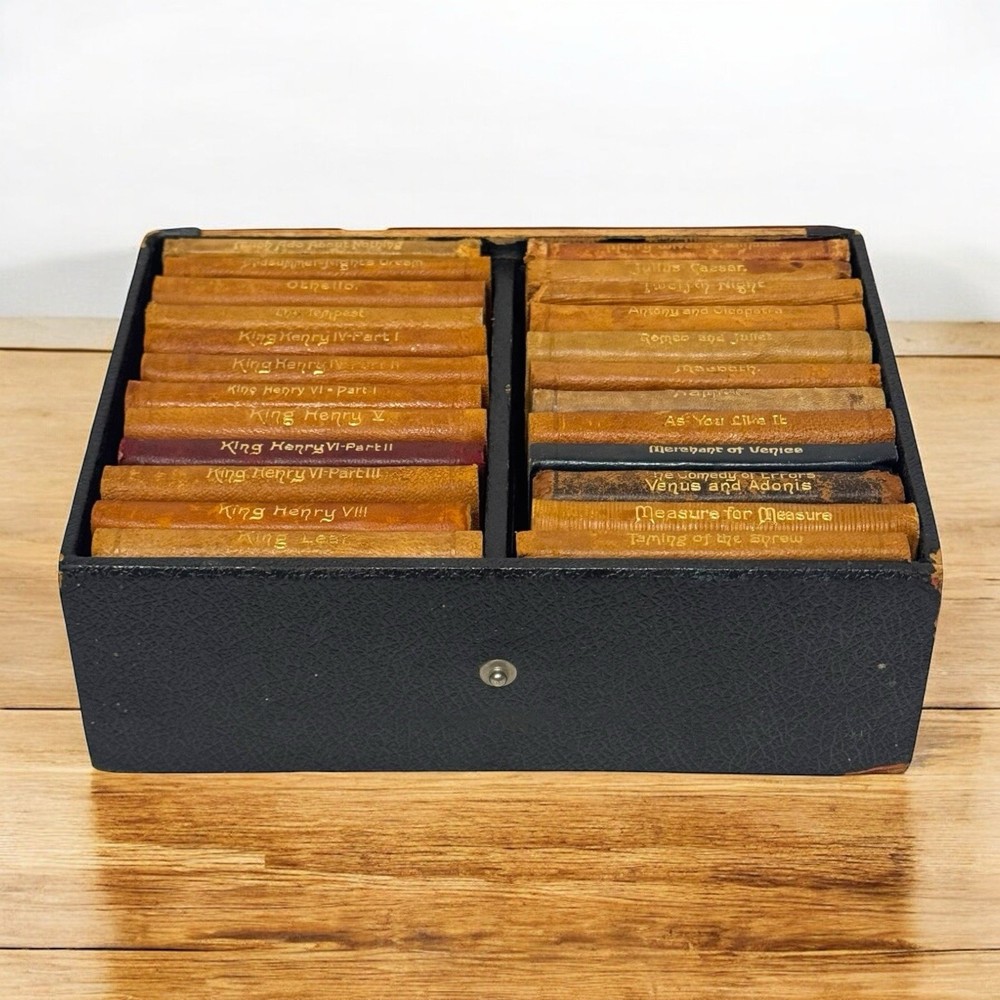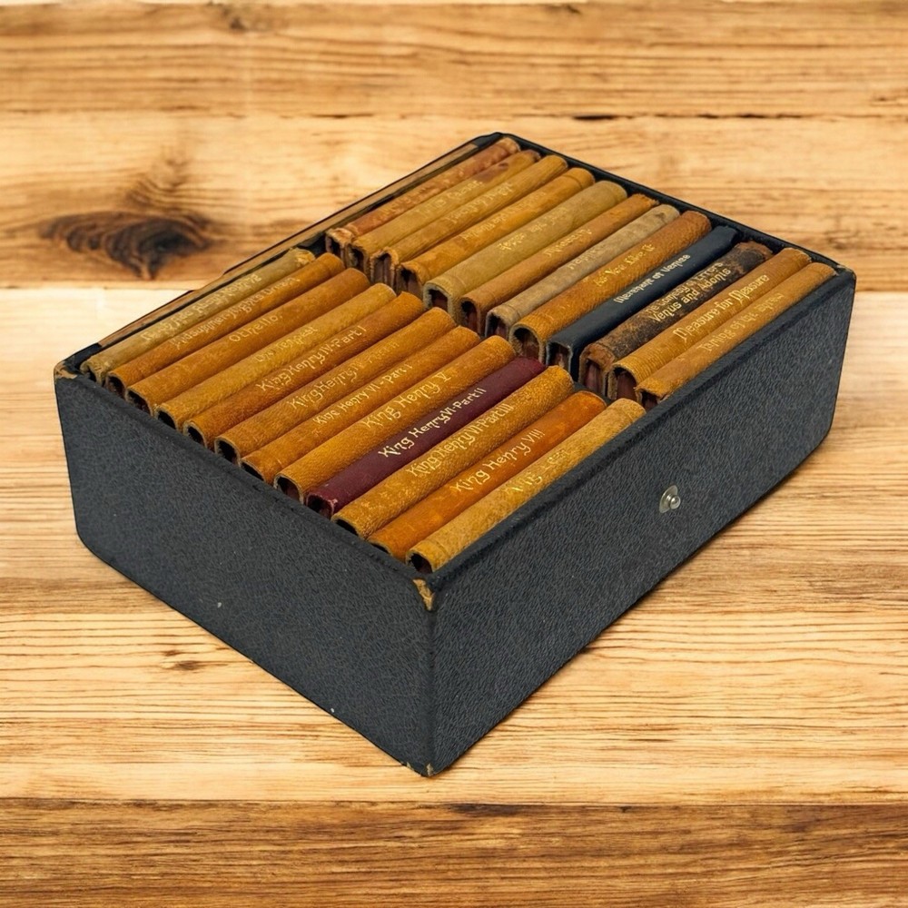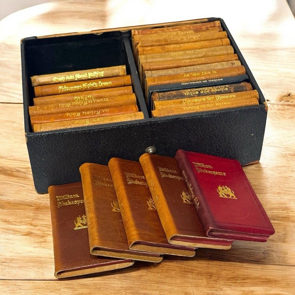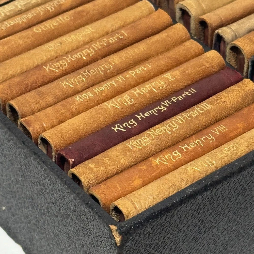 This product is a special collector's edition set of 24 miniature leather books containing the complete works of William Shakespeare, published by KNICKERBOCKER. The books are bound in leather and come in their original box (missing lid), making them a unique and valuable addition to any book collection. Perfect for literature enthusiasts and Shakespeare fans alike, these miniature books are a beautifully crafted and timeless piece of literature history. Please see pictures for condition and description.