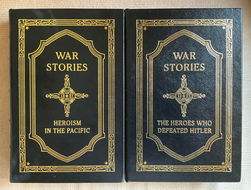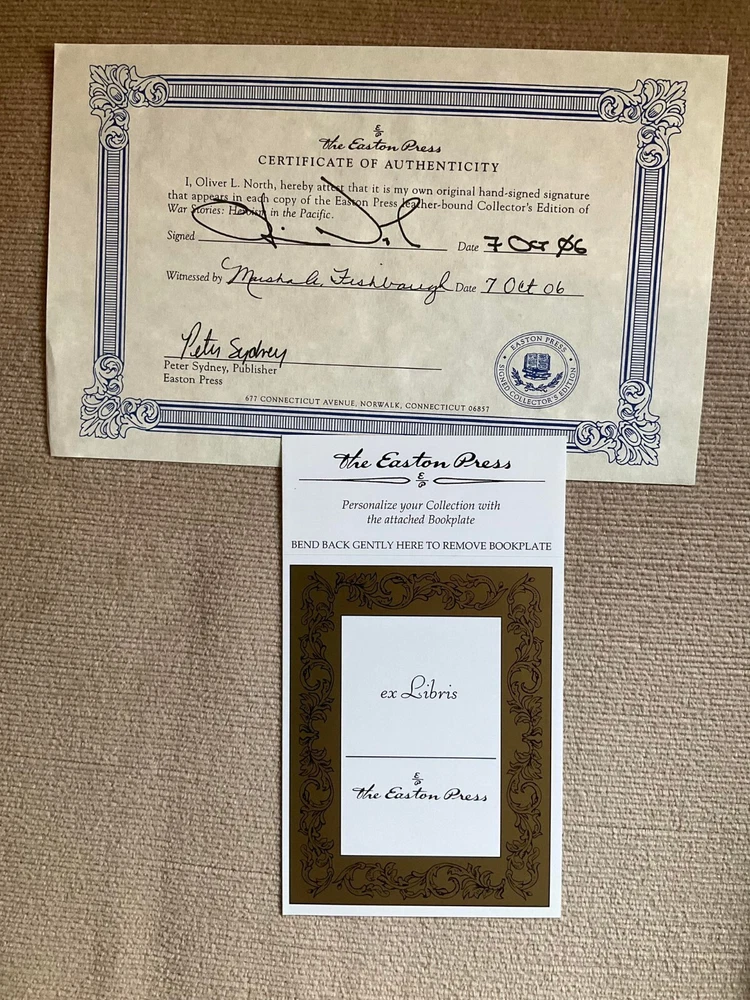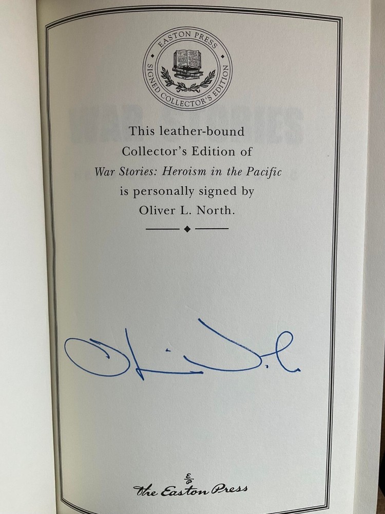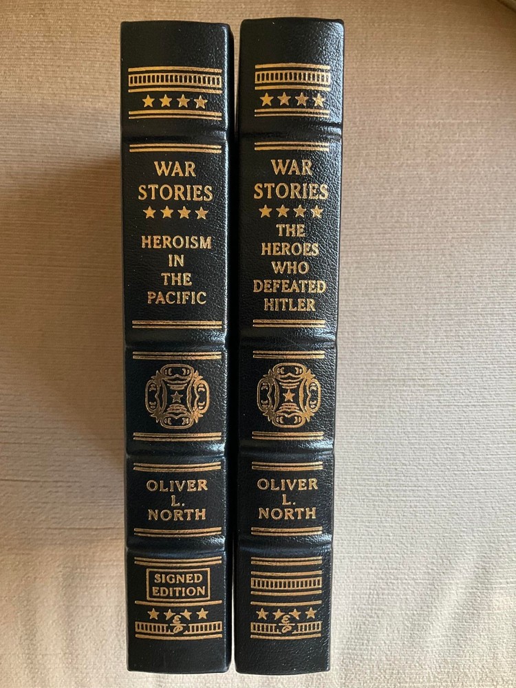 Attention Collectors!!! You are bidding on two beautiful, matching hardcover books titled War Stories by Oliver North. One it subtitled Heroism In The Pacific, and the other is subtitled The Heroes Who Defeated Hitler. The book titled Heroism In The Pacific is signed by the author, Oliver North. These books are from The Easton Press. These are gorgeous hardcover books from the Collector's Edition bound in Genuine Leather. The books remain in near-fine condition. They have just a couple of tiny scratches to the gilt fore-edge. They come with blank Easton Press bookplates waiting to be affixed. Books feature full leather covered boards with raised bands on the spine with gilt text and decorations stamped in the compartments and with gilt 22 karat gold tool work on both the front and rear boards. Silk ribbon sewn-in book marker at the head of the spine. All three edges of the text block are in gilt. These are beautiful, tight, clean books. Easton Press books are for people for whom the literary experience is enhanced by beholding, touching, and smelling magnificently-crafted masterpieces of literature. They become cherished books of a collection. Very beautiful and collectible! Would make a terrific addition to a collection. (Inventory: Box 29-A) Track Page Views With Auctiva's FREE Counter