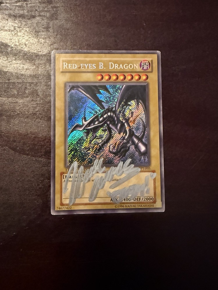 Red-Eyes B. Dragon signed by Joey Wheeler’s DUB voice actor Wayne Grayson. Front in great condition, heavy wear on the back. From 2002 Collectors Tin (BPT-005)
