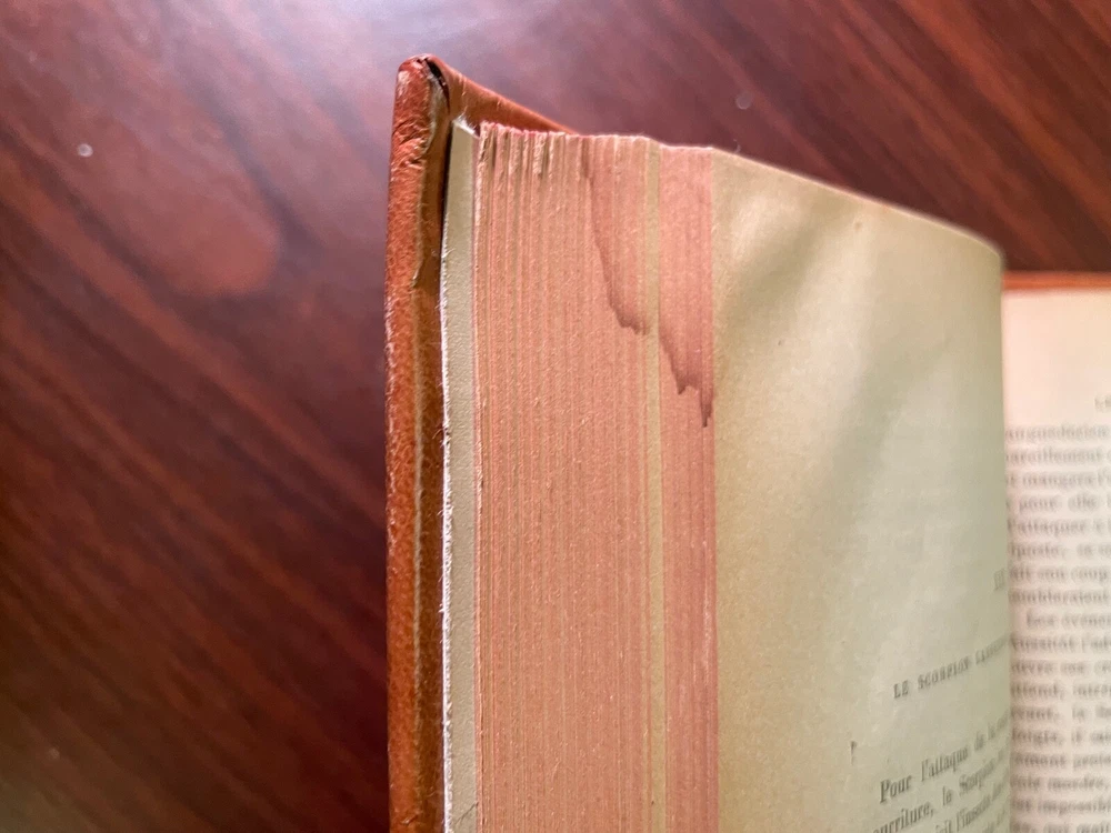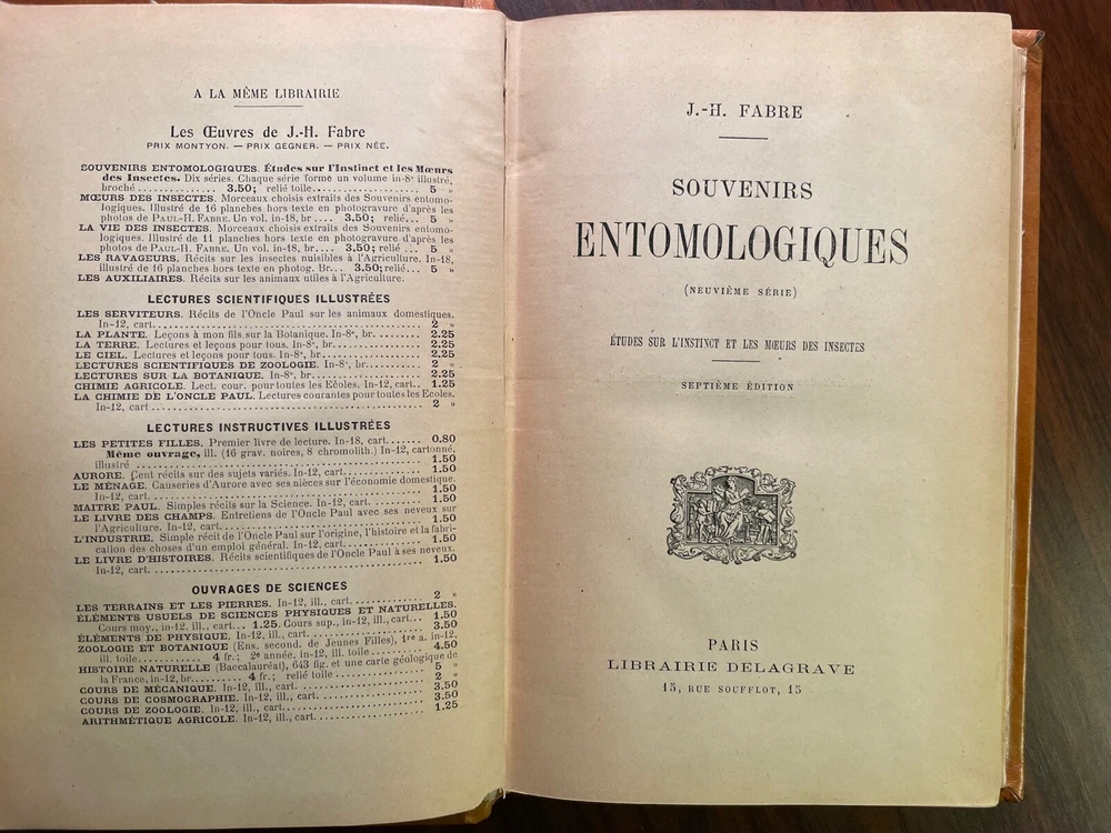 Souvenirs Entmologiques, septieme series. Etudes sur l'instinct et les moeurs des insectes. By J. H. Fabre. Published by Librarie Delagrave, Paris. Undated, but circa 1921. Text in French. Book Dimensions: 9"x6" inches. Rebound in full leather with bright gold gilt to spine. New endpapers. Some rubbing to head and tail of spine and covers. Textblock starting to separate between ffep and 1/2 title page but still holding. Pages slightly age toned but otherwise clean and tight to binding. A beautifully rebound copy of this classic work on the behaviour of insects by famous French entomologist J. H. Fabre. Scarce. Fine binding. Entomology. Insectology. Science. Foreign Language.