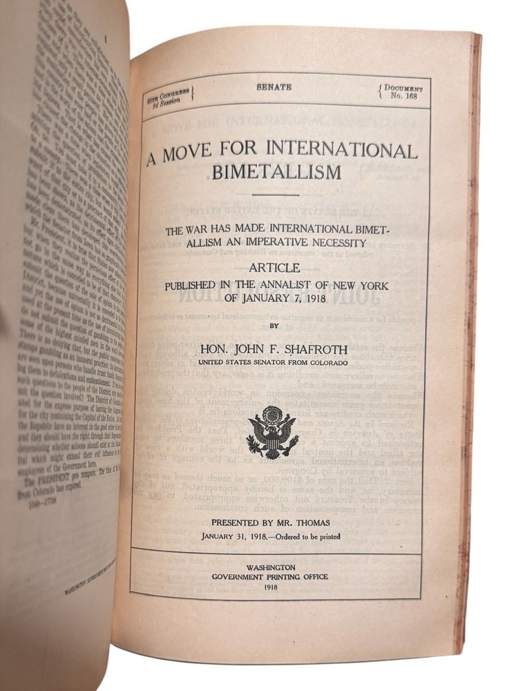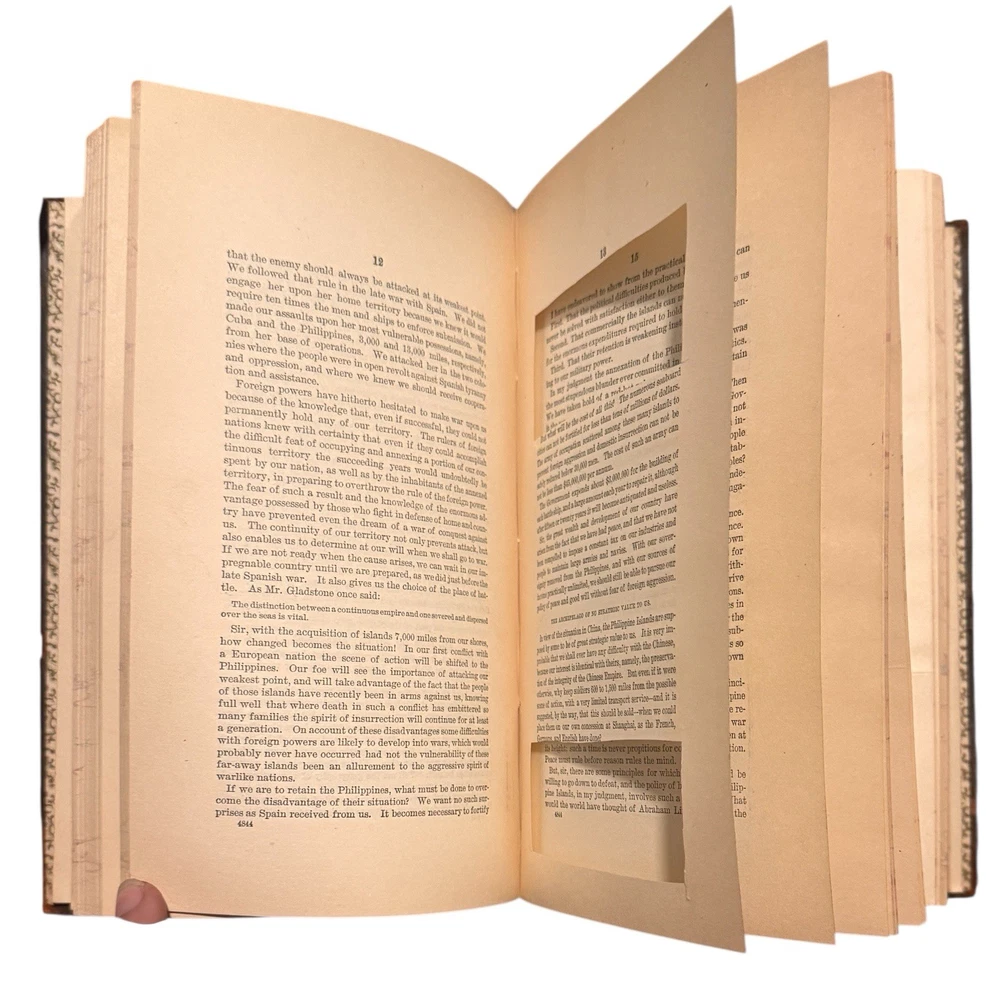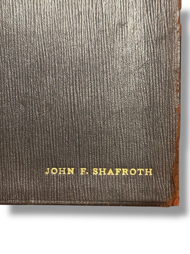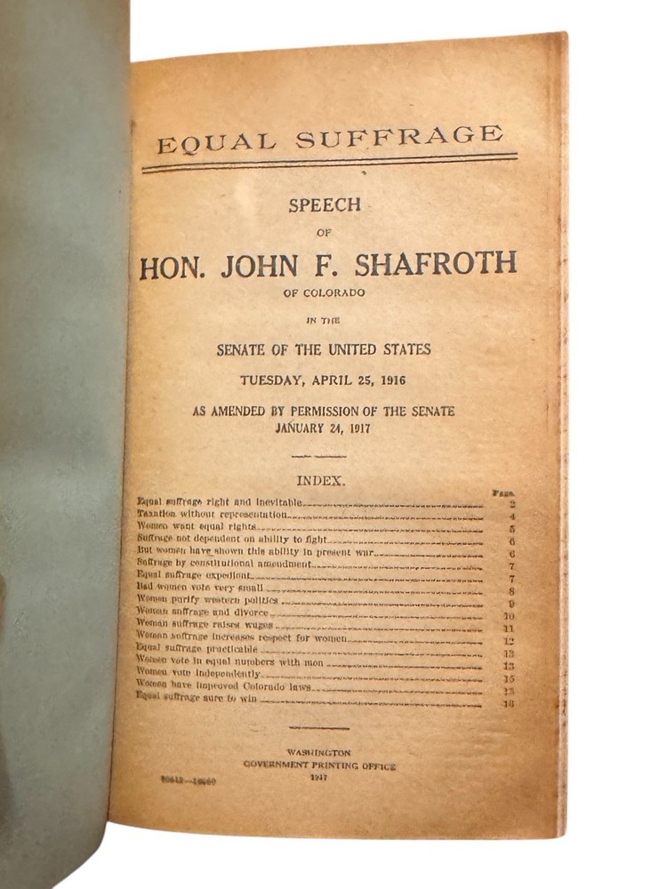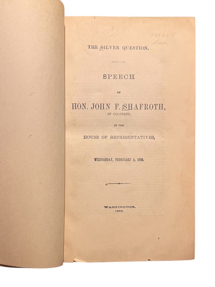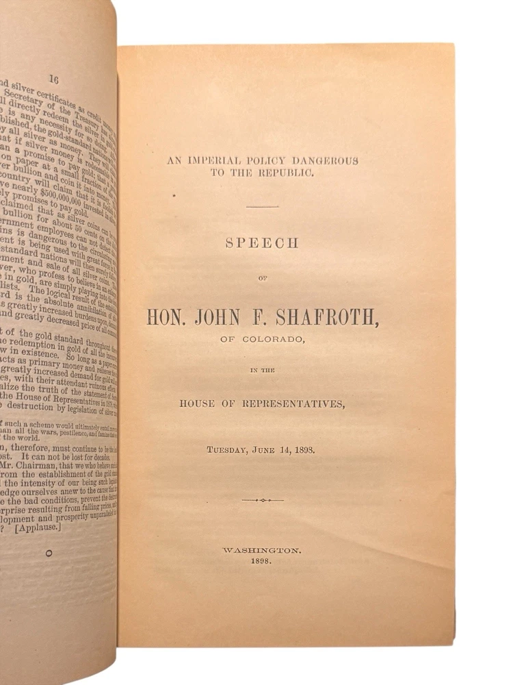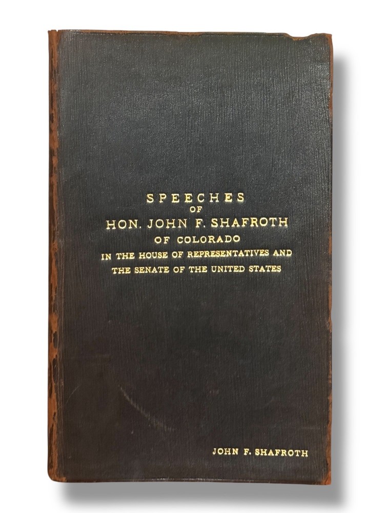 Shafroth, John F. Speeches of Hon. John F. Shafroth of Colorado In the House of Representatives and the Senate of the United States. Washington: GPO. 1896-1917. Hon. Shafroth’s personal copy of his bound speeches before Congress. Approx 32 parts, esch being a speech by Hon. Shafroth delivered in the House or Senate. Most speeches are between 8 and 16pp (pagination non-continuous). Discusses issues from territorial expansion and imperialism in the Philippines to the gold standard and women’s suffrage in the United States. Very good condition : pp13-14 of Part II: Philippine Tariff - Imperial Policy (Tuesday, December 17, 1901), has two paragraphs neatly excised from the page; elsewhere the book shows no signs of being tampered with, pages clean. 8vo, flexible leather wrappers, titling stamped in gilt. Shafroth’s name in full lower right corner of cover. All edges marble. Binding good. Slight curl of front cover away from text block. No markings or library stamps. Provenance: Washington D.C. private collection.