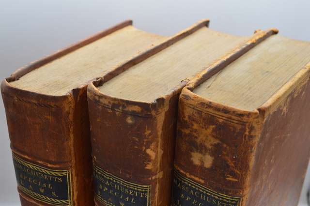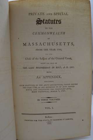 eBay template Private and Special Statutes of the Commonwealth of Massachusetts: From the Year 1780, to the Close of the Session of the General Court, Begun and Held on the Last Wednesday in May, A. D. 1805. With an Appendix 3 Vol. Set by Commonwealth of Massachusetts Printed for the State by Manning and Loring; Boston, 1805. Hardcover. Three Volume Set slightly mismatched. A Good, full leather binding with title labels on spine, binding intact, Volume 1 and 2 are matching and Volume 3 is mismatched, moderate rubbing and scuffing to leather binding, some wear to board corners and spine edges, rubbing along board edges, age toning to a bit pulpy pages, some scattered foxing to pastedowns/endpapers and front/back matters, moisture stains top text block edge Volume 1 and 2 and slightly to top page margins, bowed boards of Volume 3, previous owner embossed stamp and crease top page corner title page and page 3 of Volume 3, some loss bottom spine edge Volume 2, discoloration/sunning to spines. Overall, in a good and clean antiquarian condition. 8vo[octavo or approx. 6 x 9 inches]. (Vol.1) 540pp., (Vol.2) 537pp., (Vol.3) 622pp., appendix, indexed. We pack securely and ship daily with delivery confirmation on every book. The picture on the listing page is of the actual book for sale. Additional Scan(s) are available for any item, please inquire. 111111112160 SHIPPING: Domestic Media Mail is an additional $5.00. Domestic Priority S&H is an additional $10.00 per item. All domestic orders are moisture protected and shipped in either a well padded box or depending on price/size of book it will be cardboard sleeved & shipped in a well padded bubble envelope. The handling includes Delivery Confirmation on every domestic order which will be emailed upon processing. We always combine on shipping on multiple orders. Foreign shipments are at cost with a dollar handling. PAYMENT: Immediate payment only on this item. RETURNS: All books returnable for a full refund within 30 days after delivery for any reason. A NOTE ON GRADING: Ebay's catalog database can be faulty, please read notes section to clarify particulars on an item, if you have any questions please contact us for more information or pictures. We grade Fine, Near Fine, Very Good, Good, Fair. Any faults are always noted including remainder marks, price clipped dust jackets, and previous owner markings. If not noted then they do not exist on this book. © 1998 - 2023 Lavendier Books. All rights reserved.