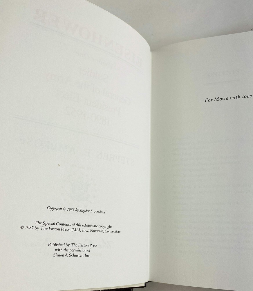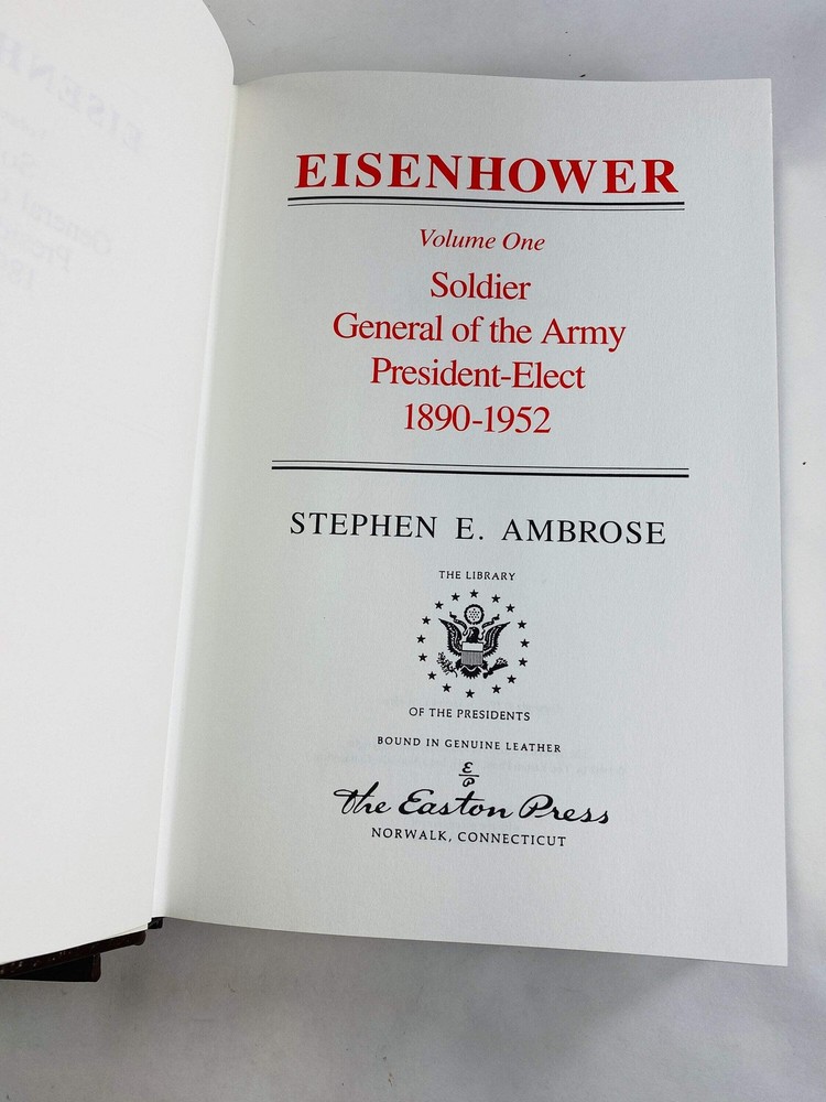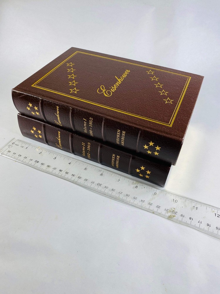 Stephen Ambrose vintage Easton Press Eisenhower book set circa 1987 US President GORGEOUS brown leather, gold History Father's Day gift CONDITION: VG- No writing inside. Leather Bound accented in 22kt gold. Printed on archival paper with gilded edges. Smyth sewing and concealed muslin joints. Bound in full leather with hubbed spines.. No highlighting or any other kind of blemishes, edges are smooth, pages are clean, binding is tight. ABOUT: Stephen A. Ambrose Eisenhower, Volume I 1890-1952, Volume II 1952-1969 Easton Press 1st Edition 1st Printing 1987 Please see all pictures and noted condition. Grading scale: - Fine: Unused, like new, without any flaws. - VG+ (Very Good +): May have been opened & read, but no defects to the book, jacket or pages. Shows some small signs of wear but no tears on binding or paper. ⭐️ - VG (Very Good): More obvious signs of use with no significant creasing or defects. - VG- (Very Good): Worn. Defects are noted. - Poor / Fair / Former Library Book: Worn book that has complete text pages (including those with maps or plates) but may lack endpapers, have loose binding. To preserve the condition of your book, place your book upright on a shelf with the spine facing outward. Books should be firmly pressed together but not wedged in tightly, which causes stress on the bindings. Shelves should not be exposed to direct sunlight and should be in a dry, insect-free location. Stephen Ambrose vintage Easton Press Eisenhower book set circa 1987 US President GORGEOUS brown leather, gold History Father's Day gift CONDITION: VG- No writing inside. Leather Bound accented in 22kt gold. Printed on archival paper with gilded edges. Smyth sewing and concealed muslin joints. Bound in full leather with hubbed spines.. No highlighting or any other kind of blemishes, edges are smooth, pages are clean, binding is tight. ABOUT: Stephen A. Ambrose Eisenhower, Volume I 1890-1952, Volume II 1952-1969 Easton Press 1st Edition 1st Printing 1987 Please see all pictures and noted condition. Grading scale: - Fine: Unuséd, like new, without any flaws. - VG+ (Very Good +): May have been opened & read, but no defects to the book, jacket or pages. Shows some small signs of wear but no tears on binding or paper. ⭐️ - VG (Very Good): More obvious signs of use with no significant creasing or defects. - VG- (Very Good): Worn. Defects are noted. - Poor / Fair / Former Library Book: Worn book that has complete text pages (including those with maps or plates) but may lack endpapers, have loose binding. To preserve the condition of your book, place your book upright on a shelf with the spine facing outward. Books should be firmly pressed together but not wedged in tightly, which causes stress on the bindings. Shelves should not be exposed to direct sunlight and should be in a dry, insect-free location. × × × × × × × × Buy now and save! Tell a friend Visit store Watch now Postage info Click the Postage tab above the listing description for more info Click the Postage tab above the listing description for more info! Additional delivery notes PICK UP OPTION Sorry, our items are NOT available for pick-up. PAYING VIA PAYPAL We accept PayPal on our all our items so you can shop with confidence. Simple choose the PayPal option when proceeding through the checkout. Additional Information No additional information at this time Ask seller a question You might also like Bronze Curly Haired Barefoot Boy Reading a Book outside vintage bookends circa 1 Highly detailed vintage carved stone Buddhist bookends statues authentic gypsum Through the Looking-Glass Lewis Carroll FIRST Edition vintage book circa 1890 16 Lewis Carroll Alice's Adventures in Wonderland & Through the Looking Glass vinta Contact To contact our Customer Service Team, simply click the button here and our Customer Service team will be happy to assist. Ask seller a question © Vintage Bookworms Postage Click the Postage tab above the listing description for more info Payment Accepted Payment Methods PayPal Returns Returns are accepted Items must be returned within 30 days of the auction ending Buyer will pay for return shipping. eBay integration by