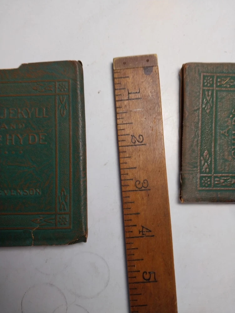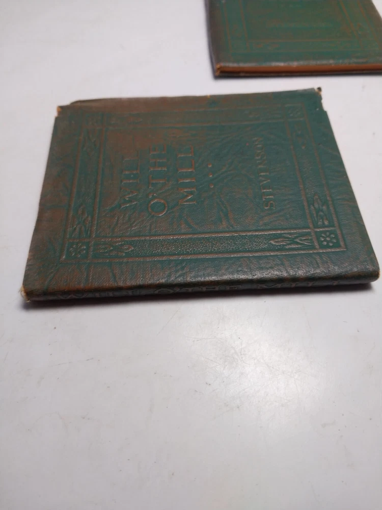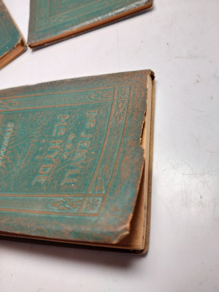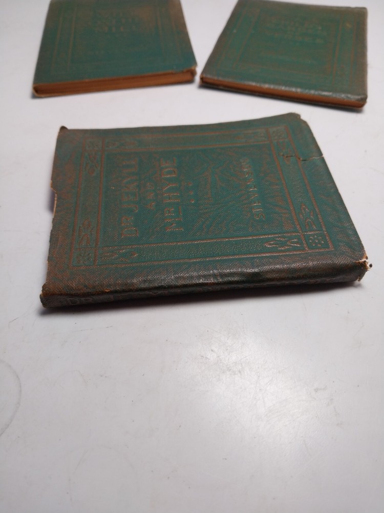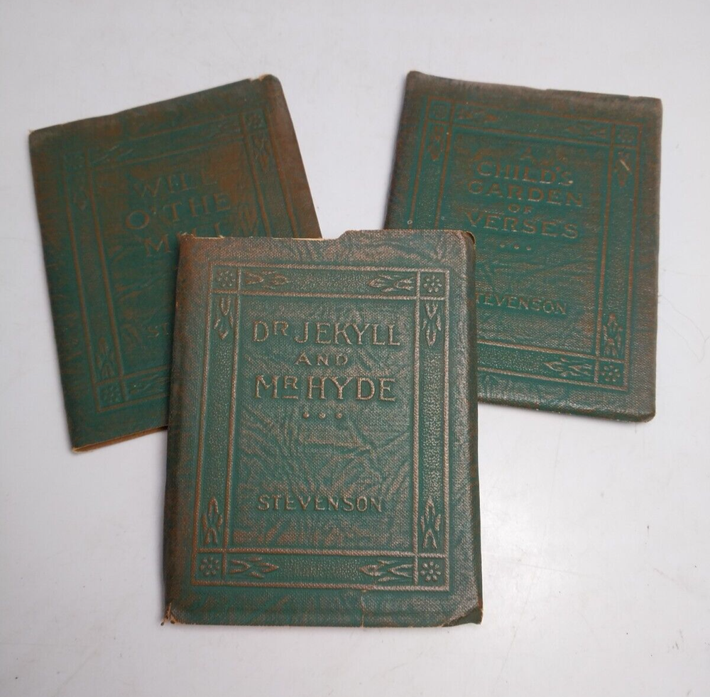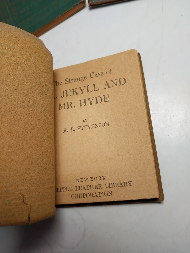 Stevenson Dr Jekyll Mr Hyde Childs Garden Verses Little Leather Library Book Set Book set measures approximately 3" x 4" and is in good used condition with some signs of age, use, and wear; age related toning to pages, damage to J &H cover, please see photographs for condition details.