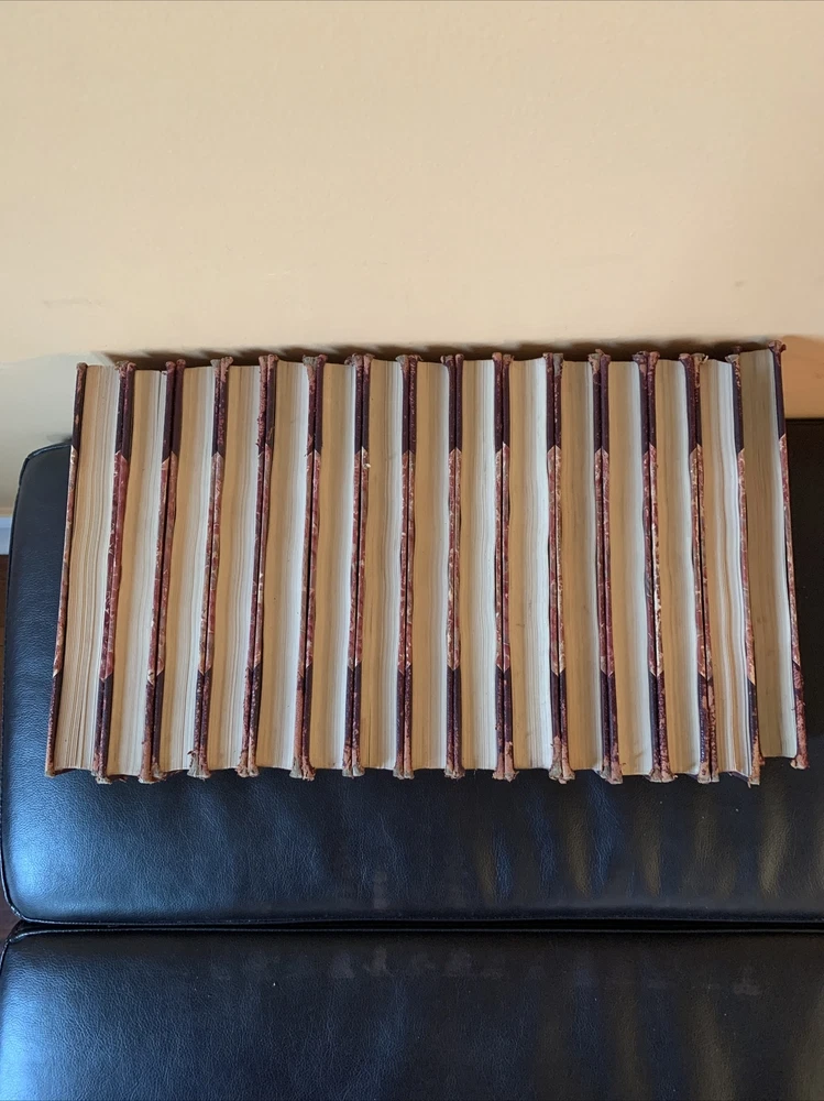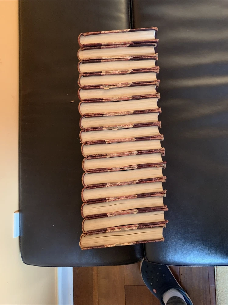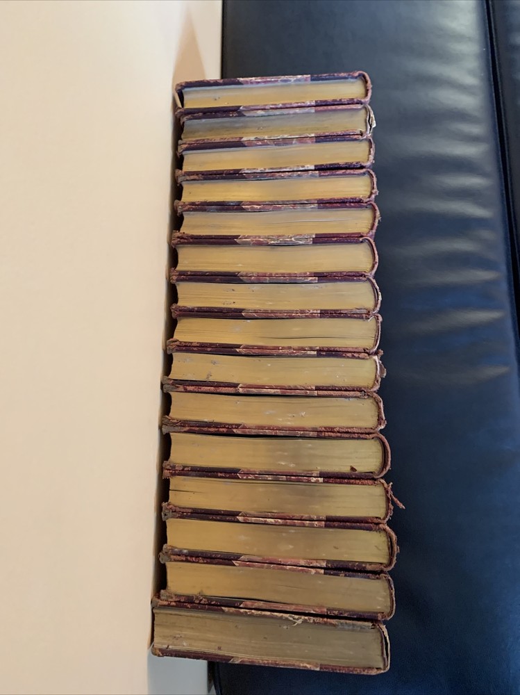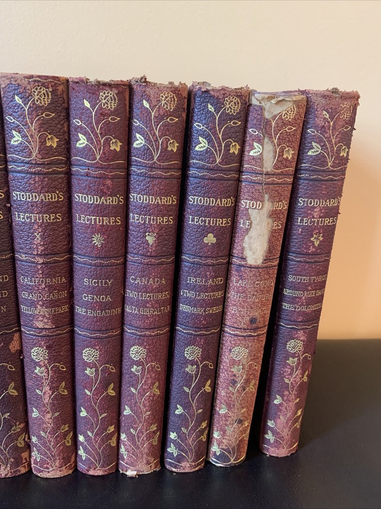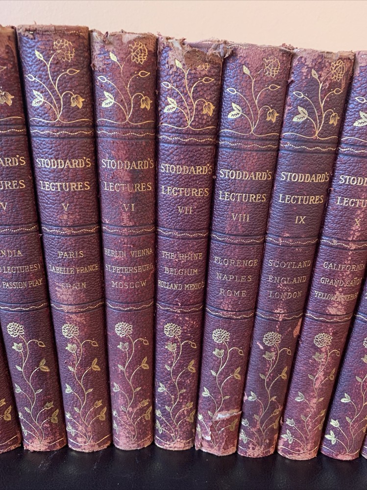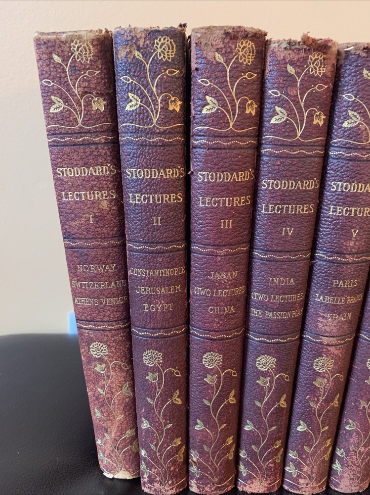 Stoddard’s Lectures 1897-1905 Complete 15 Volumes Set(10 Vol +5 Suppl) Leather HC. A rare 15 volumes set( a complete 10 volumes set plus 5 volumes supplementary). Bindings are strong and secure with the pages clean and crisp. The top edges of the pages are gilded but with some tiny small occasional stains on top. Straight spines with bright gilt lettering, however there are some chipping, peeling of the spines ends. Collector’s name on most of the volumes inside cover page, this collection comes from a smoke free pet free environment, the books are not musty. The books are measuring about 9x6. Please check the pictures.