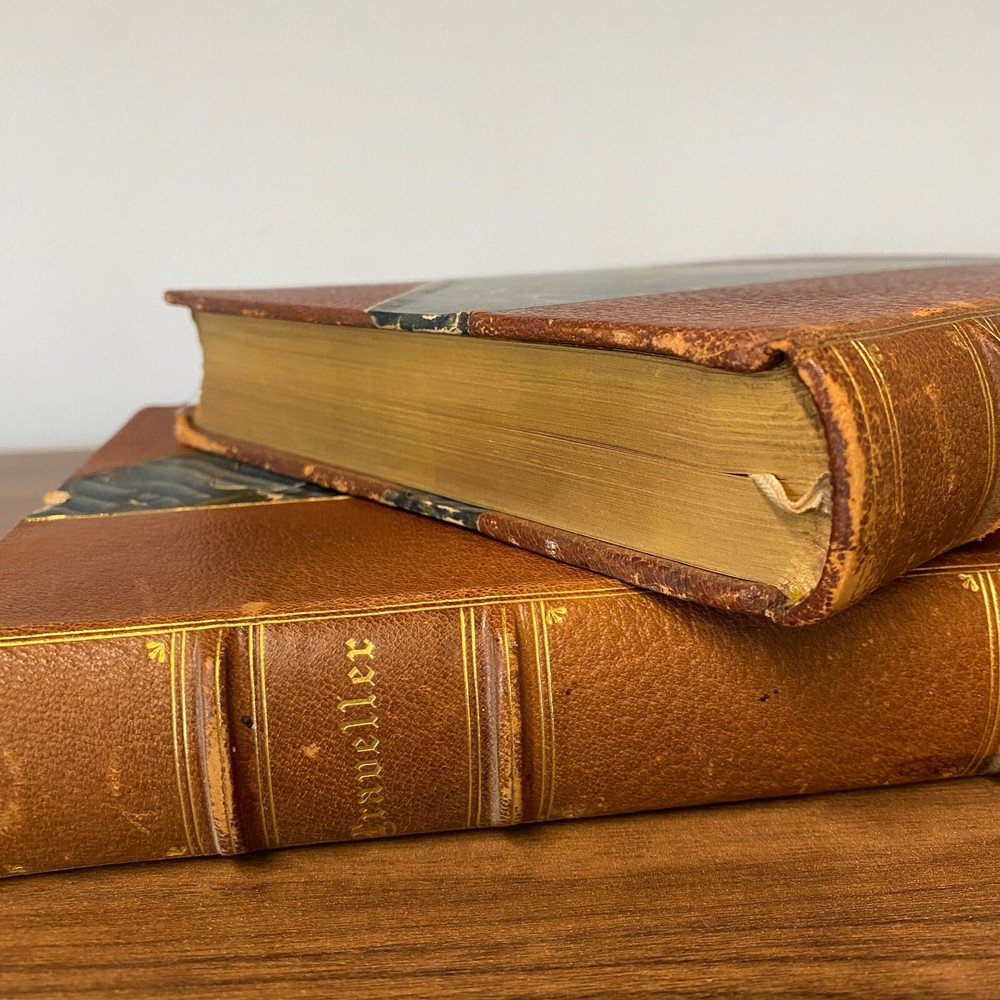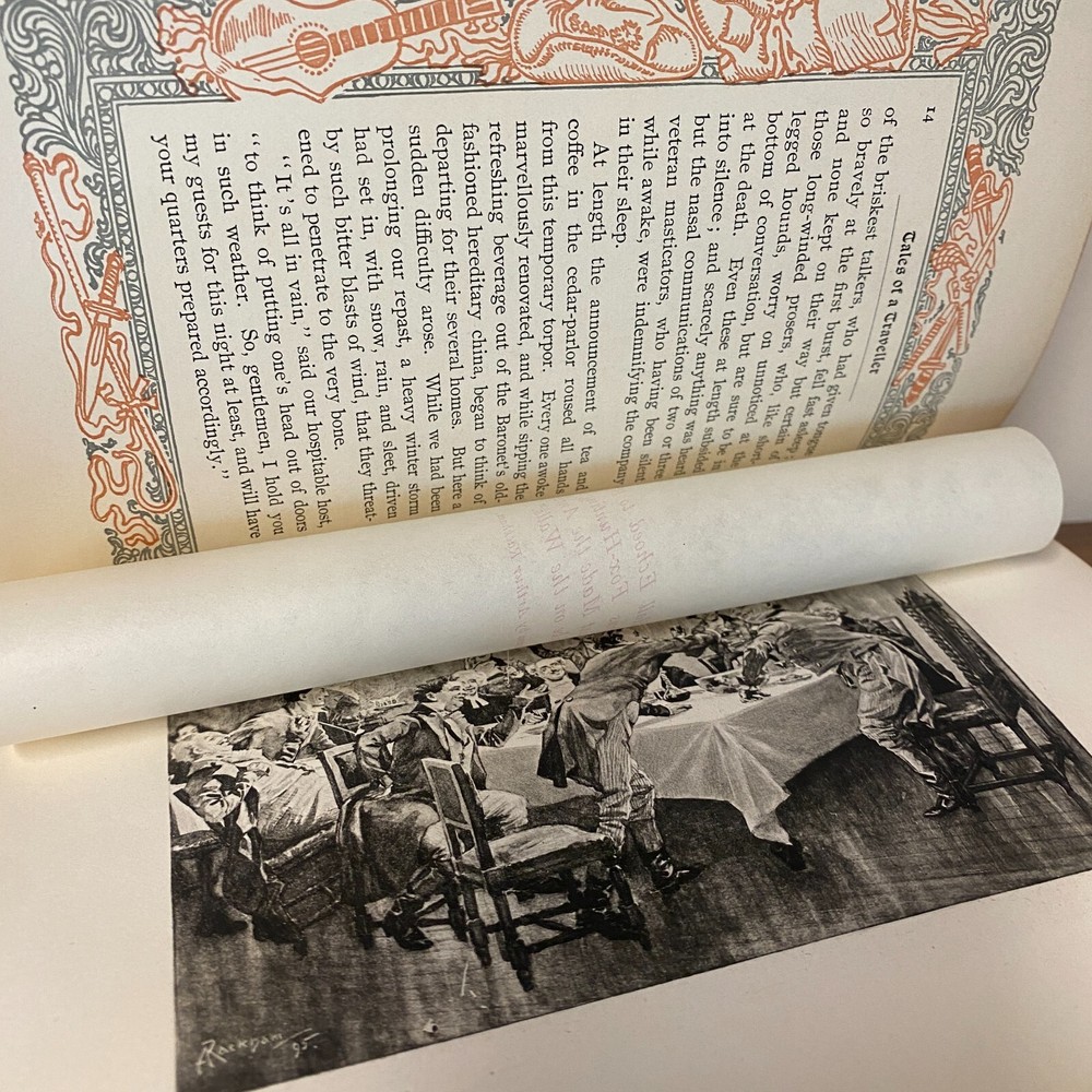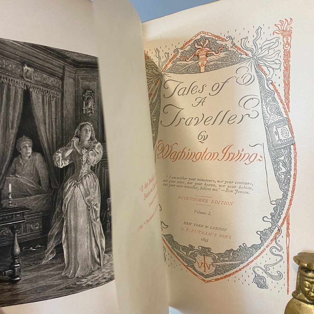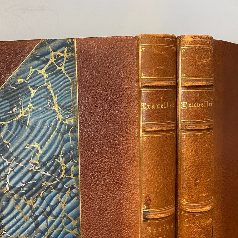Tales of a Traveller By Washington Irving First edition thus Complete in two volumes Three-quarter leather bindings with marbled boards, raised bands, gilt rules and spine details Illustrated with b/w plates and, on each page, a decorative border Size: 8vo Condition: Very good. Vol. 1 with a small gouge on the top front cover. Both with rubbing and edge wear. Unmarked, crisp interior.