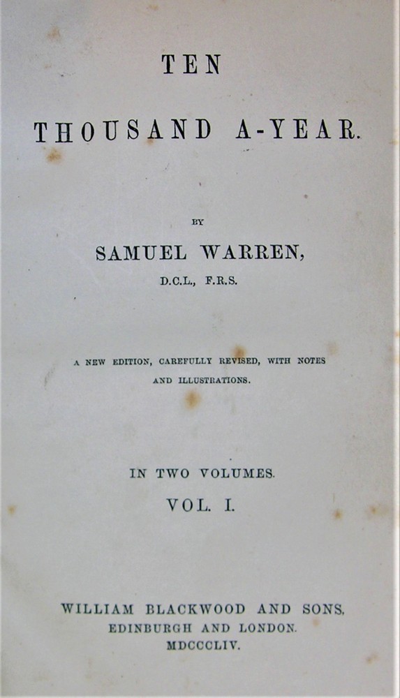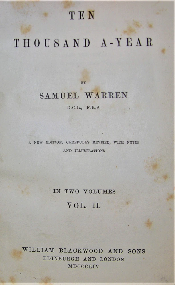 Ten Thousand a-Year is a novel written by English barrister Samuel Warren. First published in 1841, it enjoyed widespread popularity in the United States and Europe for much of the century. Ten Thousand a Year , contains social satire rivaling that of Thackeray, but written from a Tory standpoint. It went on to become one of the most popular novels of the era in both the United States and Europe. New print runs and updated editions were published regularly to the turn of the century. The story chronicles events in the life of its iconic protagonist Tittlebat Titmouse and offers in-depth detail of English common law of the time. Samuel Warren (23 May 1807 – 29 July 1877), was a Welsh barrister, novelist and MP.