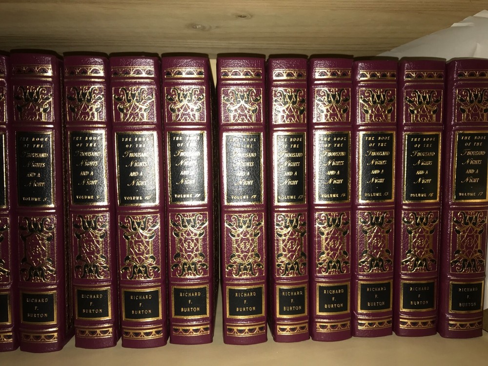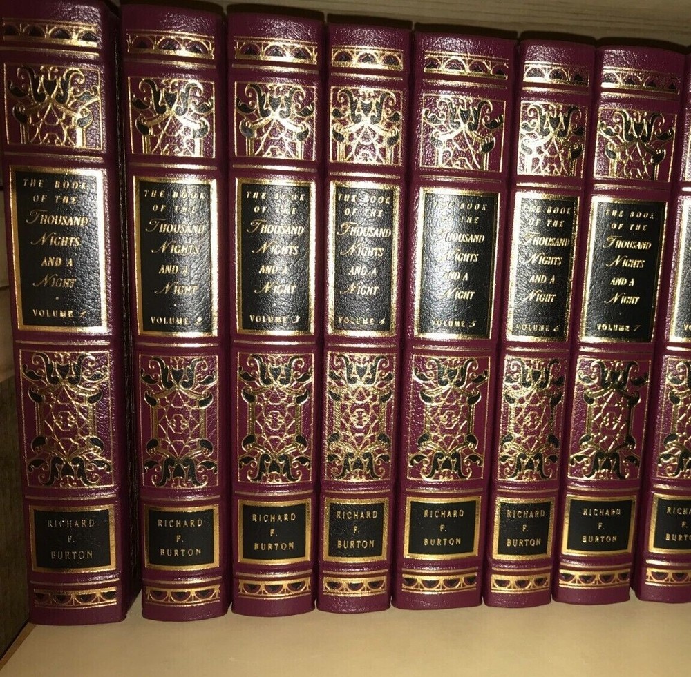 THE BOOK OF THE THOUSAND NIGHTS AND A NIGHT- EASTON PRESS, 17 VOL. SET. THIS IS THE RICHARD F. BURTON TRANSLATION OF THE COMPLETE ARABIAN NIGHTS TALES. THE VOLUMES ARE HIGH QUALITY LEATHER BOUND, ILLUSTRATED, AND ARE IN FINE, LIKE NEW CONDITION. PLEASE NOTE: ON VOLUMES 2 AND 3, THE GOLD GILT ON THE BOTTOM HALF OF THE FRONT COVER IS NOT AS BRIGHT AS ON THE REST OF THE BOOK. I CAN'T SAY IT IS FADED BECAUSE I REMEMBER NOTICING IT WHEN I FIRST BOUGHT THEM NEW, AND THE BOOKS HAVE NOT BEEN HANDLED MUCH. IT APPEARS TO BE A PRODUCTION ISSUE WITH EASTON PRESS-I HAVE NOTICED OTHER SELLERS ALSO MENTIONING THE FADE. THERE ARE NO OWNERSHIP PLATES OR MARKS ON THE VOLUMES, AND THEY COME FROM A SMOKE FREE HOME.